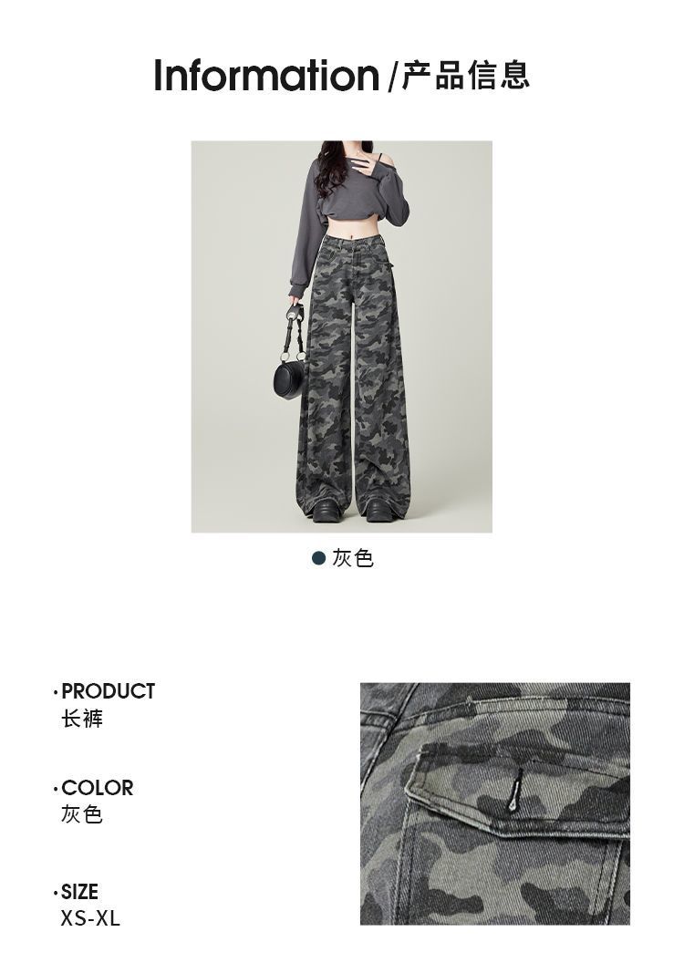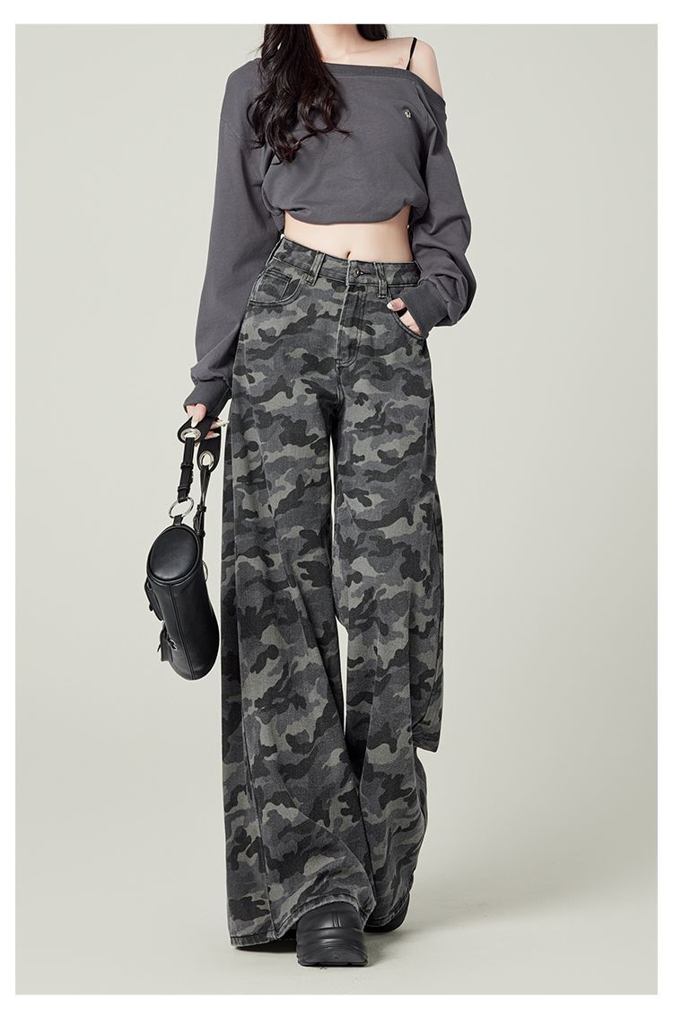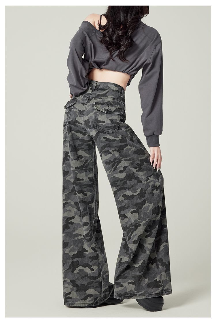 작은 미국 스타일 하이 스트리트 툴링 와이드 레그 위장 청바지 여성 레트로 높은 허리 느슨한 슬리밍 스트레이트 롱 팬츠