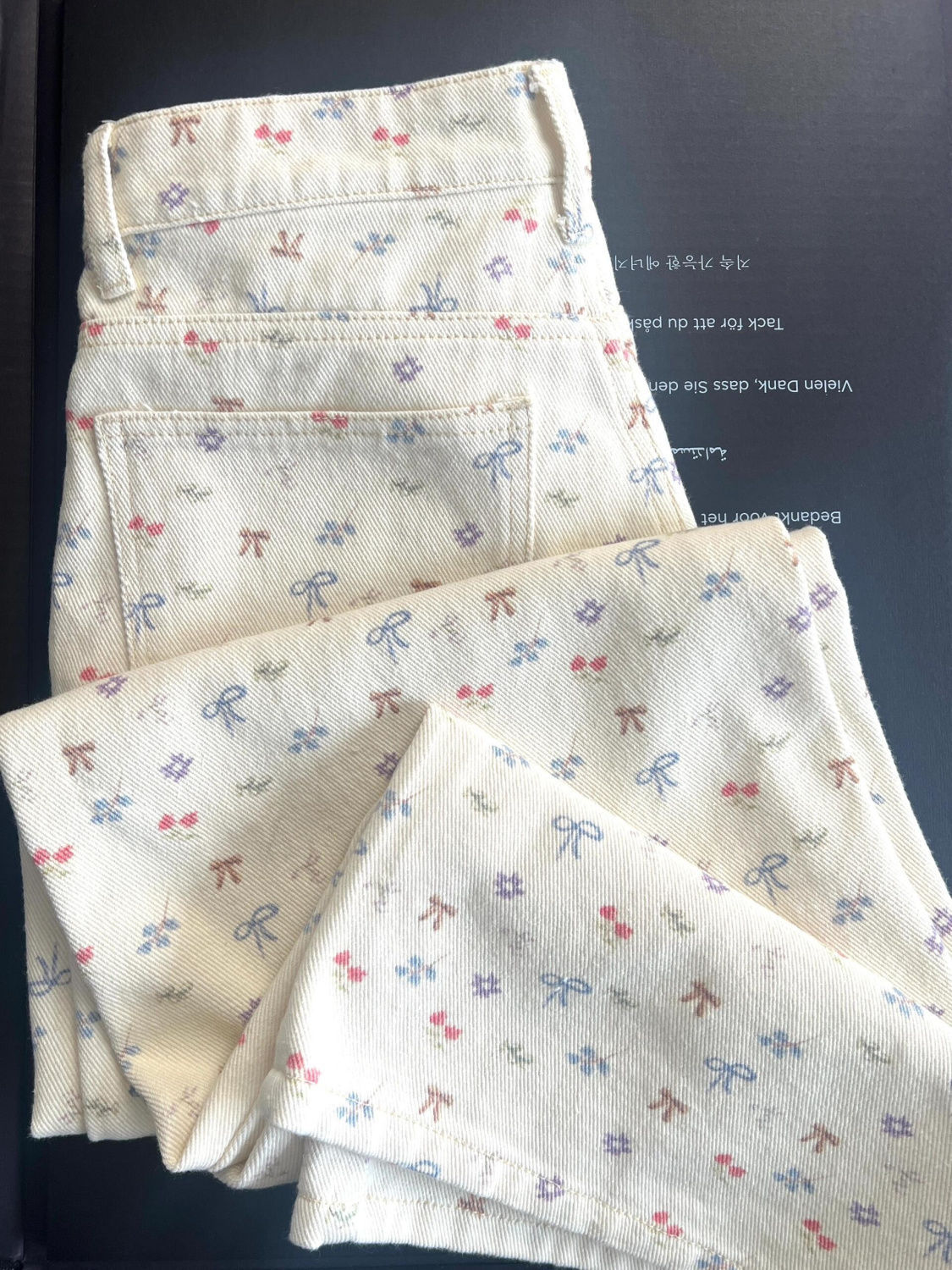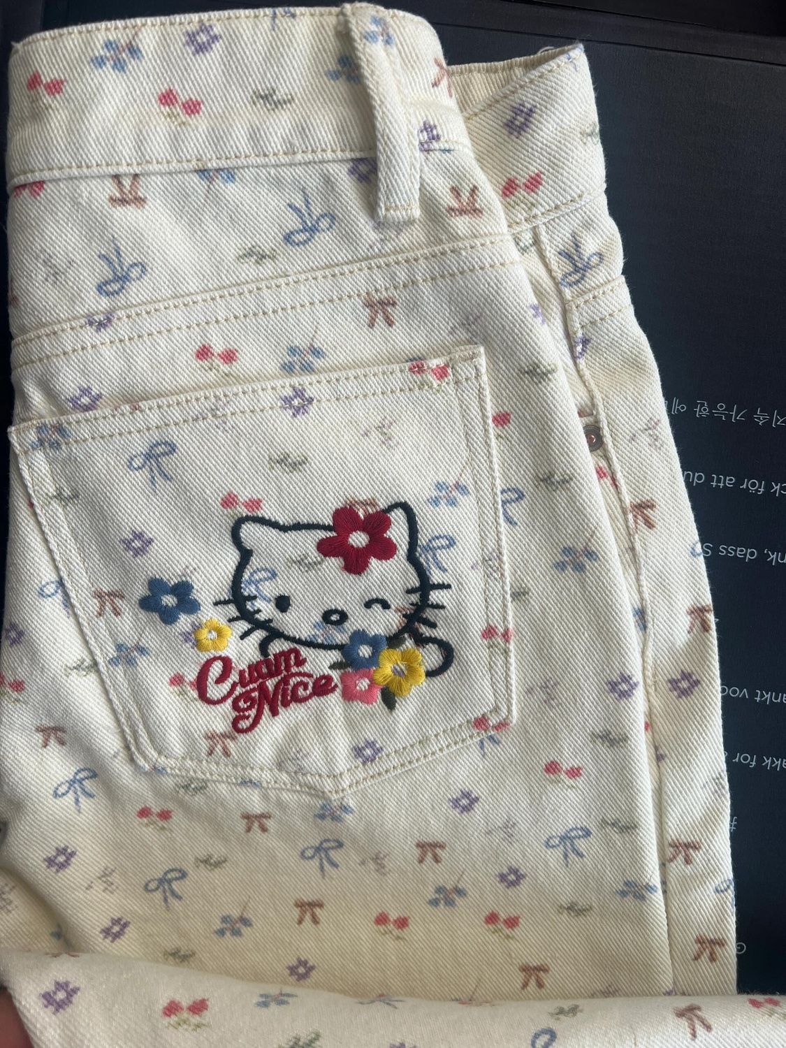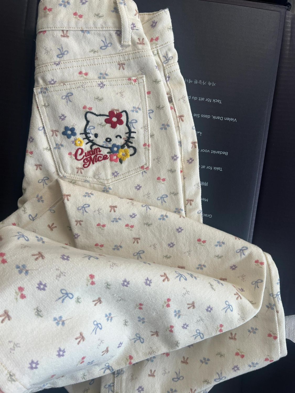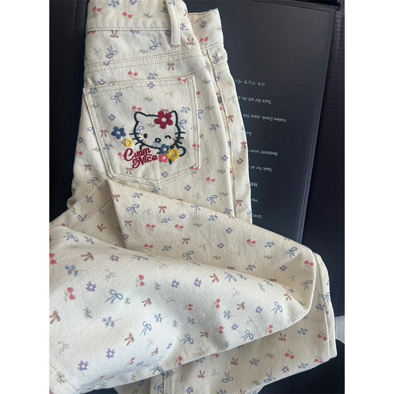 흰색 KT 고양이 수놓은 캐주얼 청바지 여성 2025 년 봄 새 복고풍 달콤한 슬림 꽃 스트레이트 바지스토어 가기