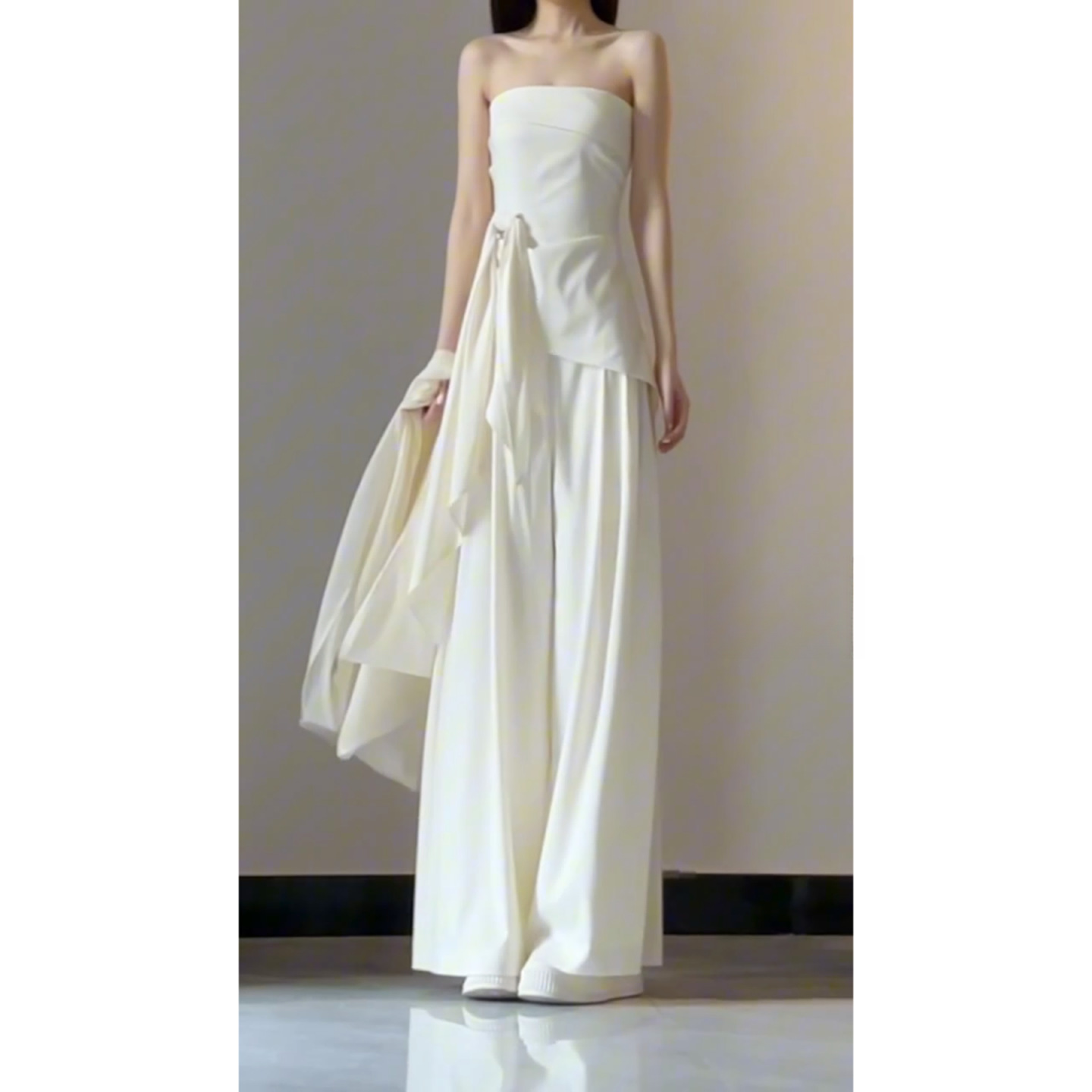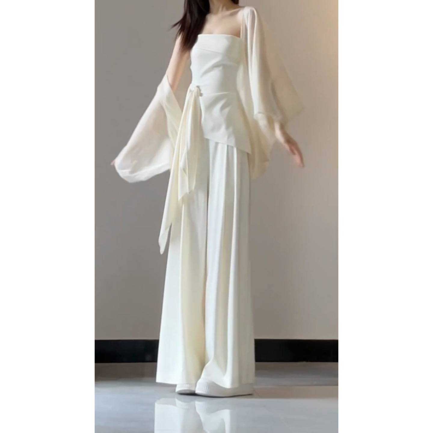 프랑스 스타일 레이스 업 스트랩리스 민소매 탑 캐주얼 셔츠 스트레이트 긴 바지 세트 여성 봄과 여름