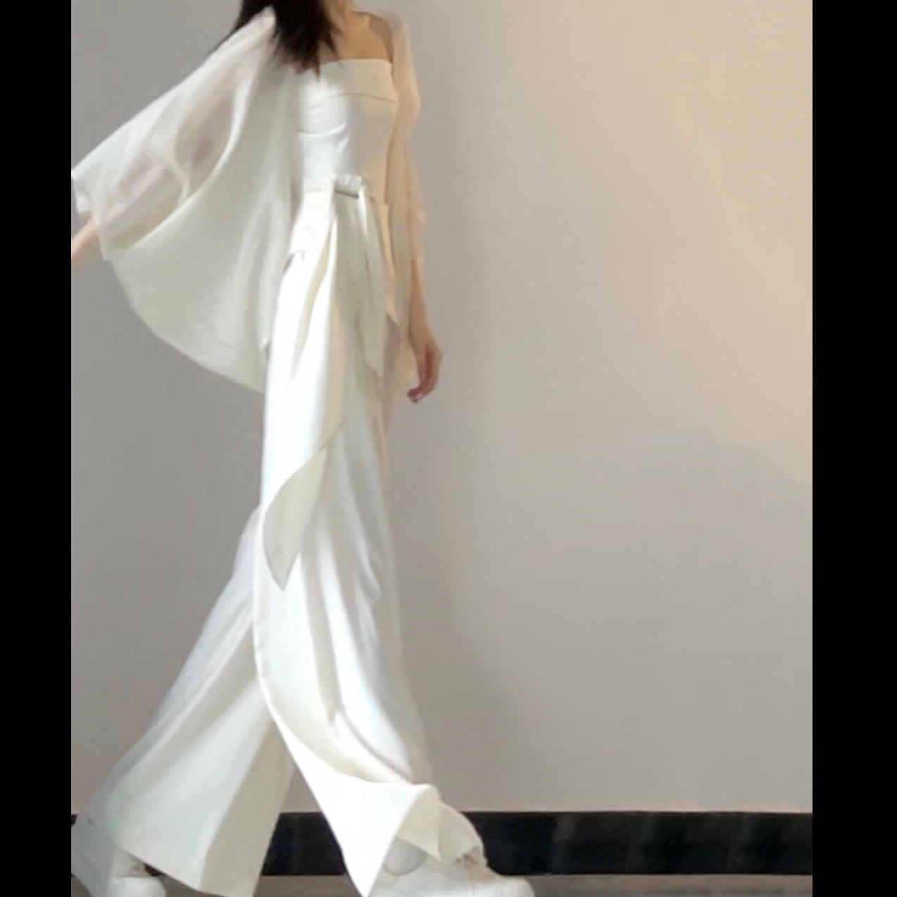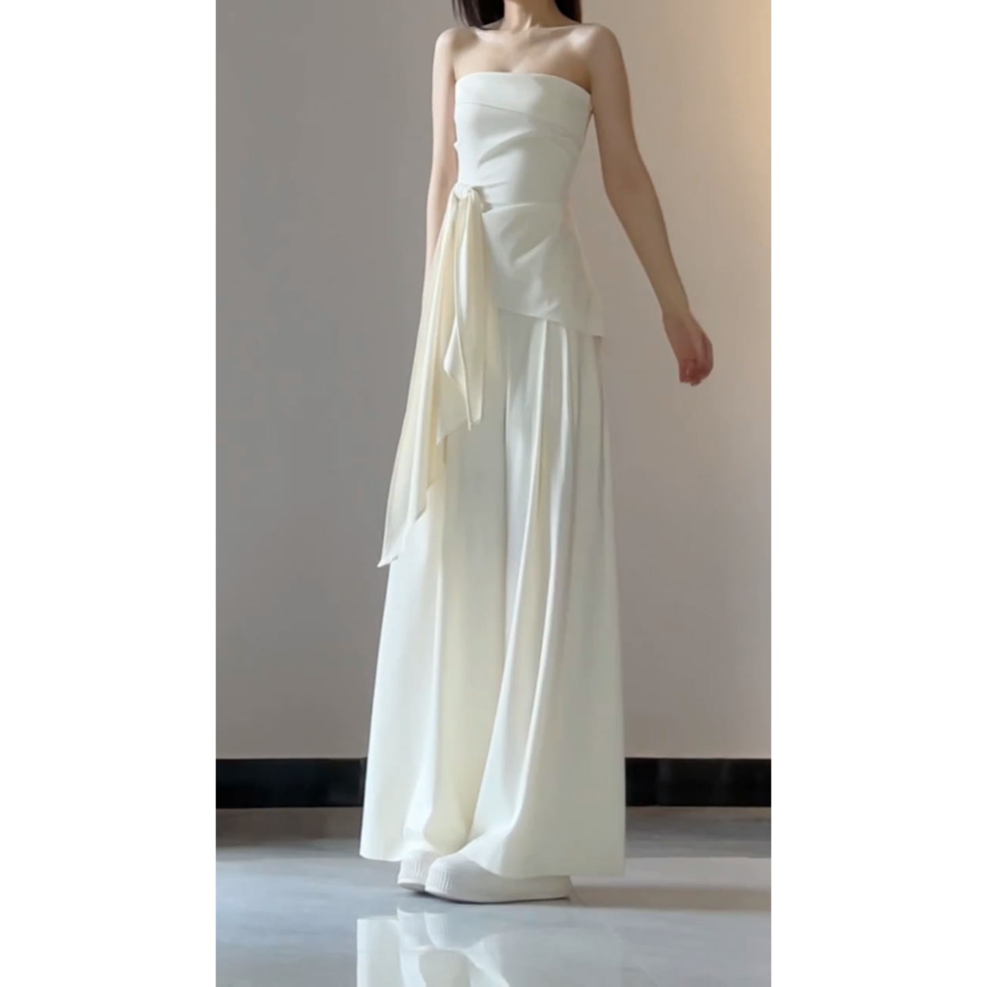프랑스 스타일 레이스 업 스트랩리스 민소매 탑 캐주얼 셔츠 스트레이트 긴 바지 세트 여성 봄과 여름스토어 가기