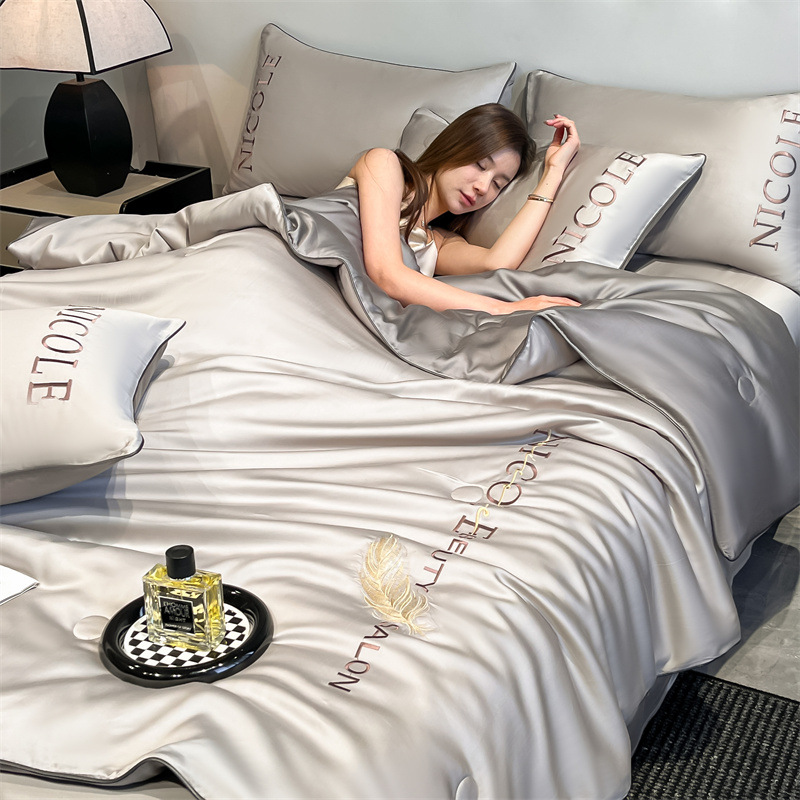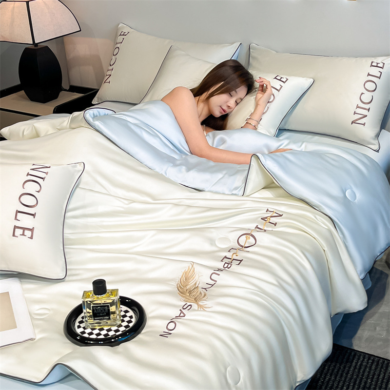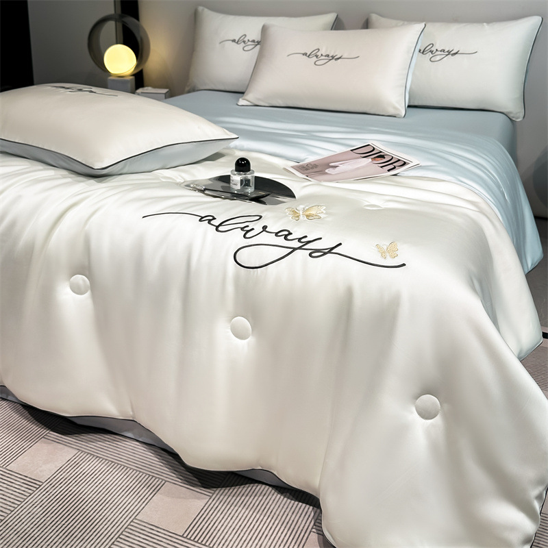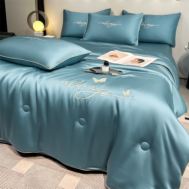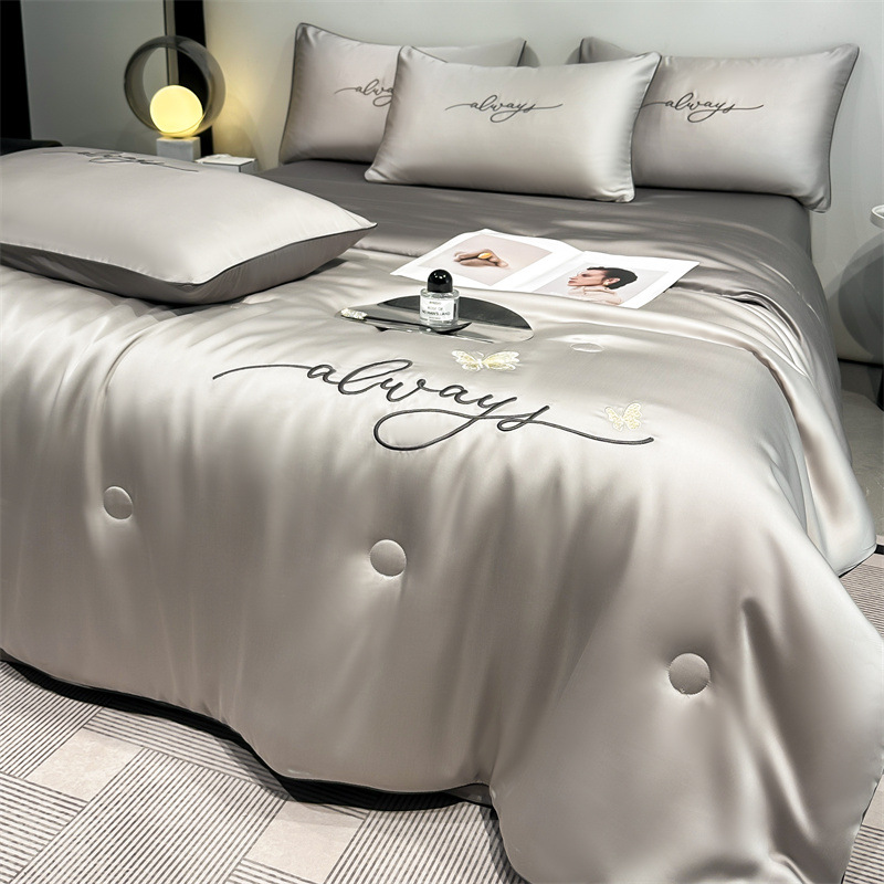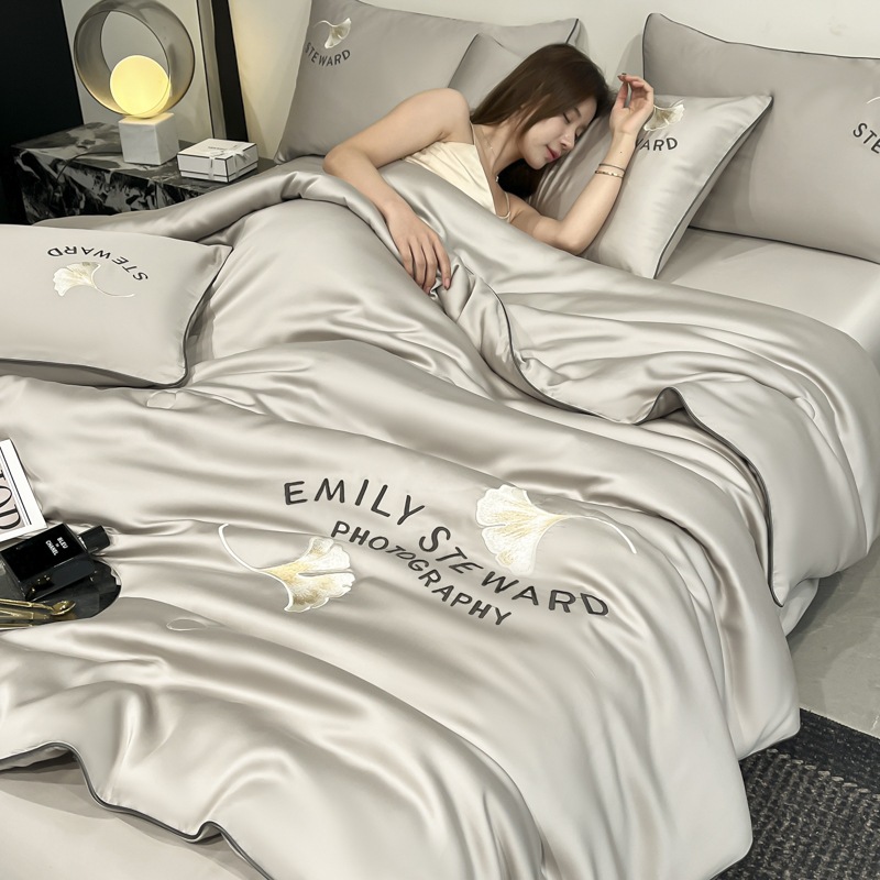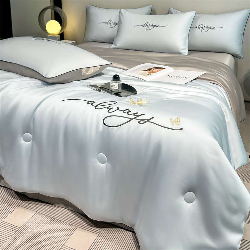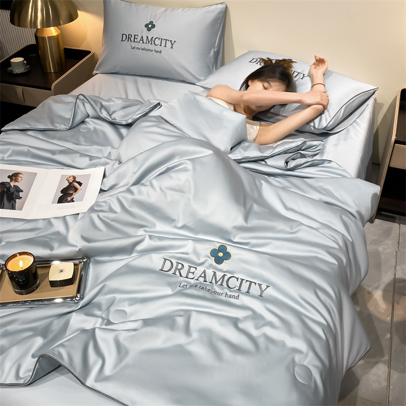 워시드 실크 자수 여름 이불 4종 세트, 가볍고 고급스럽고 시원한 실크 얇은 이불, 세탁기로 세탁 가능한 텐셀 에어컨 이불, 여름 시원한 이불