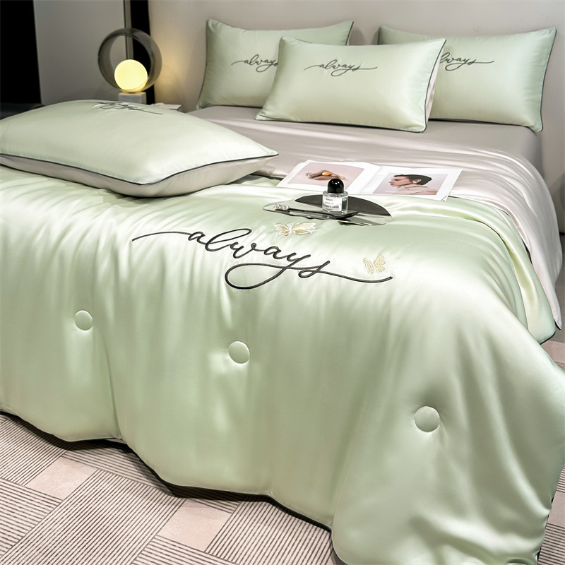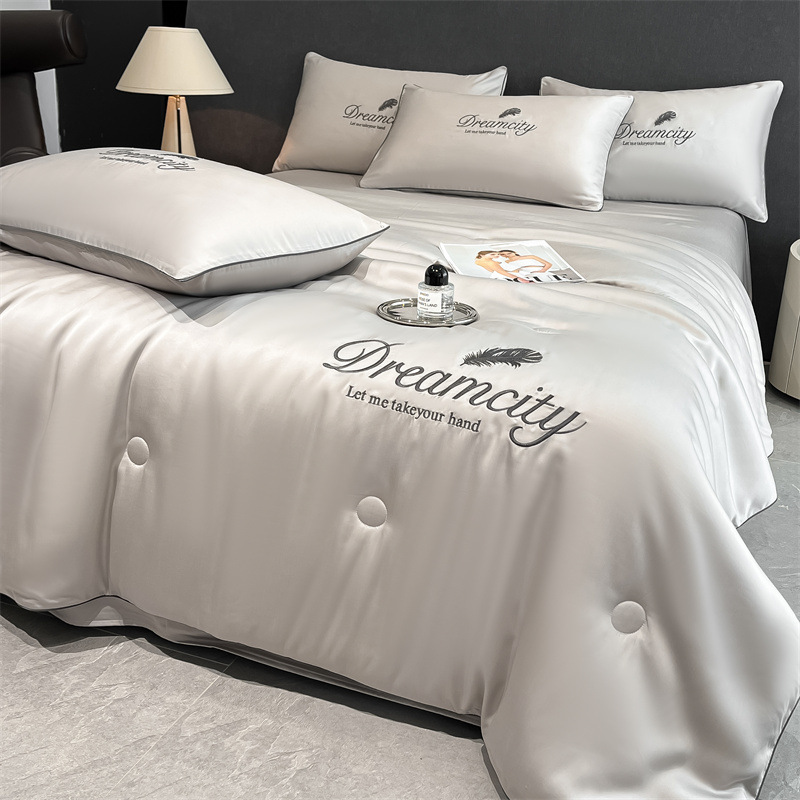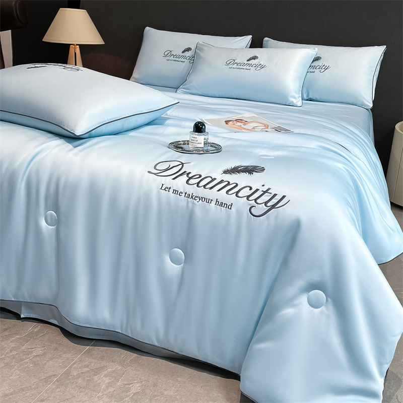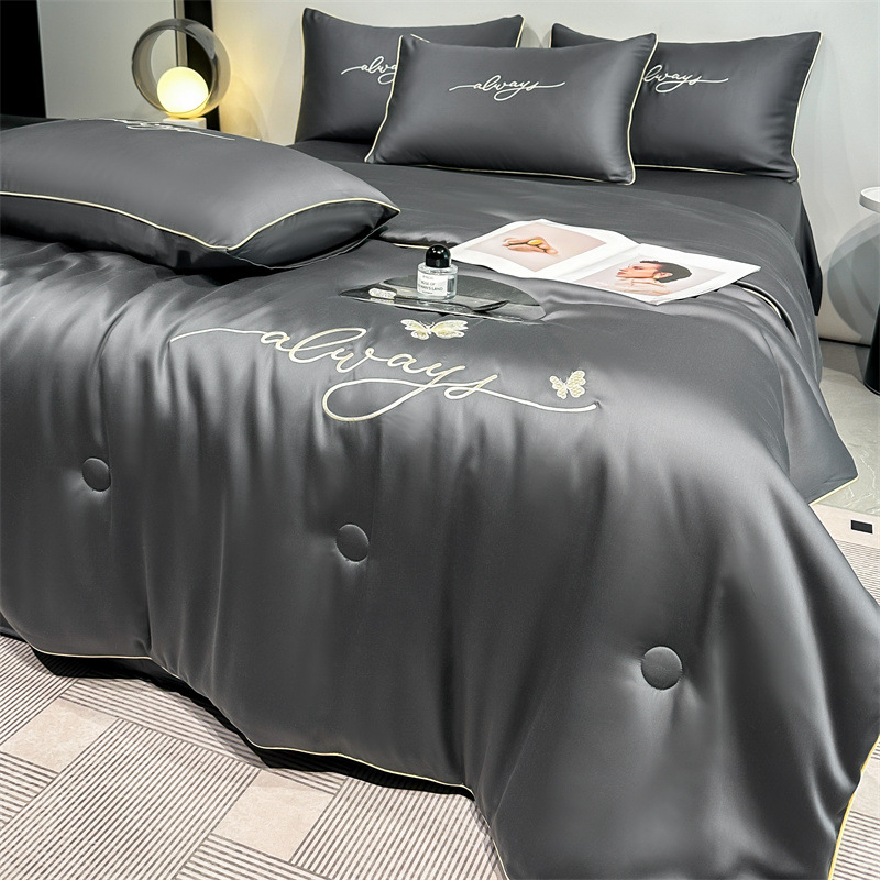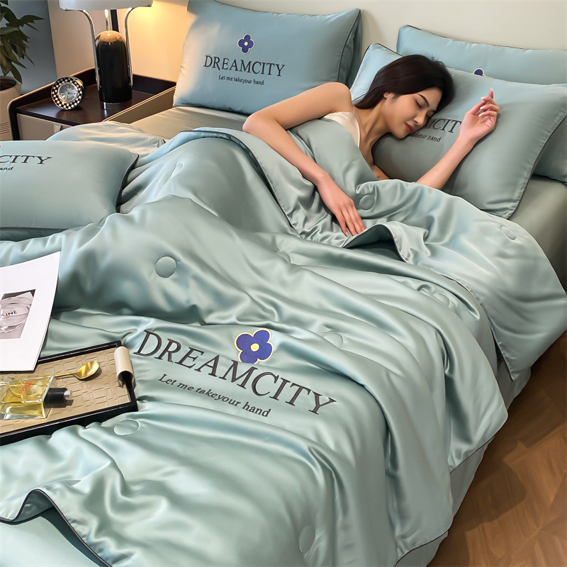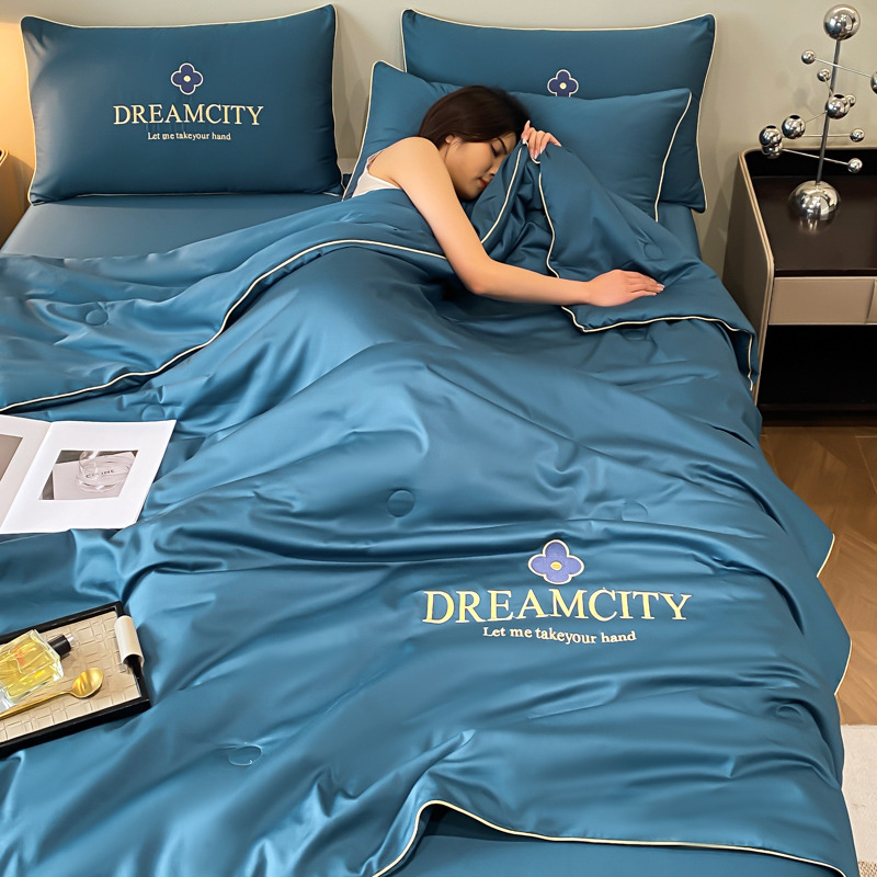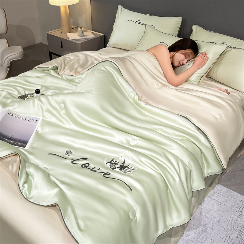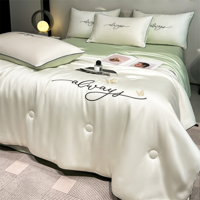 워시드 실크 자수 여름 이불 4종 세트, 가볍고 고급스럽고 시원한 실크 얇은 이불, 세탁기로 세탁 가능한 텐셀 에어컨 이불, 여름 시원한 이불