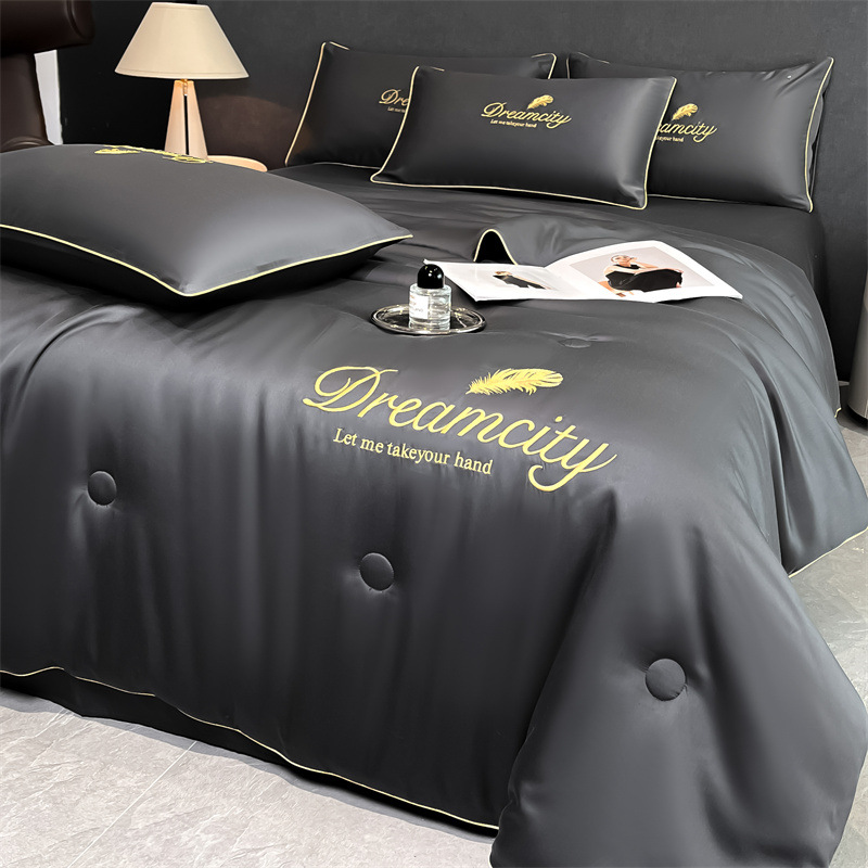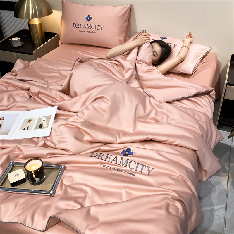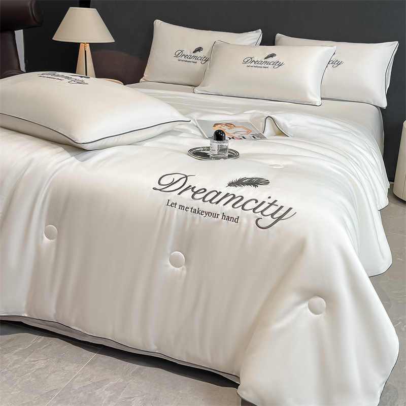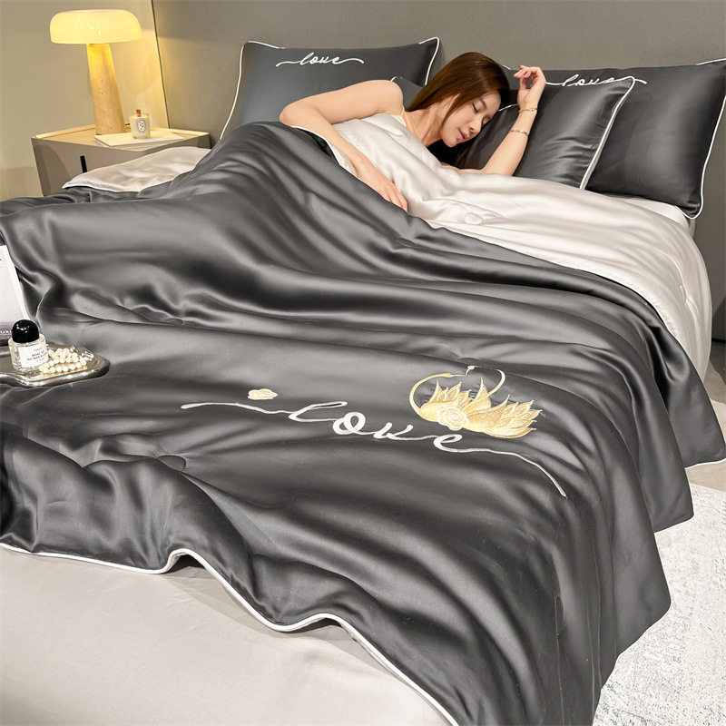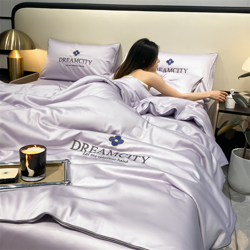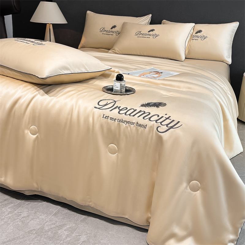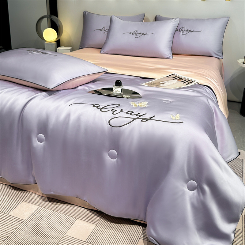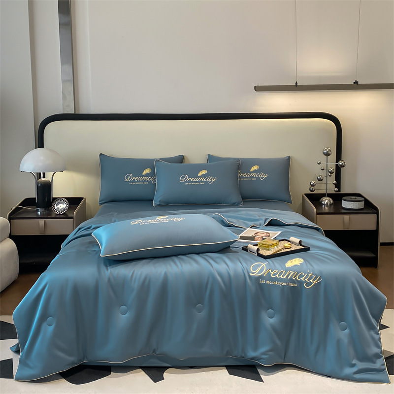 워시드 실크 자수 여름 이불 4종 세트, 가볍고 고급스럽고 시원한 실크 얇은 이불, 세탁기로 세탁 가능한 텐셀 에어컨 이불, 여름 시원한 이불