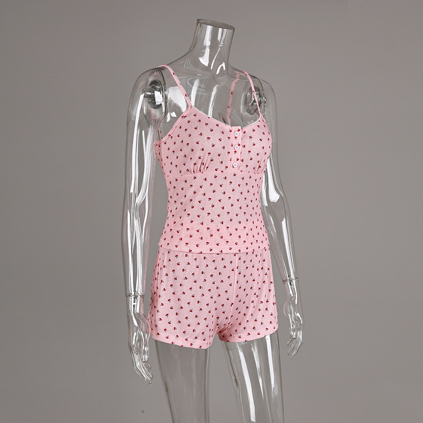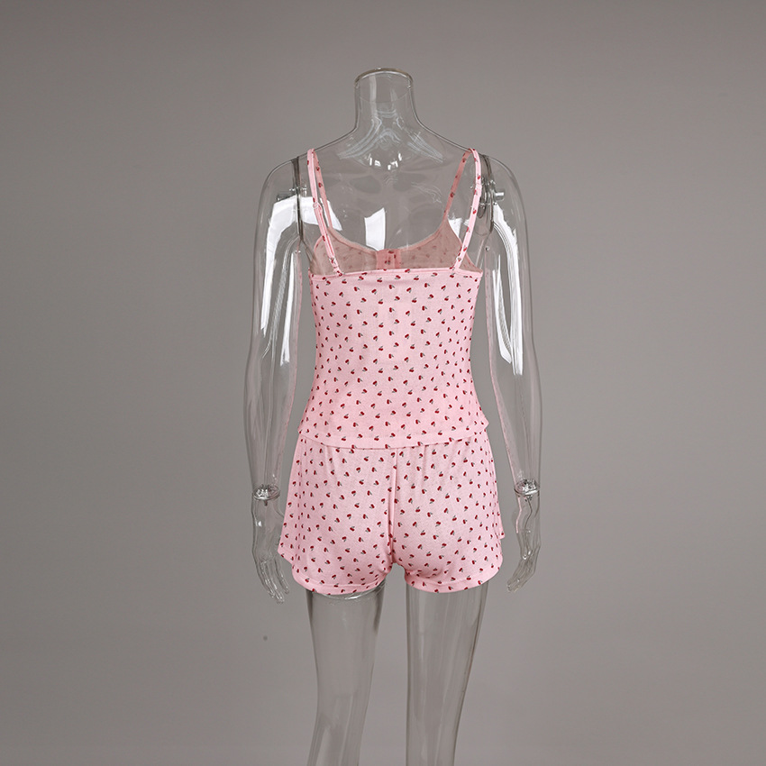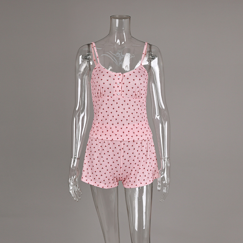 유럽과 미국의 국경 간 2025 여름 시원하고 통기성이 뛰어난 서스펜더 반바지 잠옷 세트 니트 자카드 프린트 여성 홈웨어