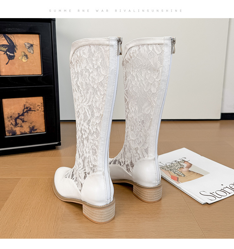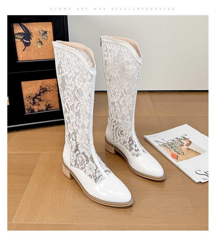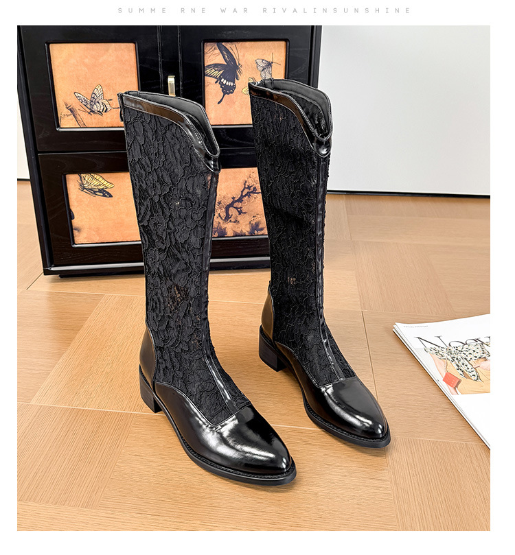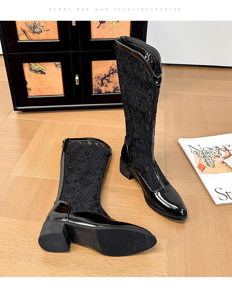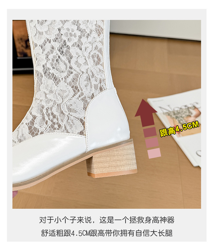 중공 레이스 하이 부츠 여성 2025 프랑스 뉴 스타일 내부 높이 증가 뾰족한 통기성 두꺼운 힐 패션 기사 부츠 여성스토어 가기