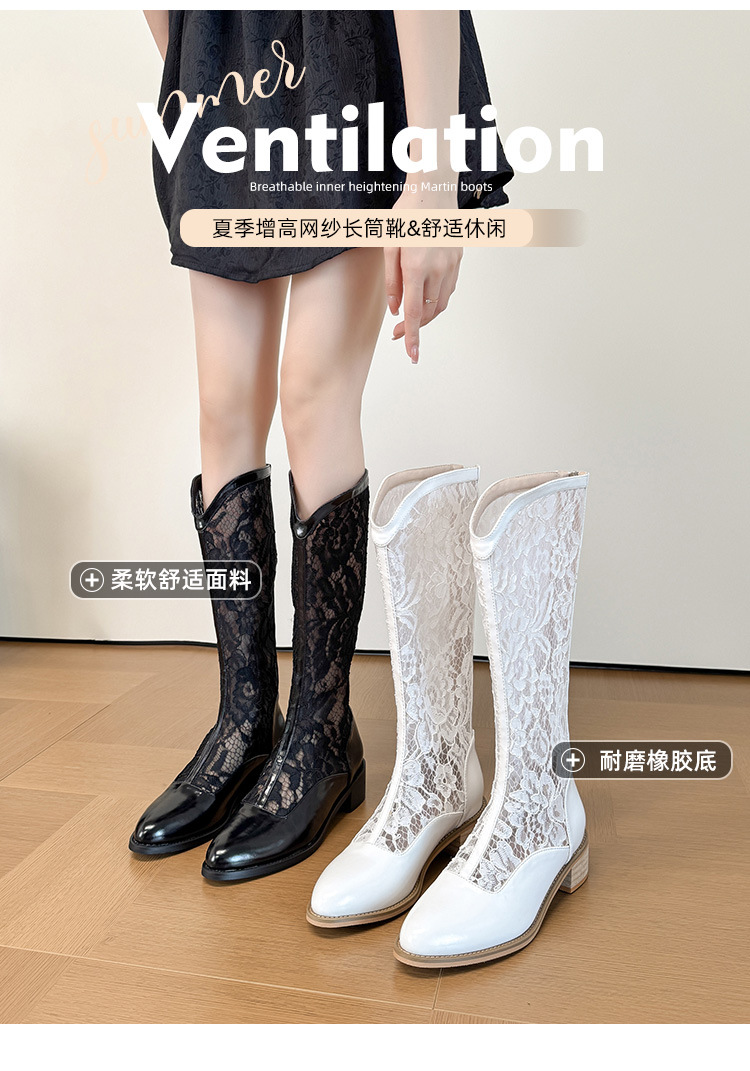 중공 레이스 하이 부츠 여성 2025 프랑스 뉴 스타일 내부 높이 증가 뾰족한 통기성 두꺼운 힐 패션 기사 부츠 여성