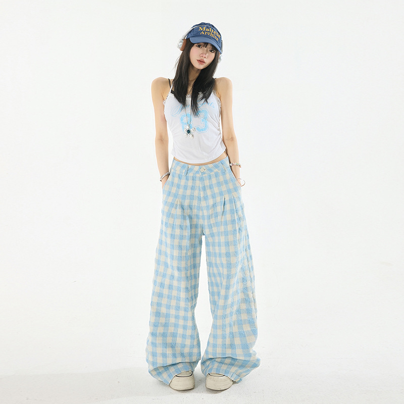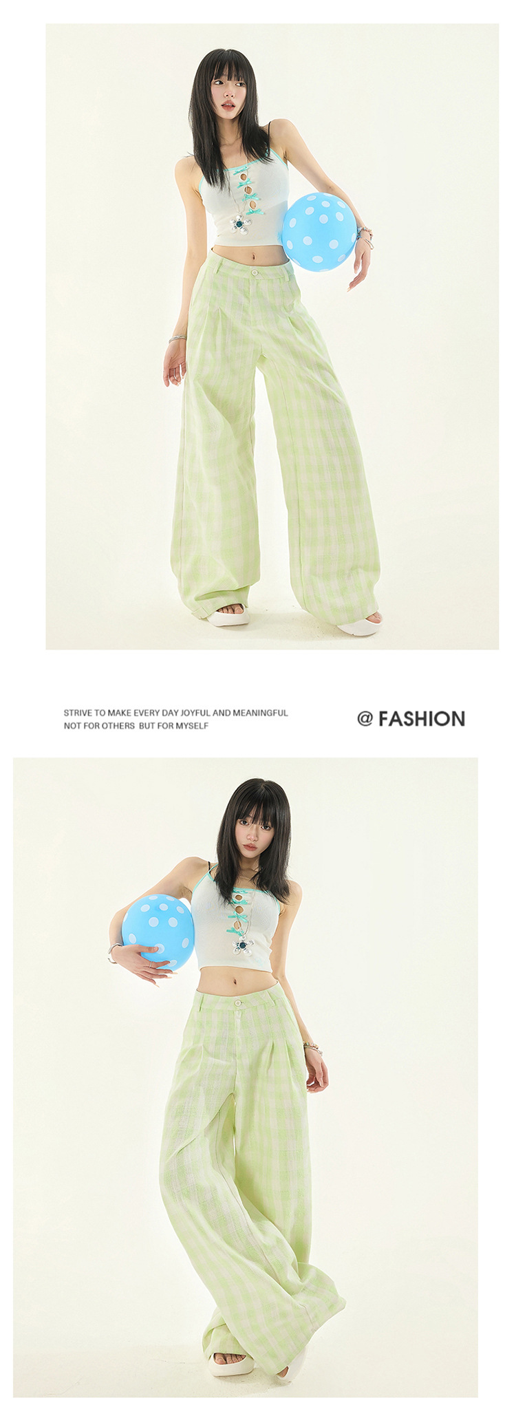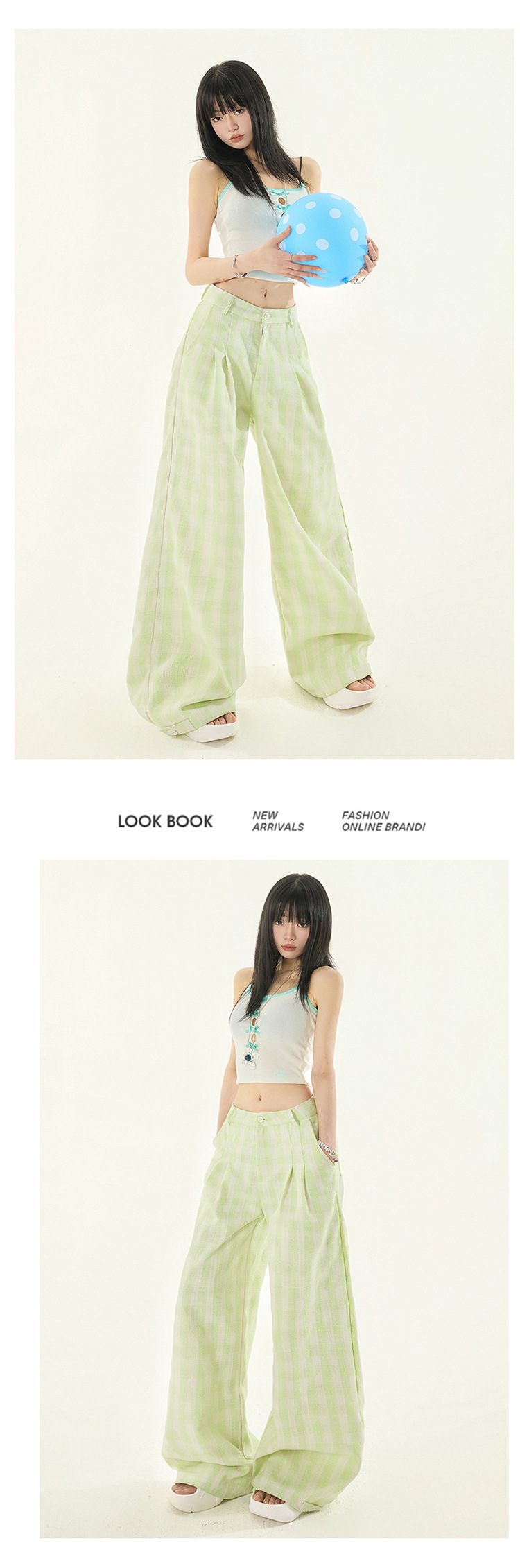 YD@격자 무늬 스트라이프 린넨 캐주얼 바지 여성 2025 신작 봄 여름 루즈 스트레이트 와이드 레그 팬츠