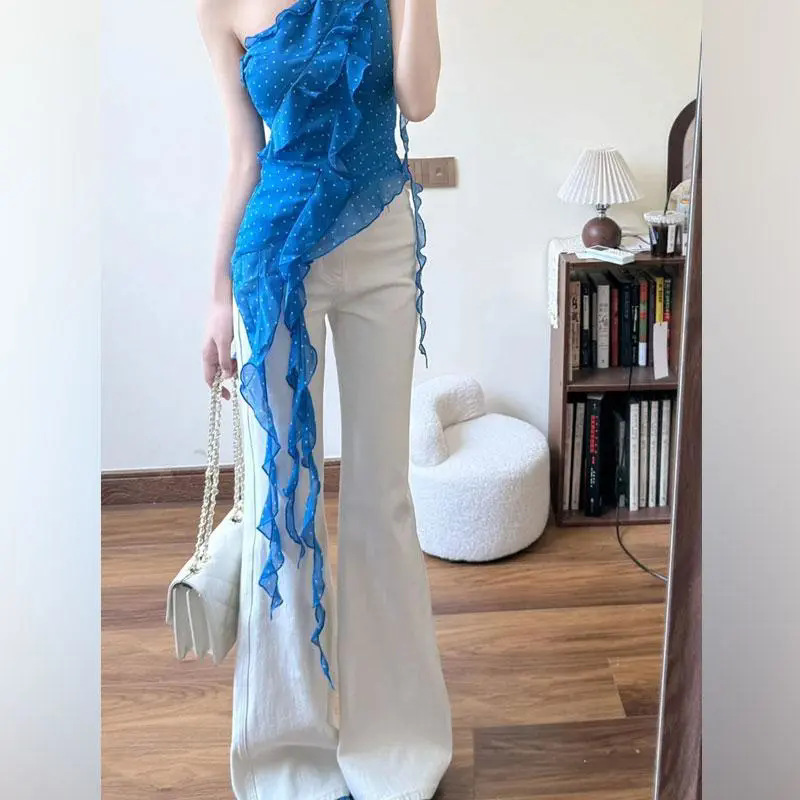 싱글피스/프렌치 쉬폰 셔츠, 불규칙한 리본 러플 탑, 여성 여름, 아름답고 멋진 부츠컷 청바지