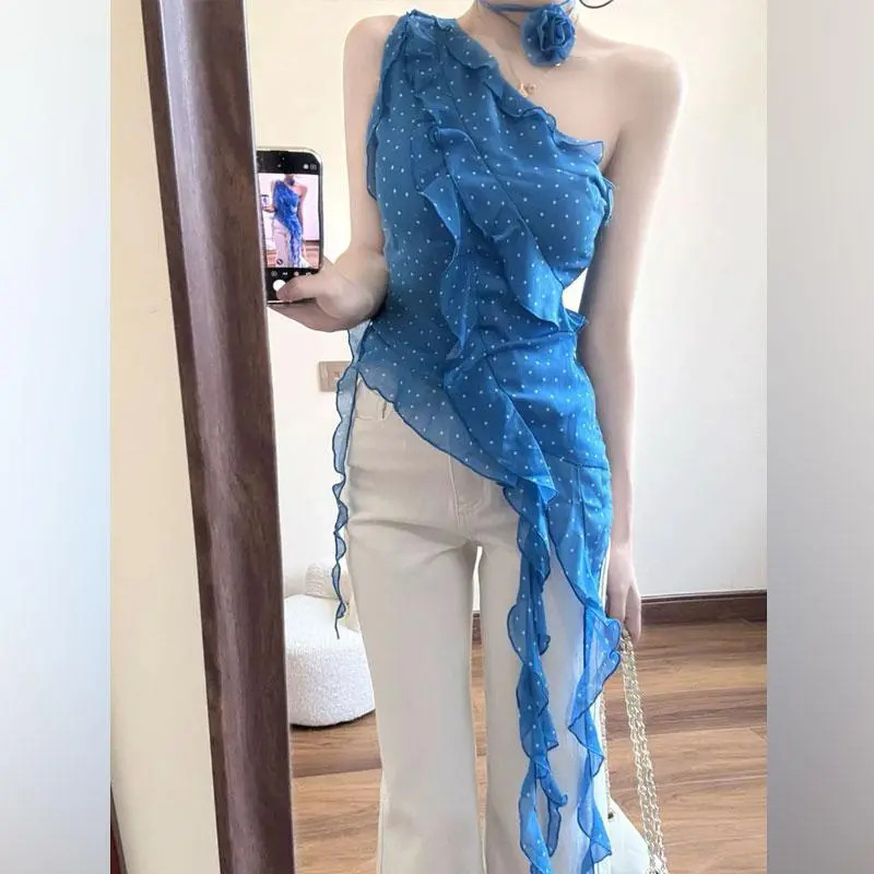 싱글피스/프렌치 쉬폰 셔츠, 불규칙한 리본 러플 탑, 여성 여름, 아름답고 멋진 부츠컷 청바지스토어 가기