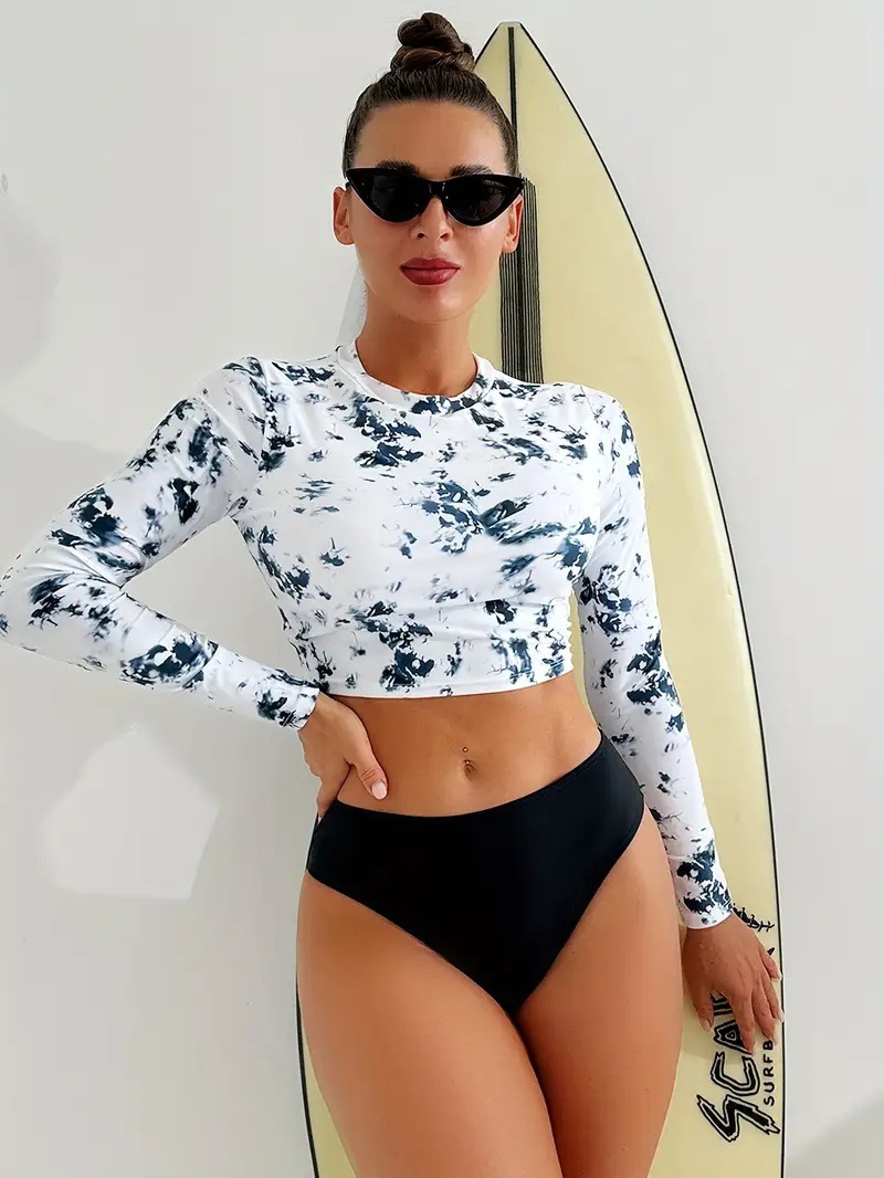 유럽과 미국의 수영복 하이 웨이스트 스플릿 비키니 타이트 슬리밍 보수적 인 작은 가슴 푸시 업 비치 서핑 긴팔 수영복스토어 가기