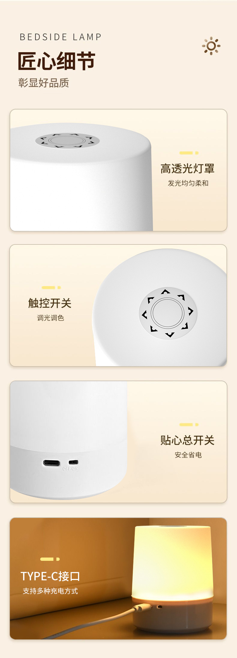 소형 야간등, 충전식 침대등, 아기 수유등, 수면등, 터치등, 침실 눈 보호용 부드러운 조명, 밝기 조절 가능