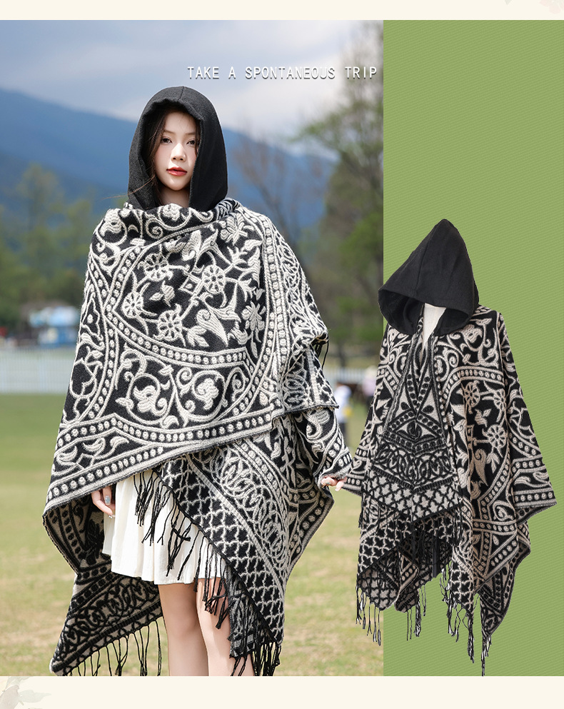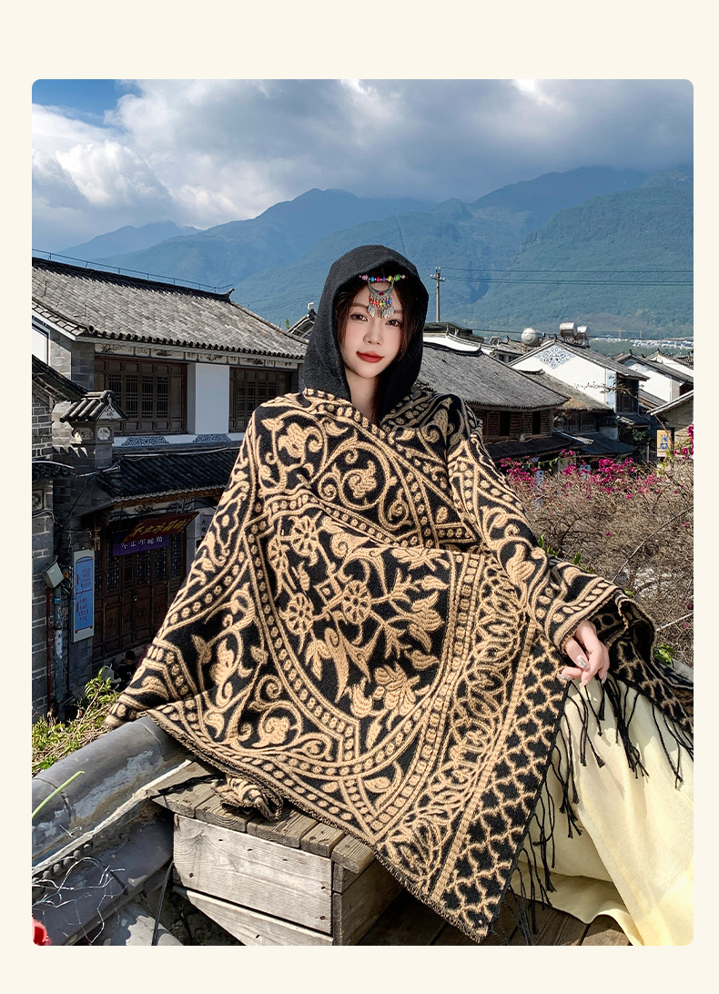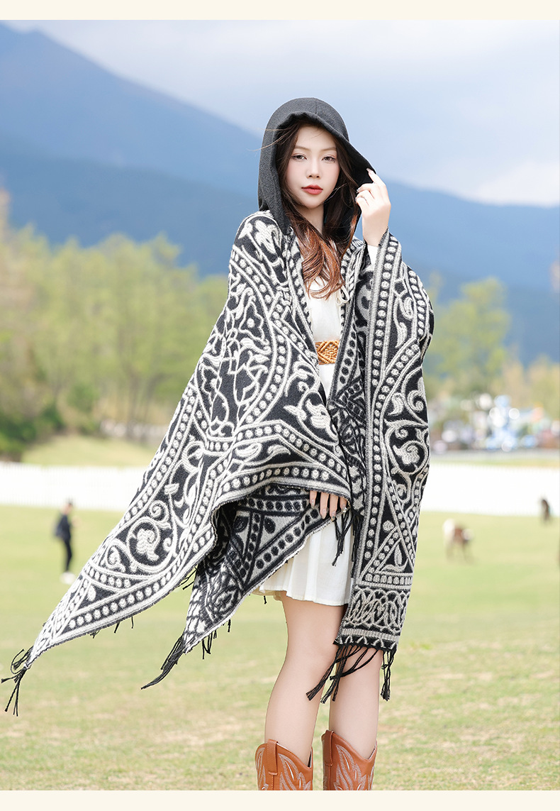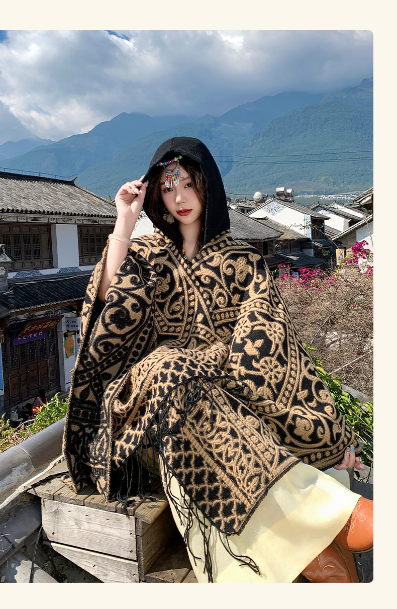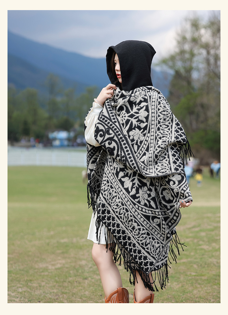 사진 촬영을 위한 에스닉 스타일 여행복, 모조 캐시미어 스카프, 가을 겨울 두꺼운 따뜻한 슬릿 스카프, 후드 망토스토어 가기