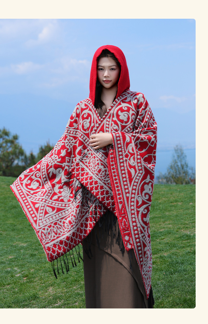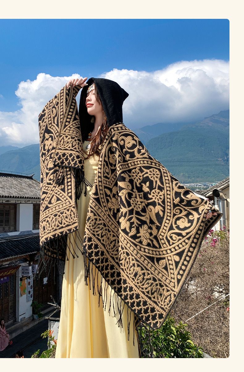 사진 촬영을 위한 에스닉 스타일 여행복, 모조 캐시미어 스카프, 가을 겨울 두꺼운 따뜻한 슬릿 스카프, 후드 망토