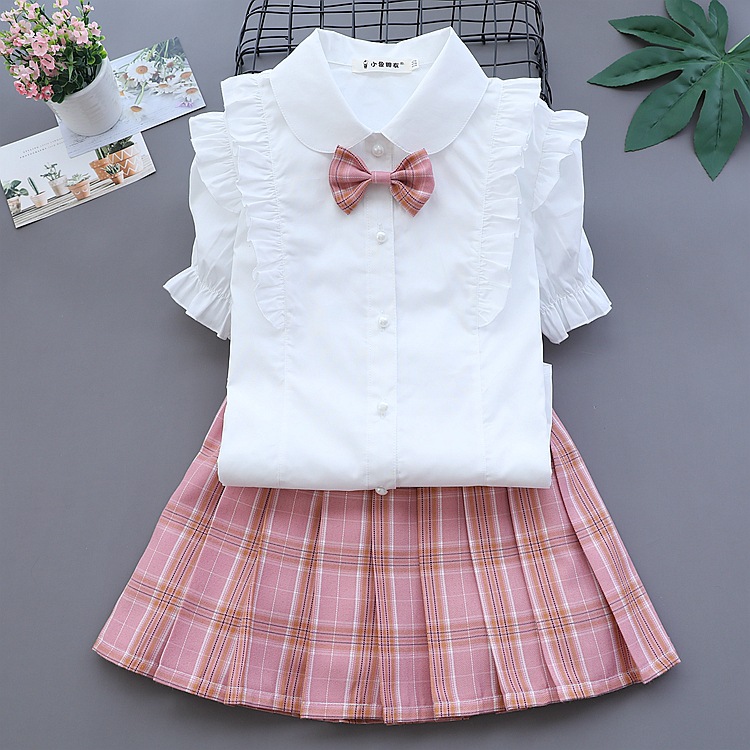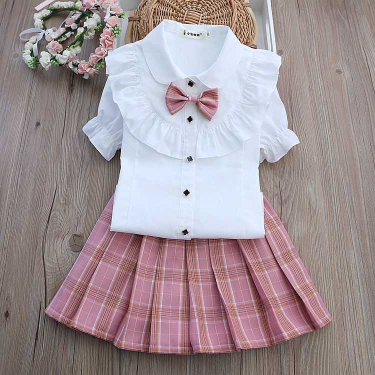 • 순백의 반팔 + 핑크 체크 스커트 + 핑크 체크 나비넥타이 슈트