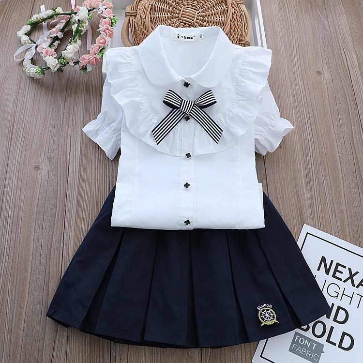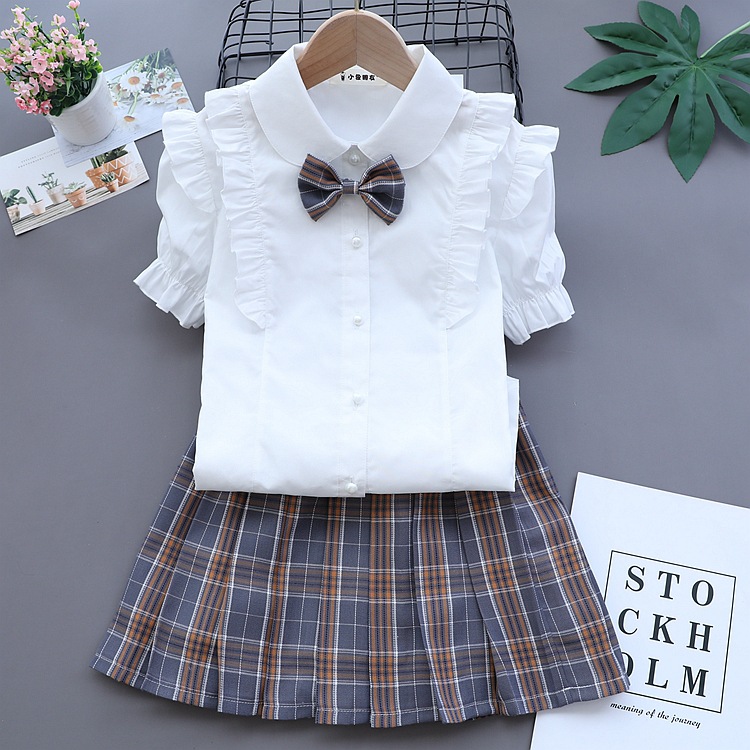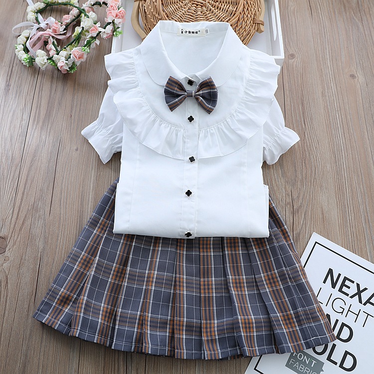 • 순백의 반팔 + 회색 체크무늬 스커트 + 회색 체크무늬 나비넥타이 슈트
