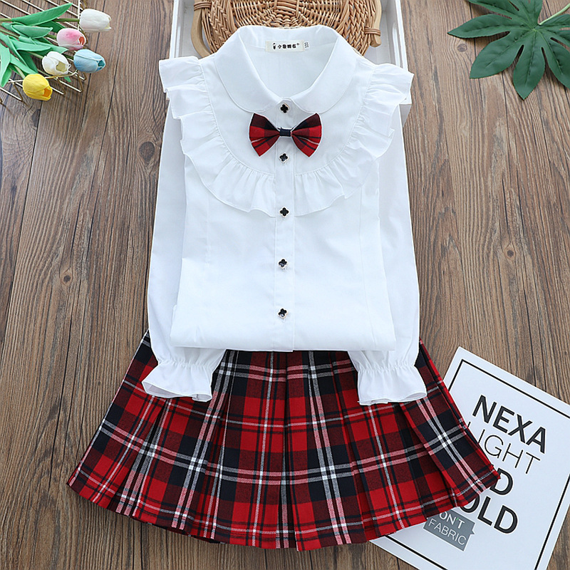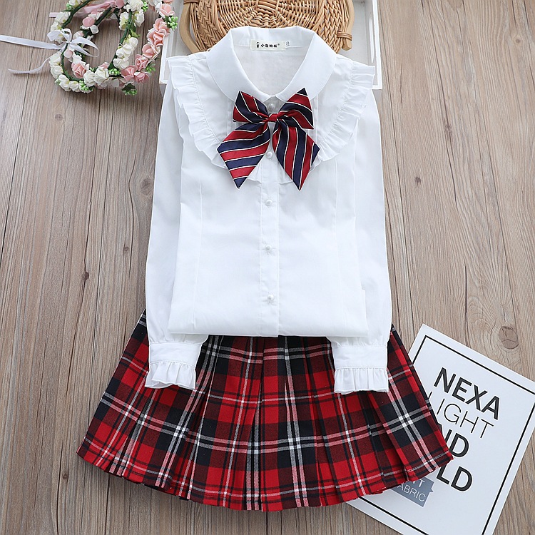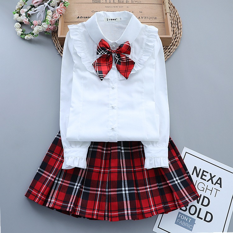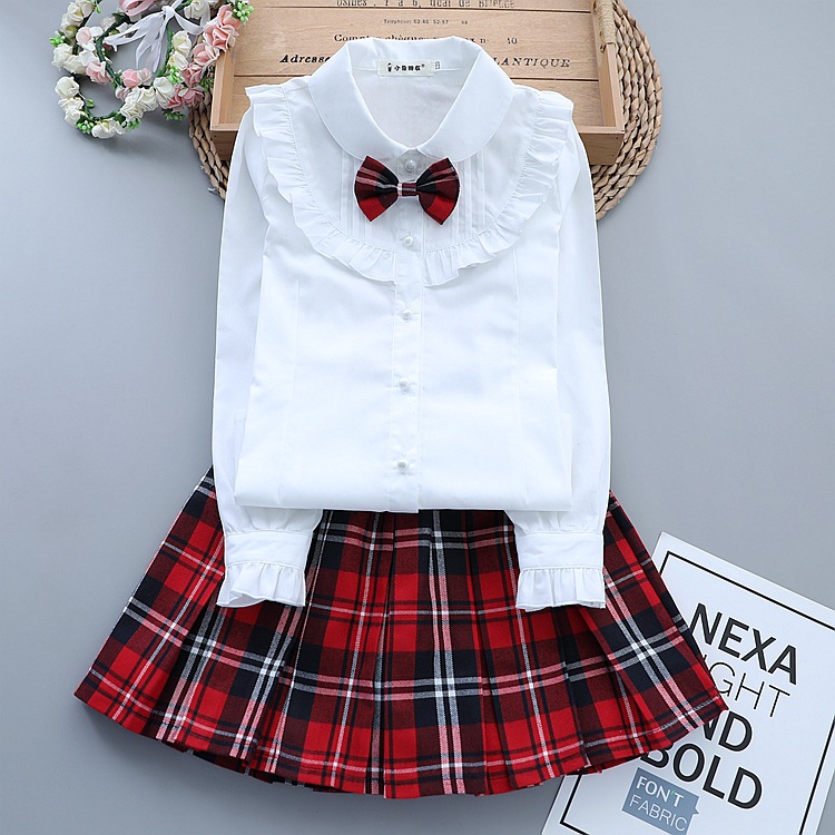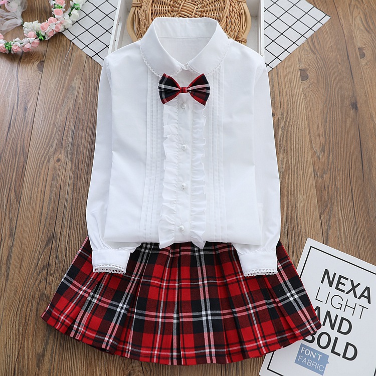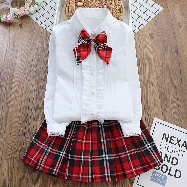 • 레이스 긴 소매 + 빨간색 체크 무늬 스커트 + 빨간색 체크 무늬 나비 넥타이 정장