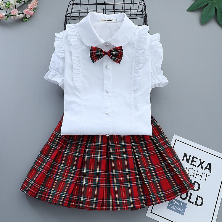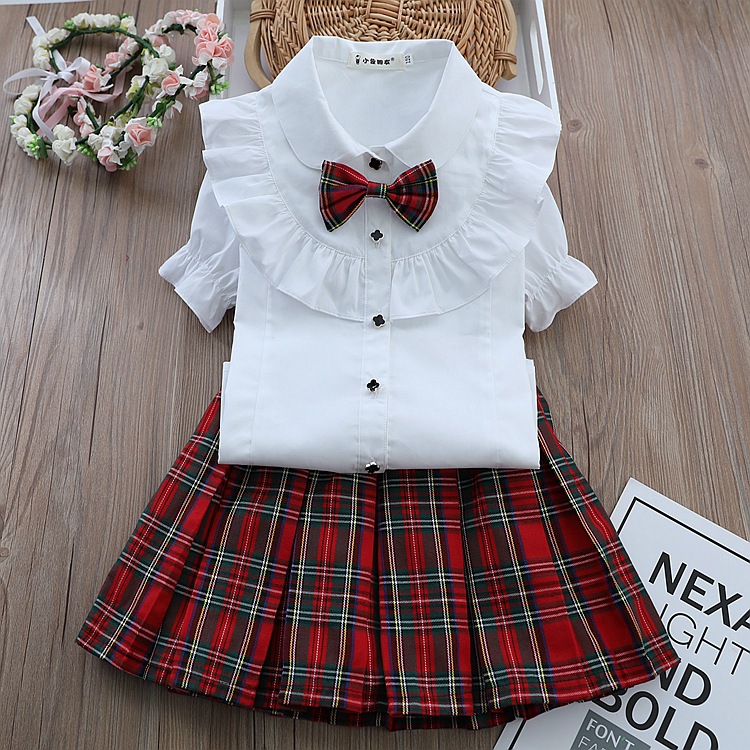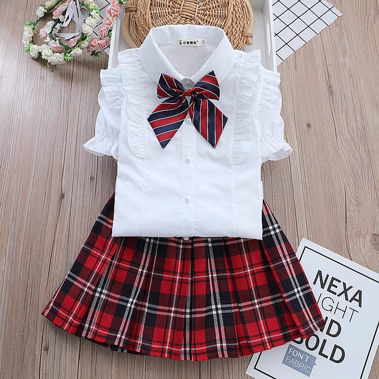 • 영국식 반팔 + 붉은 체크무늬 스커트 + 붉은 체크무늬 나비넥타이 슈트