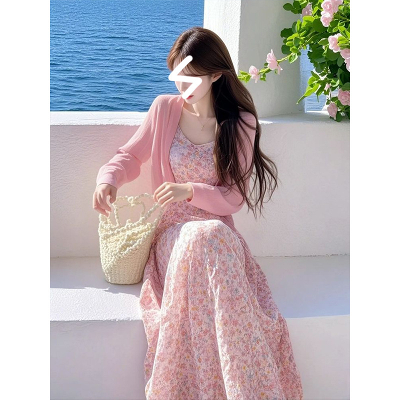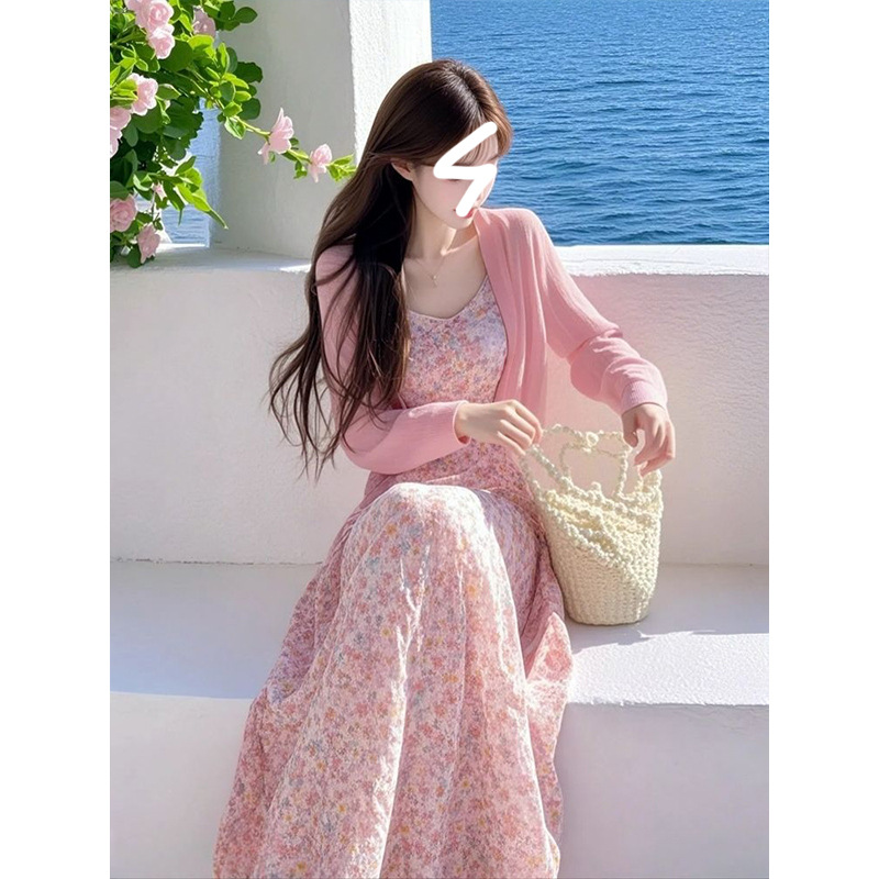 봄 한국 스타일 착용 세트 여성 2025 새로운 부드러운 스타일 카디건 탑 꽃 원피스 투피스 세트