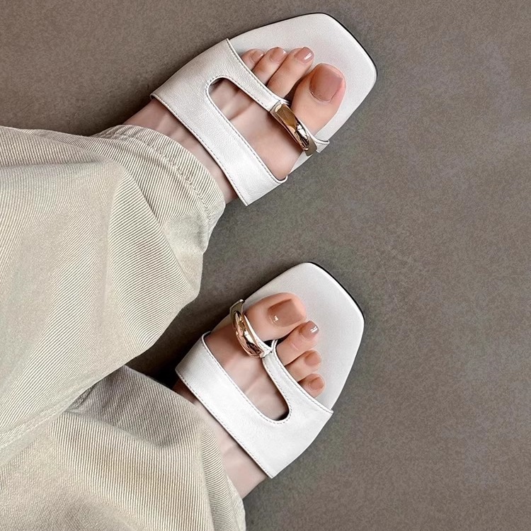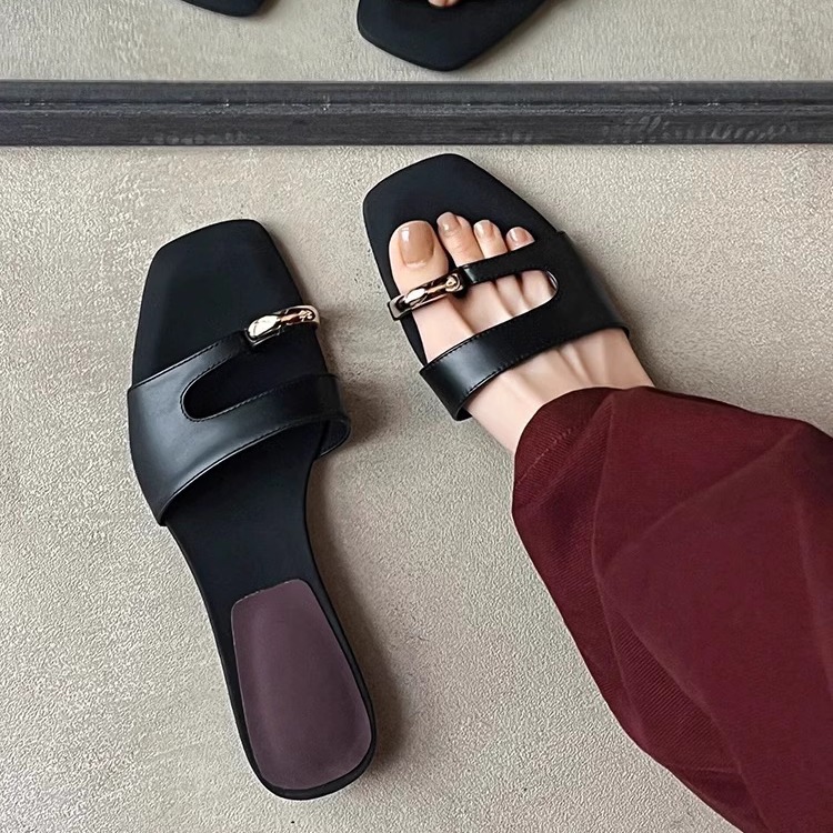 재고 ~ 의상 로우 힐 올 매치 오픈 발가락 샌들 여자 2025 년 여름 광장 헤드 메탈 벅스 발가락 아름다운 슬리퍼스토어 가기