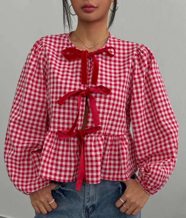 2025 크로스보더 여성용 격자 무늬 느슨한 보우 긴팔 셔츠