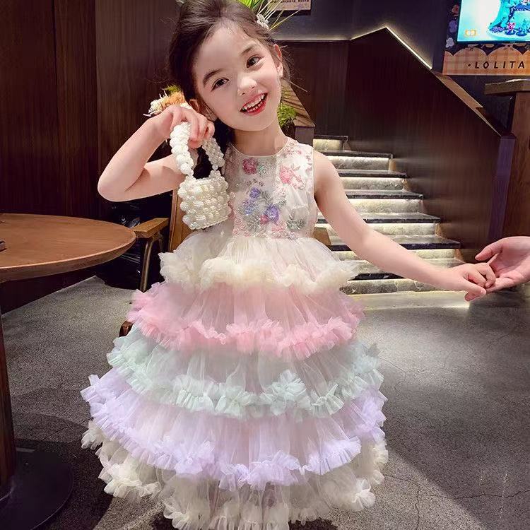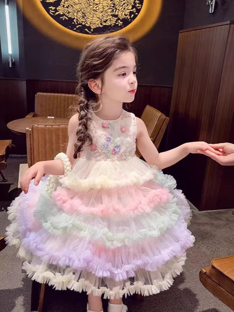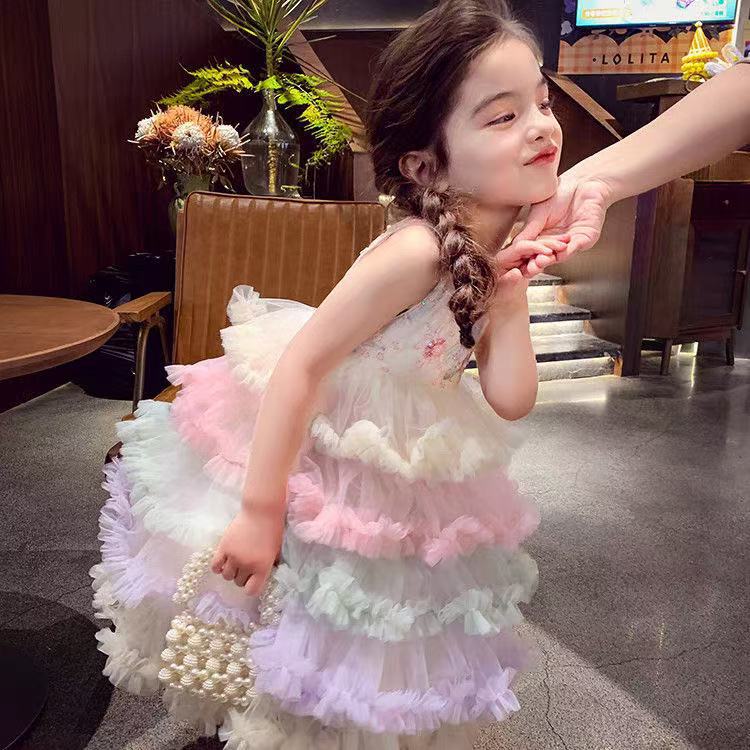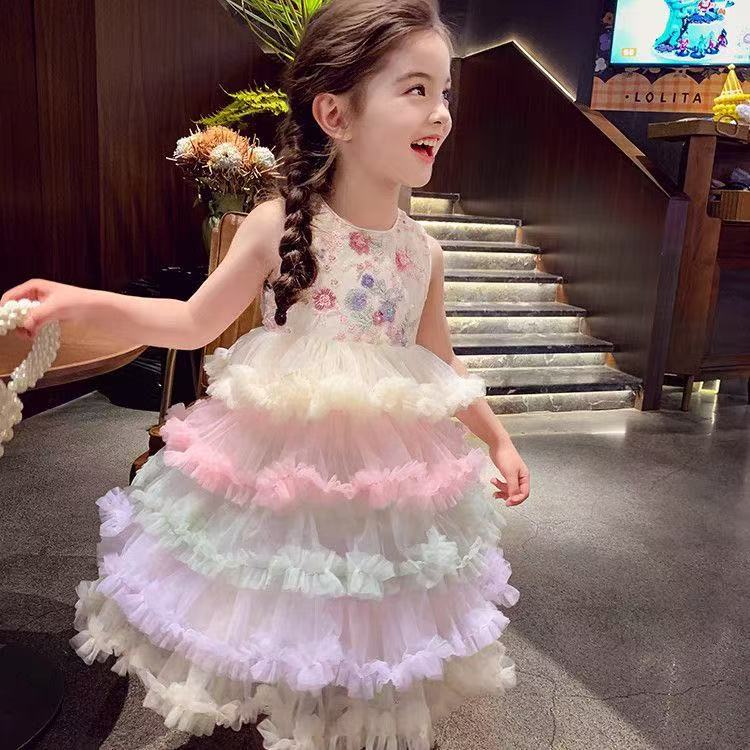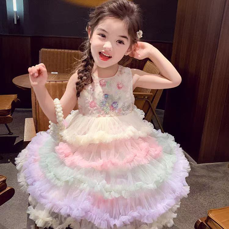 여자 드레스 여름 드레스 2025 새로운 어린이 무지개 푹신한 메쉬 공주 드레스 슈퍼 유행 여자 조끼 드레스