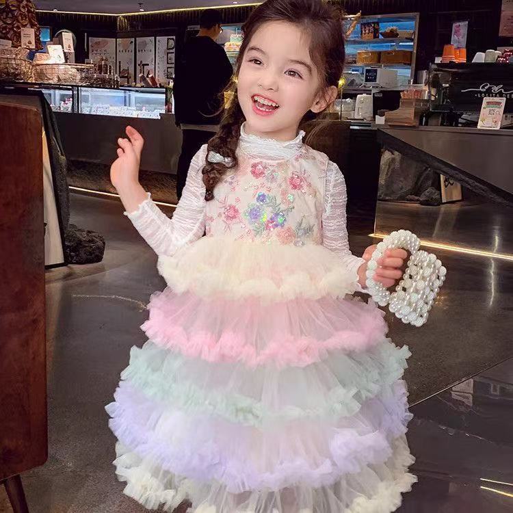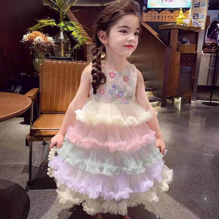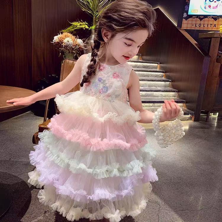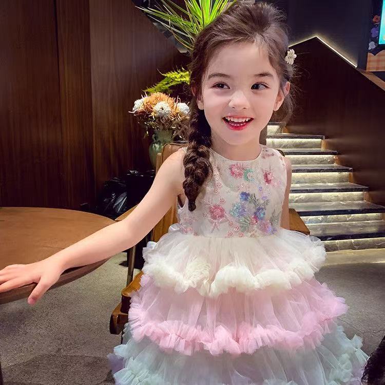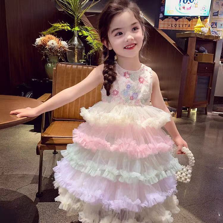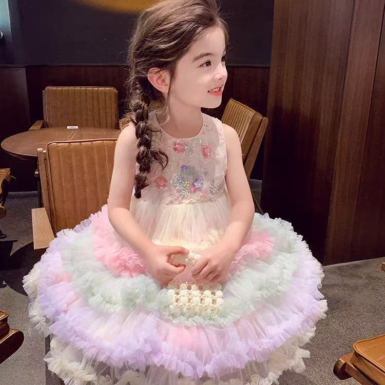 여자 드레스 여름 드레스 2025 새로운 어린이 무지개 푹신한 메쉬 공주 드레스 슈퍼 유행 여자 조끼 드레스