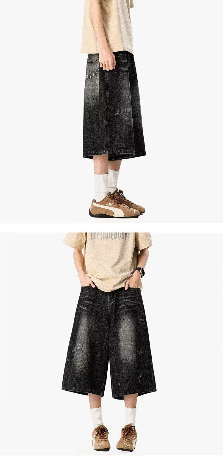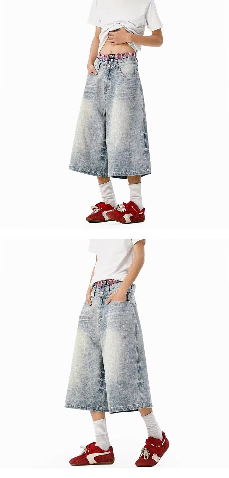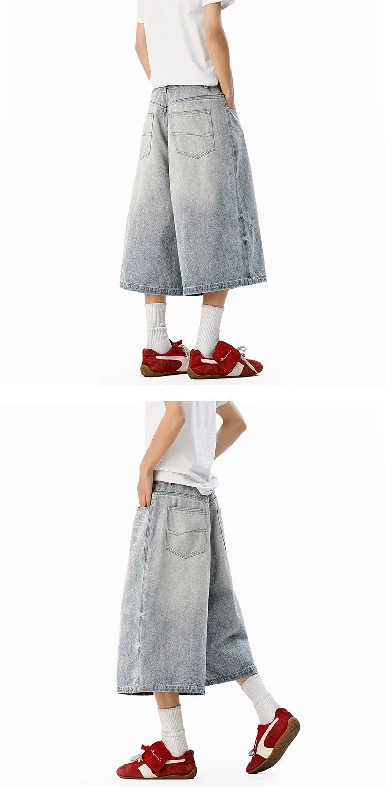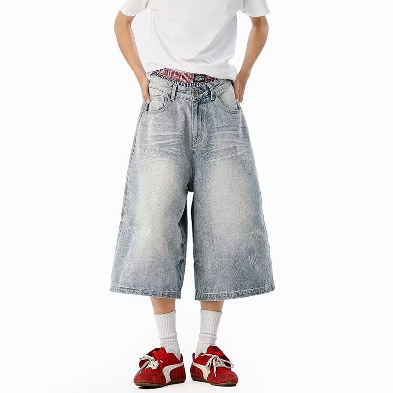 남성용 아메리칸 레트로 데님 크롭 팬츠, 여름 커플, 헤비급 하이 스트리트 트렌디 브랜드 루즈 스트레이트 와이드 레그 반바지스토어 가기