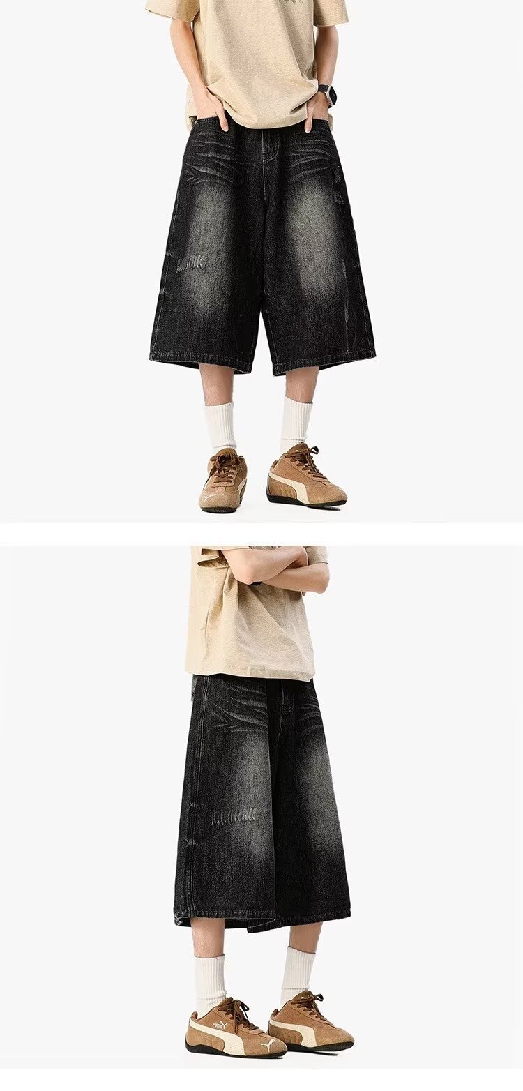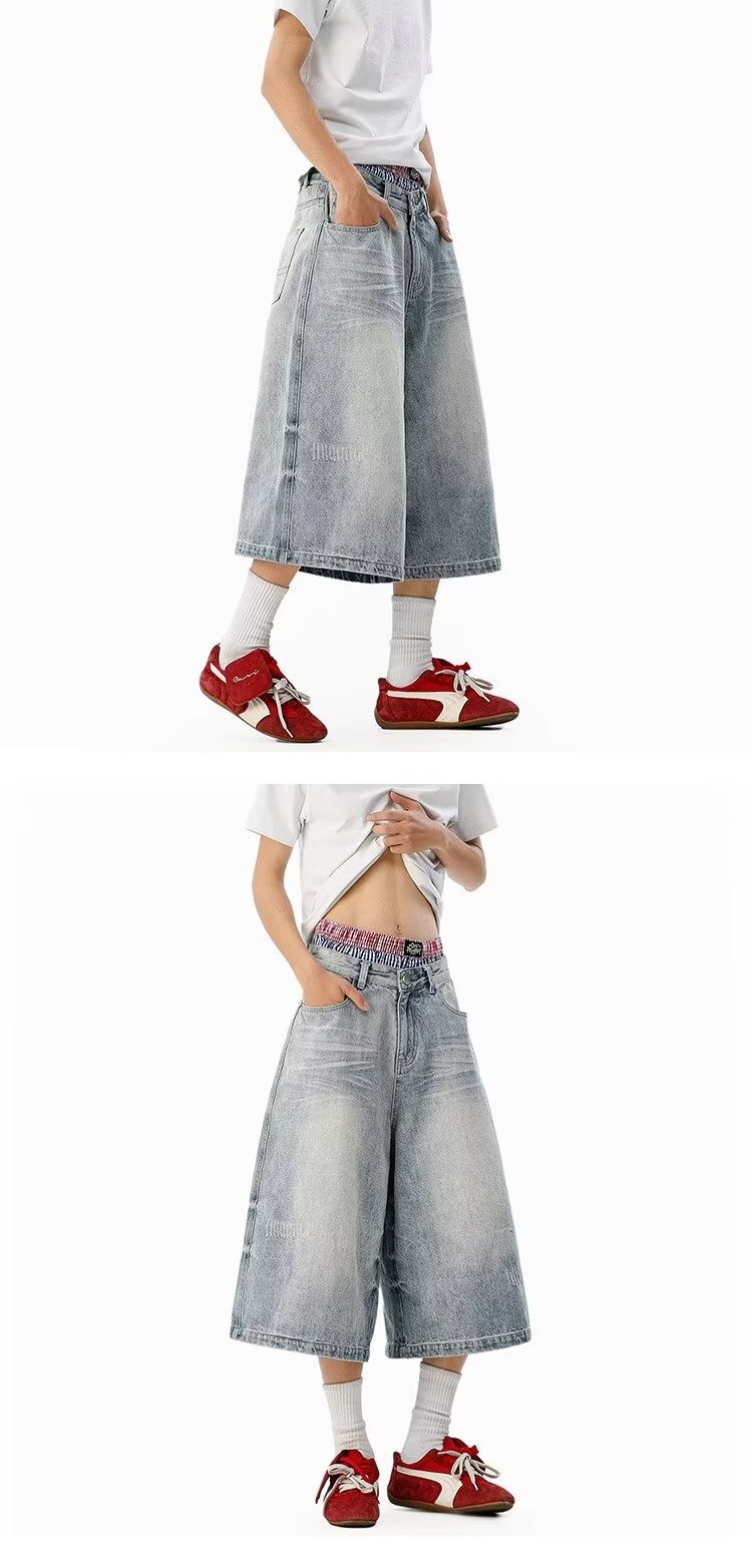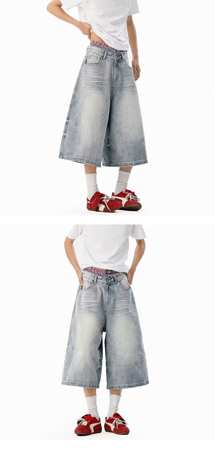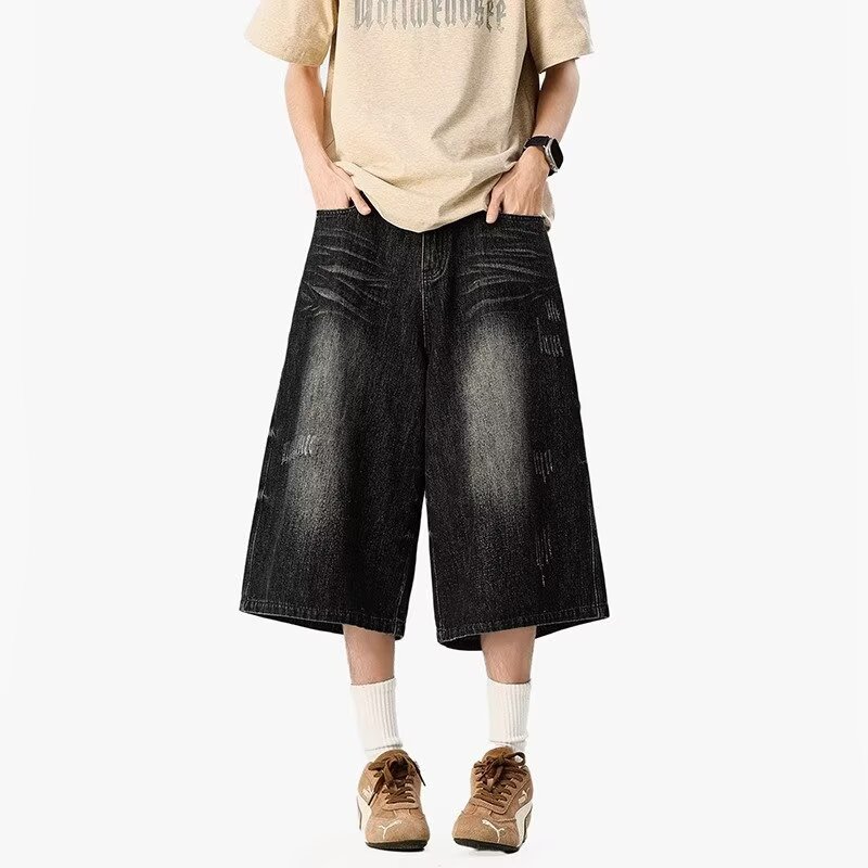 남성용 아메리칸 레트로 데님 크롭 팬츠, 여름 커플, 헤비급 하이 스트리트 트렌디 브랜드 루즈 스트레이트 와이드 레그 반바지스토어 가기