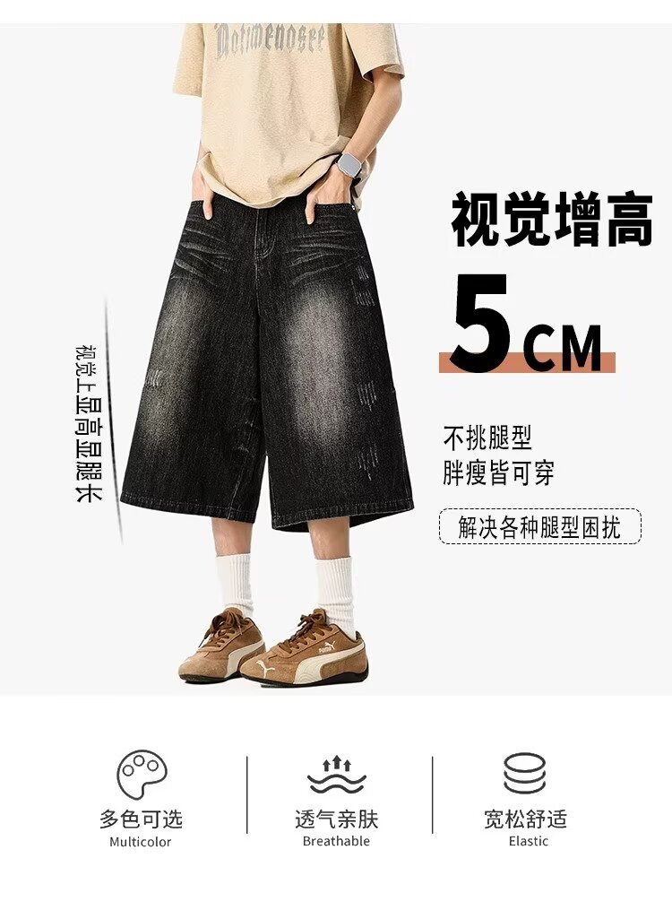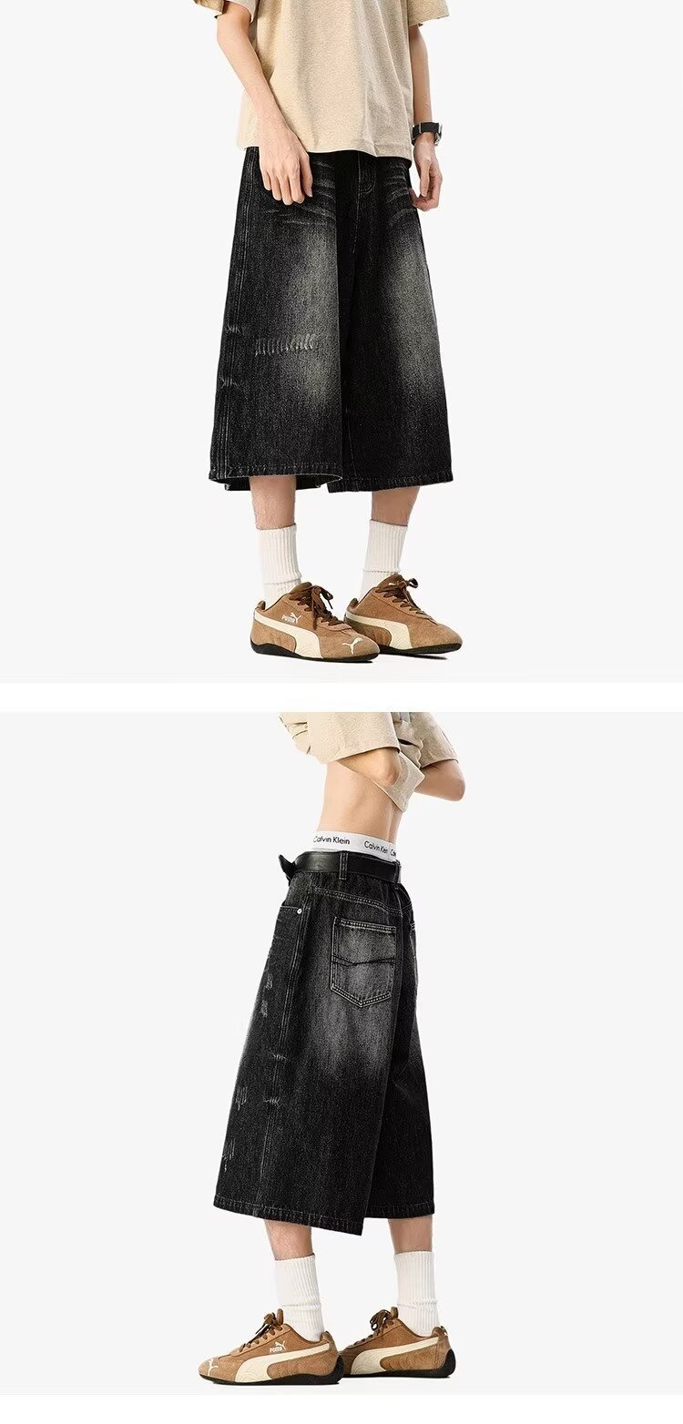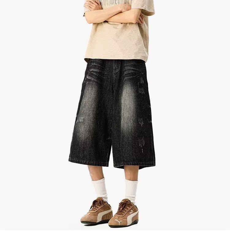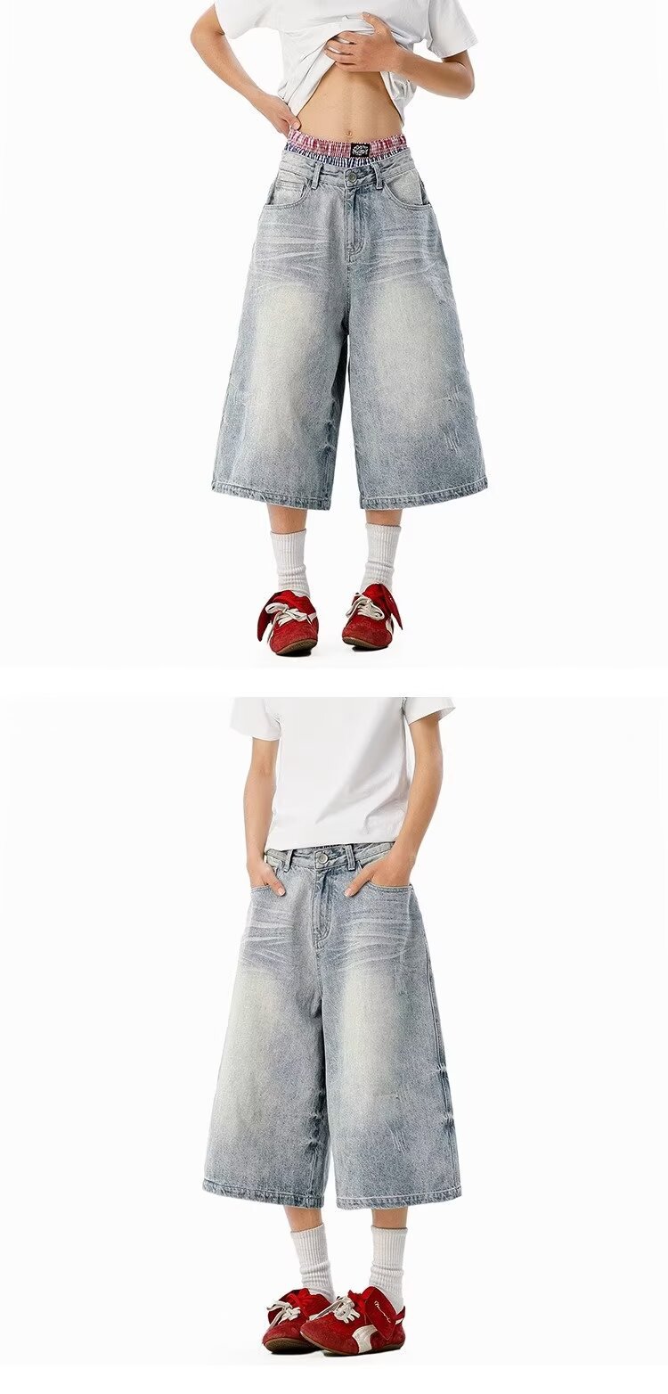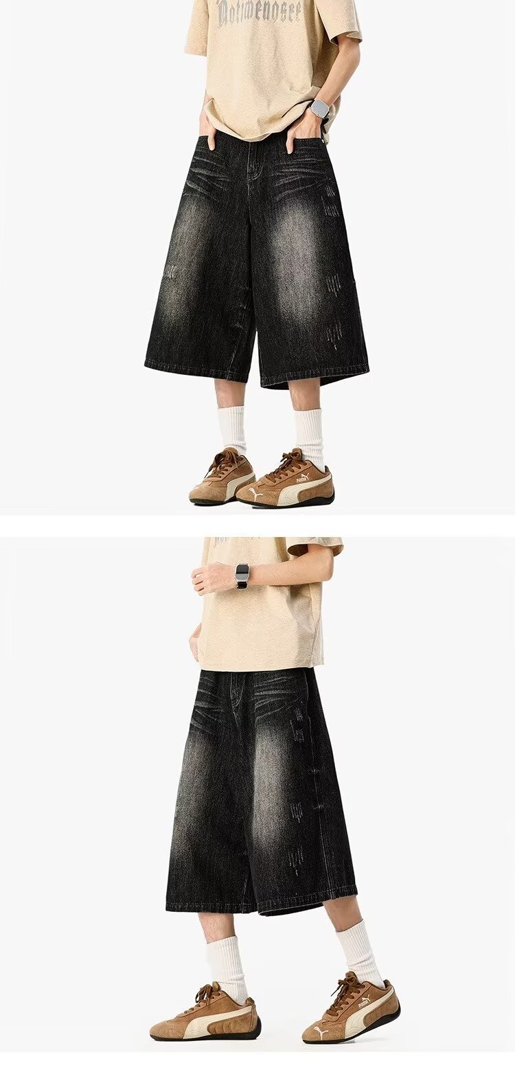 남성용 아메리칸 레트로 데님 크롭 팬츠, 여름 커플, 헤비급 하이 스트리트 트렌디 브랜드 루즈 스트레이트 와이드 레그 반바지스토어 가기