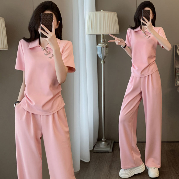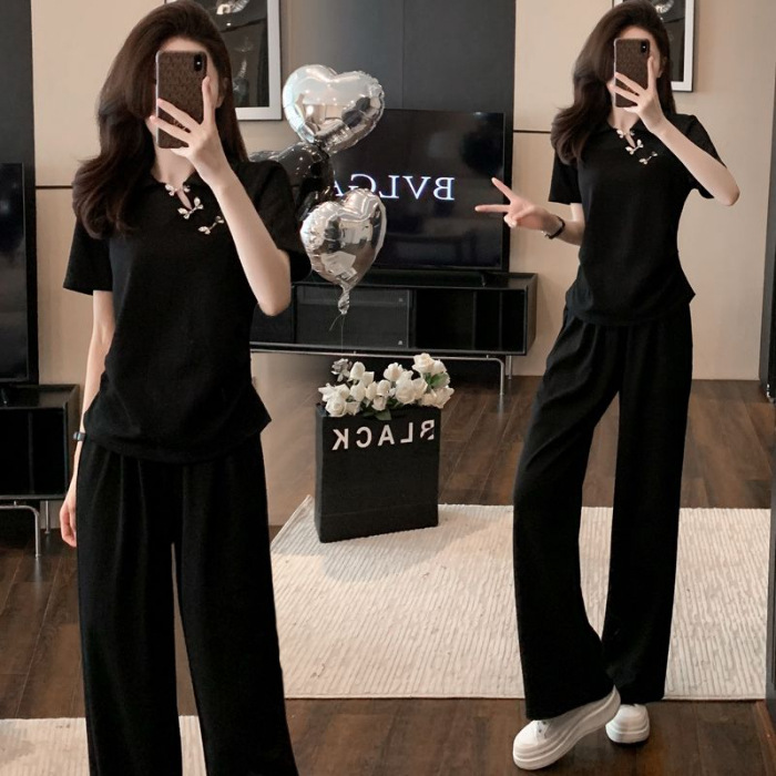 폭발적인 새로운 중국 스타일 국가 스타일 캐주얼 와이드 다리 바지 세트 여신 여름 패션 연령 감소 슬리밍 스포츠 투피스 세트
