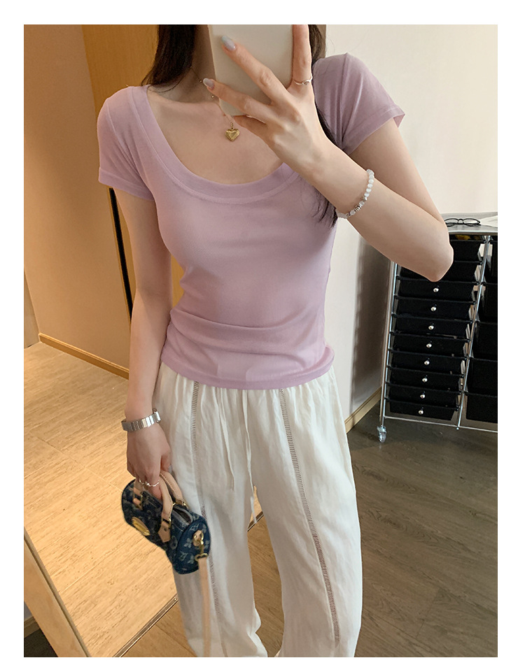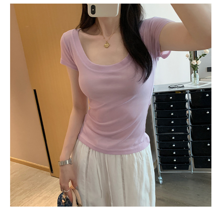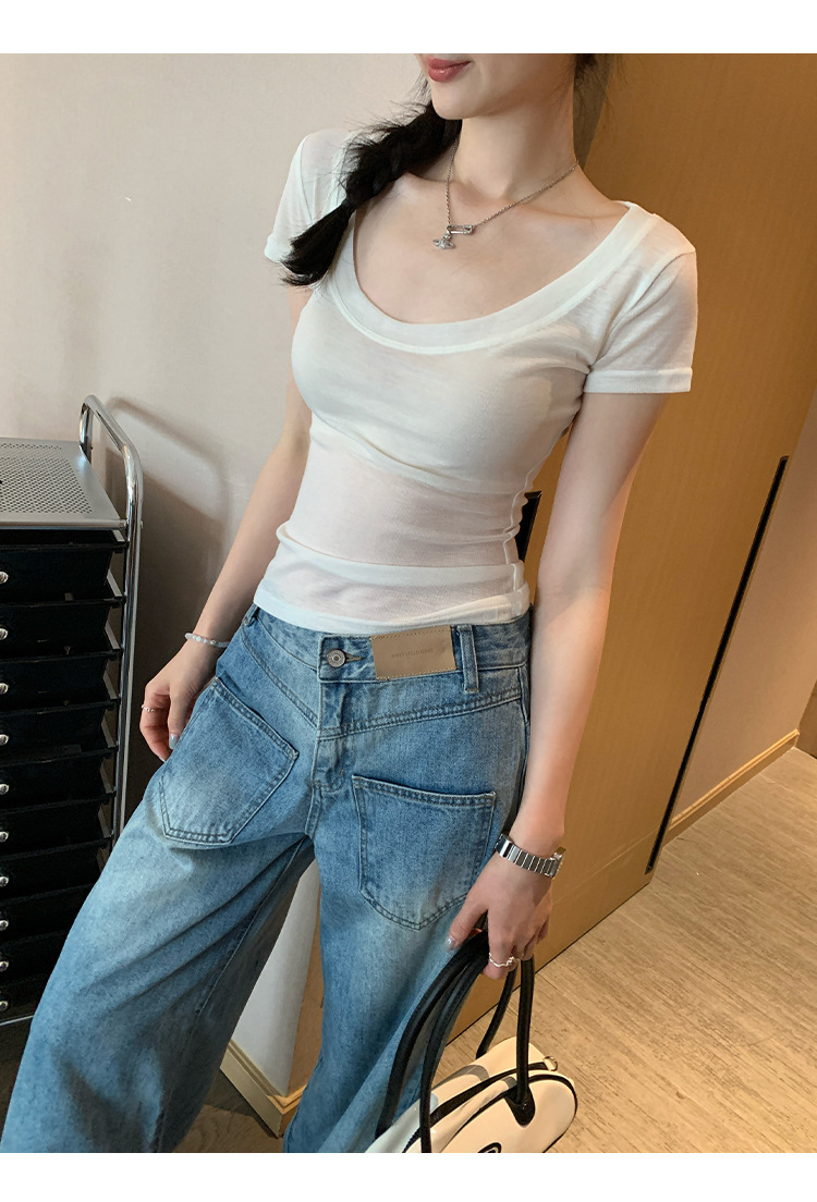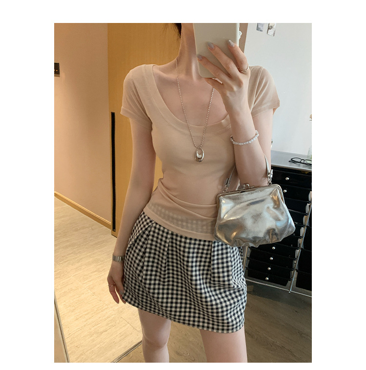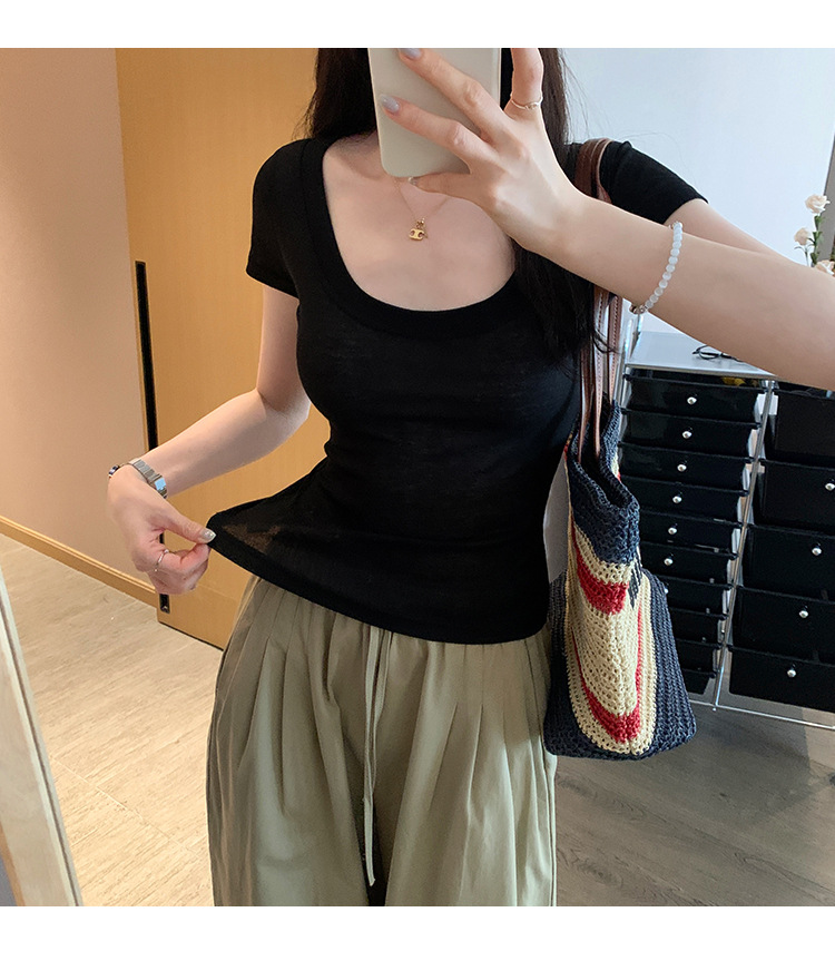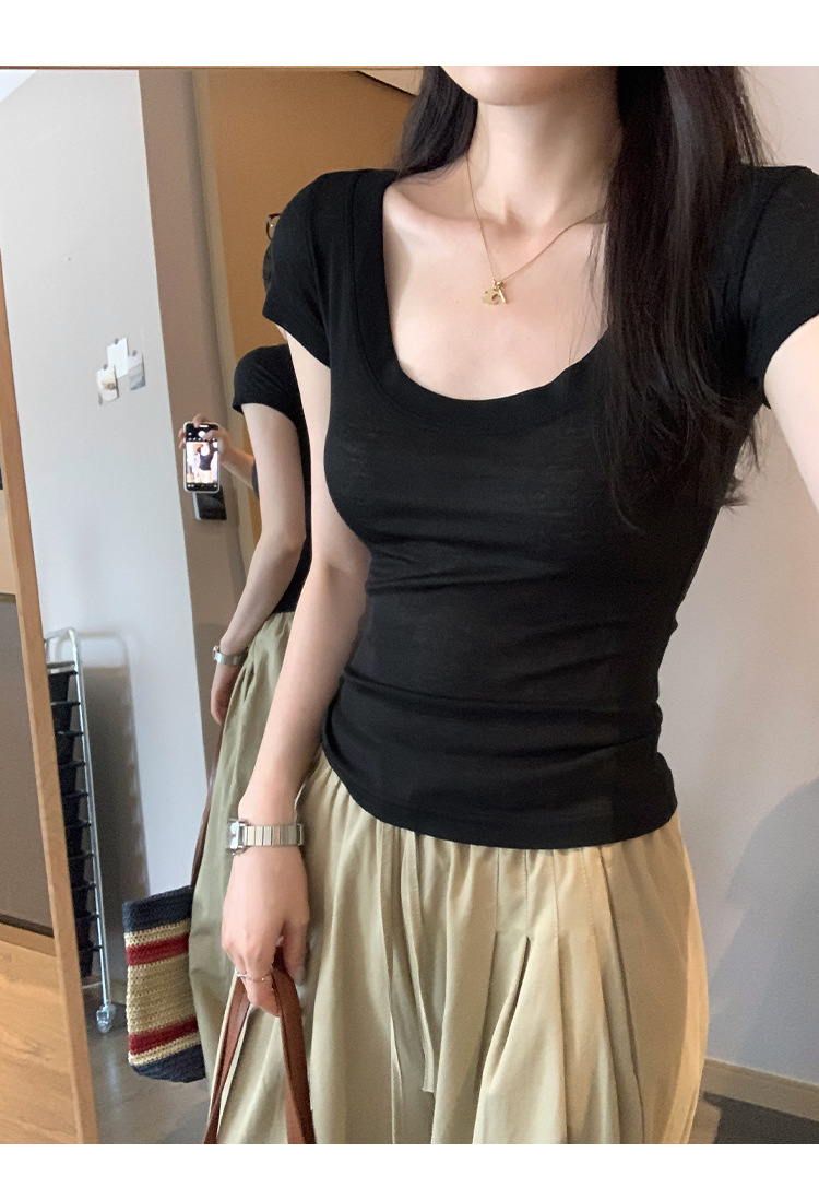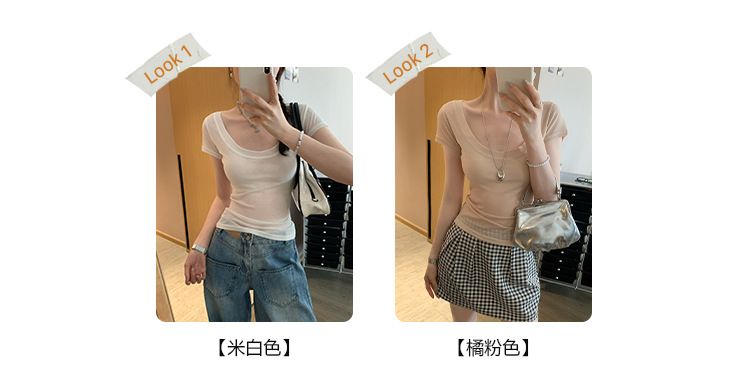얇은 마이크로 투명 대형 라운드 넥 허리 반팔 티셔츠 여성 2025 년 여름 새로운 슬림 핏 슬리밍 올 매치 웨스턴 스타일 탑