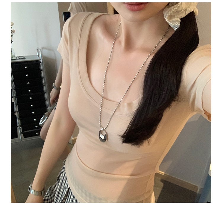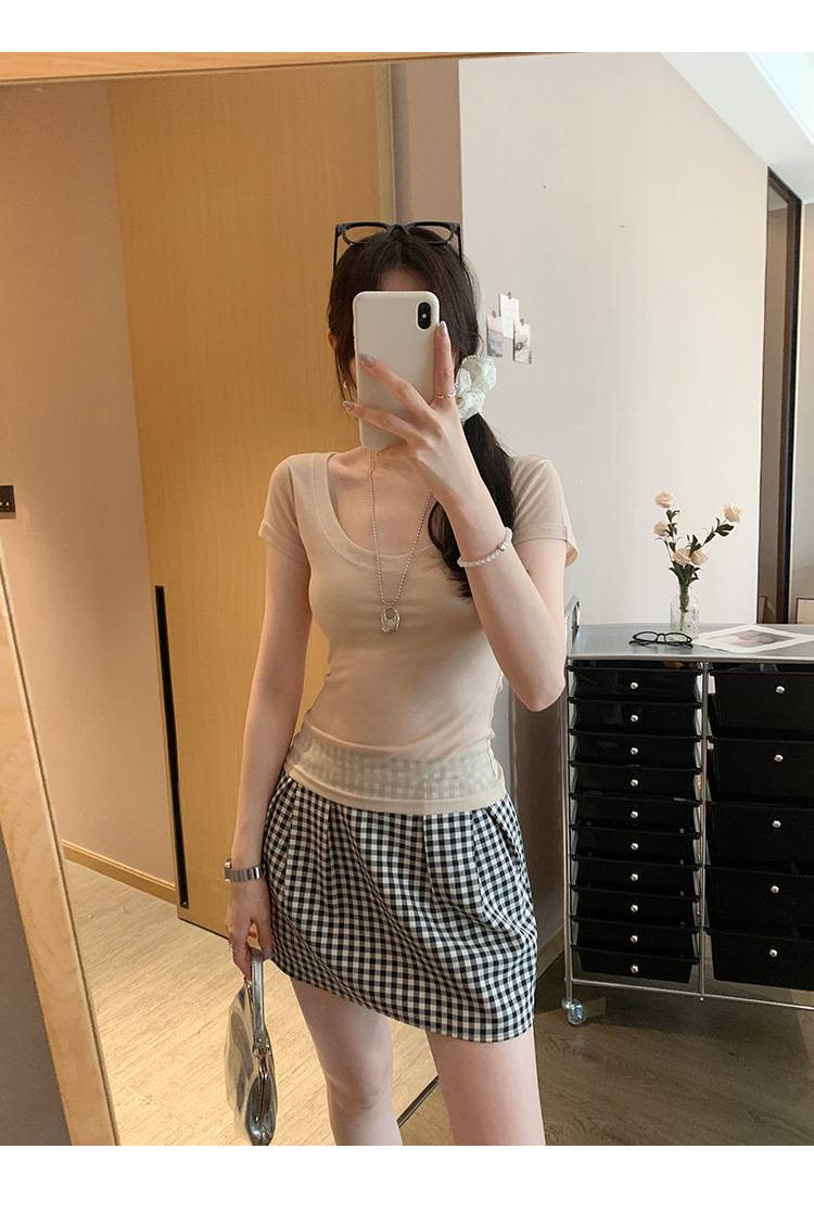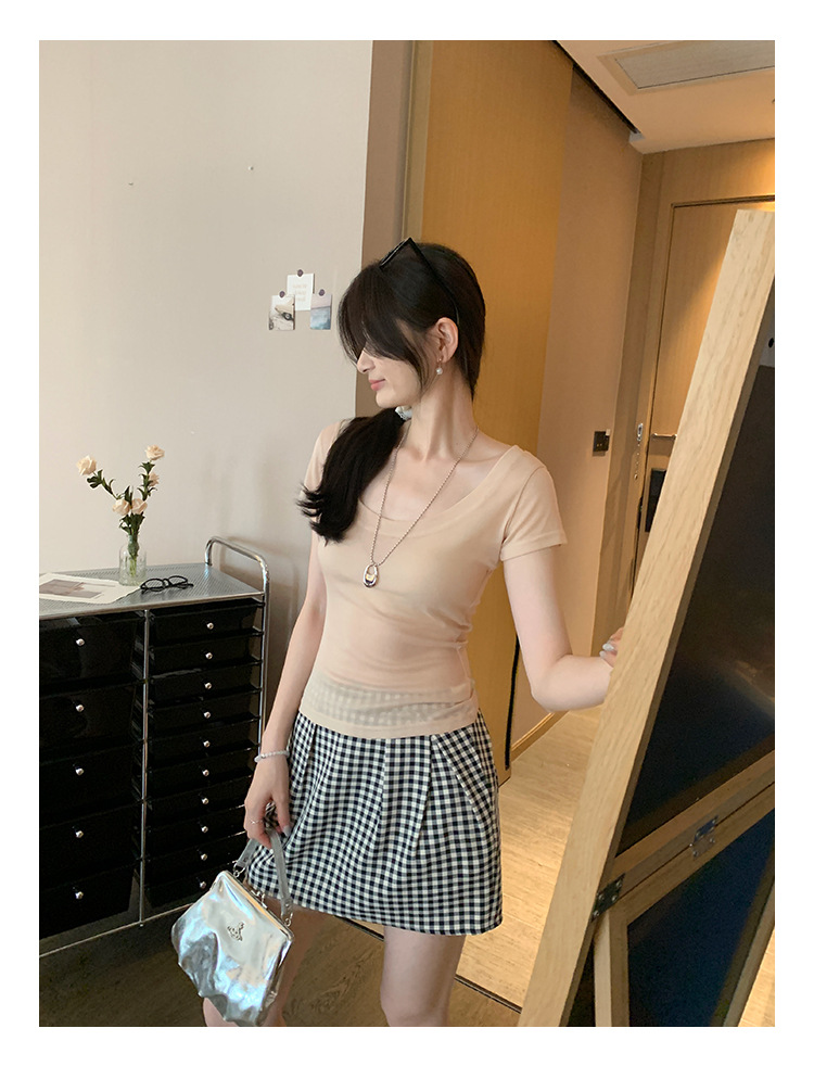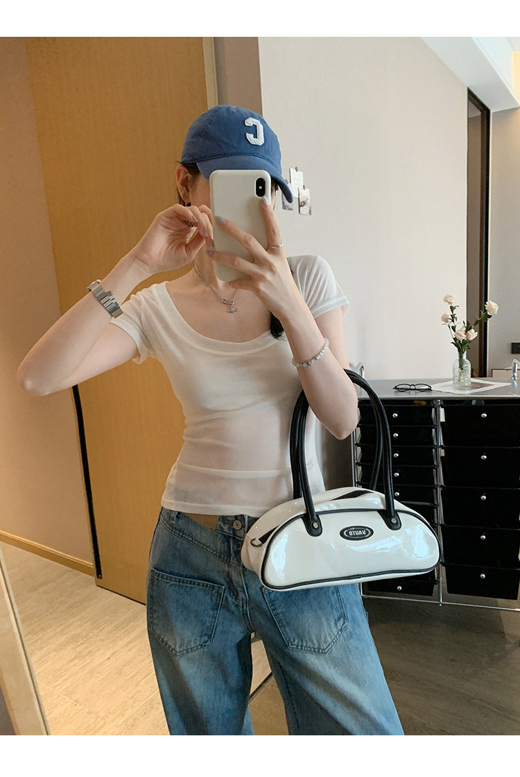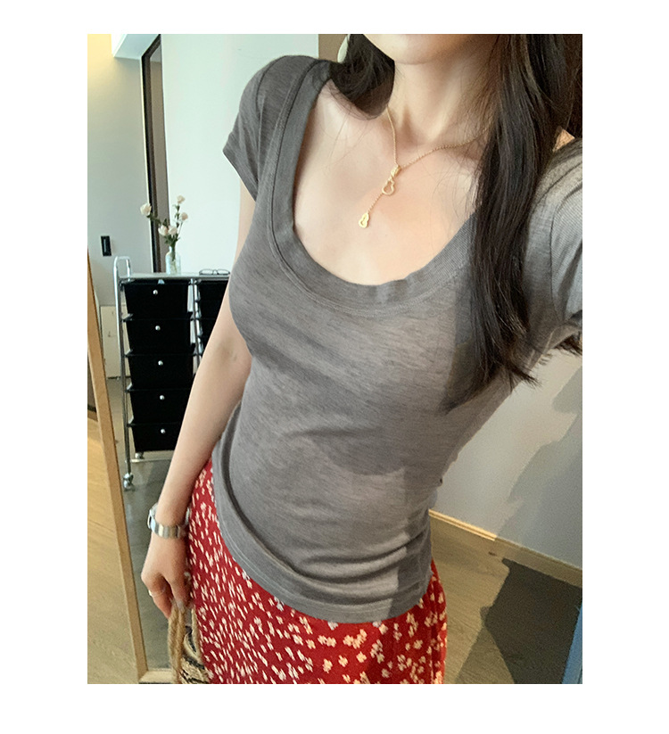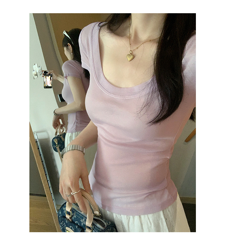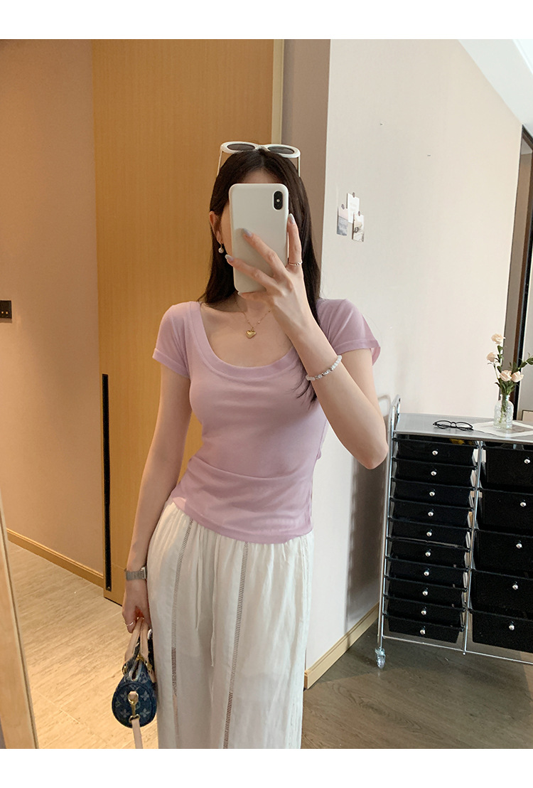얇은 마이크로 투명 대형 라운드 넥 허리 반팔 티셔츠 여성 2025 년 여름 새로운 슬림 핏 슬리밍 올 매치 웨스턴 스타일 탑