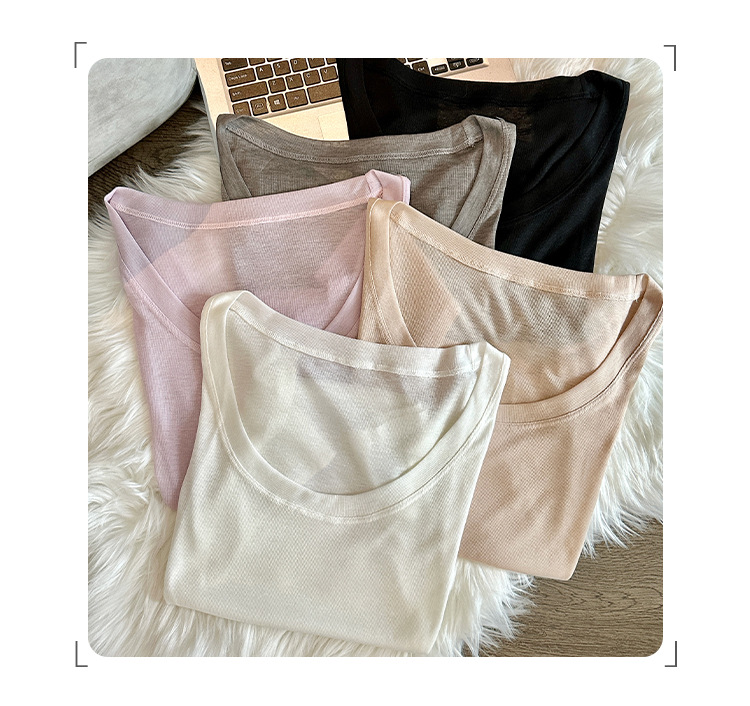 얇은 마이크로 투명 대형 라운드 넥 허리 반팔 티셔츠 여성 2025 년 여름 새로운 슬림 핏 슬리밍 올 매치 웨스턴 스타일 탑스토어 가기