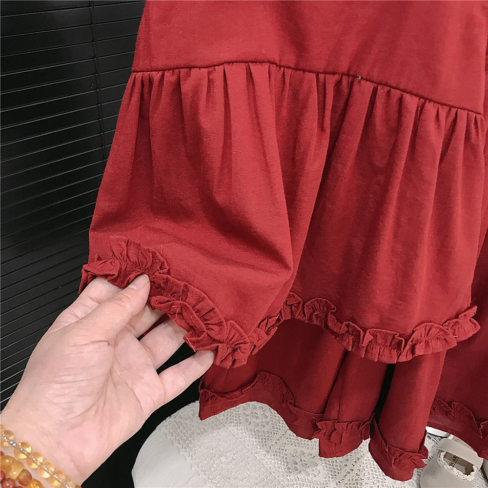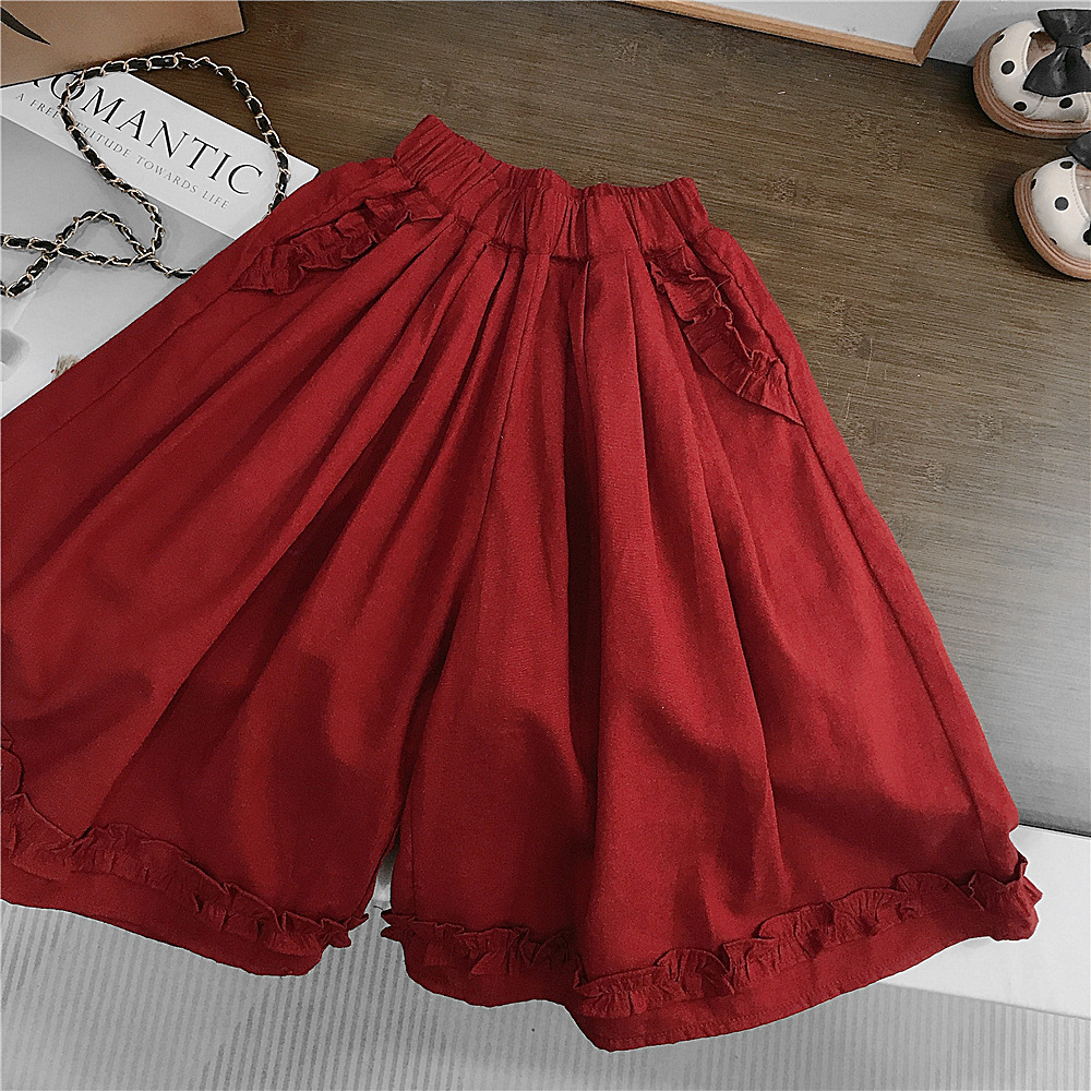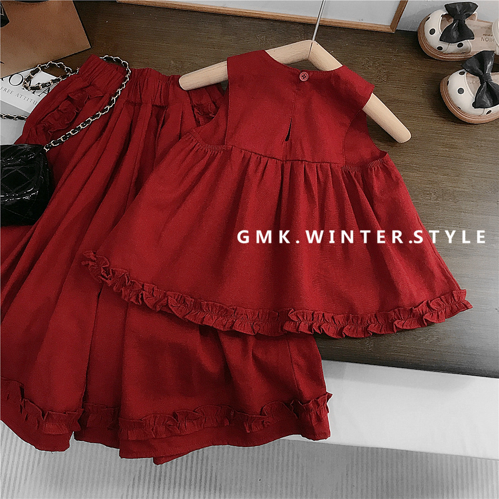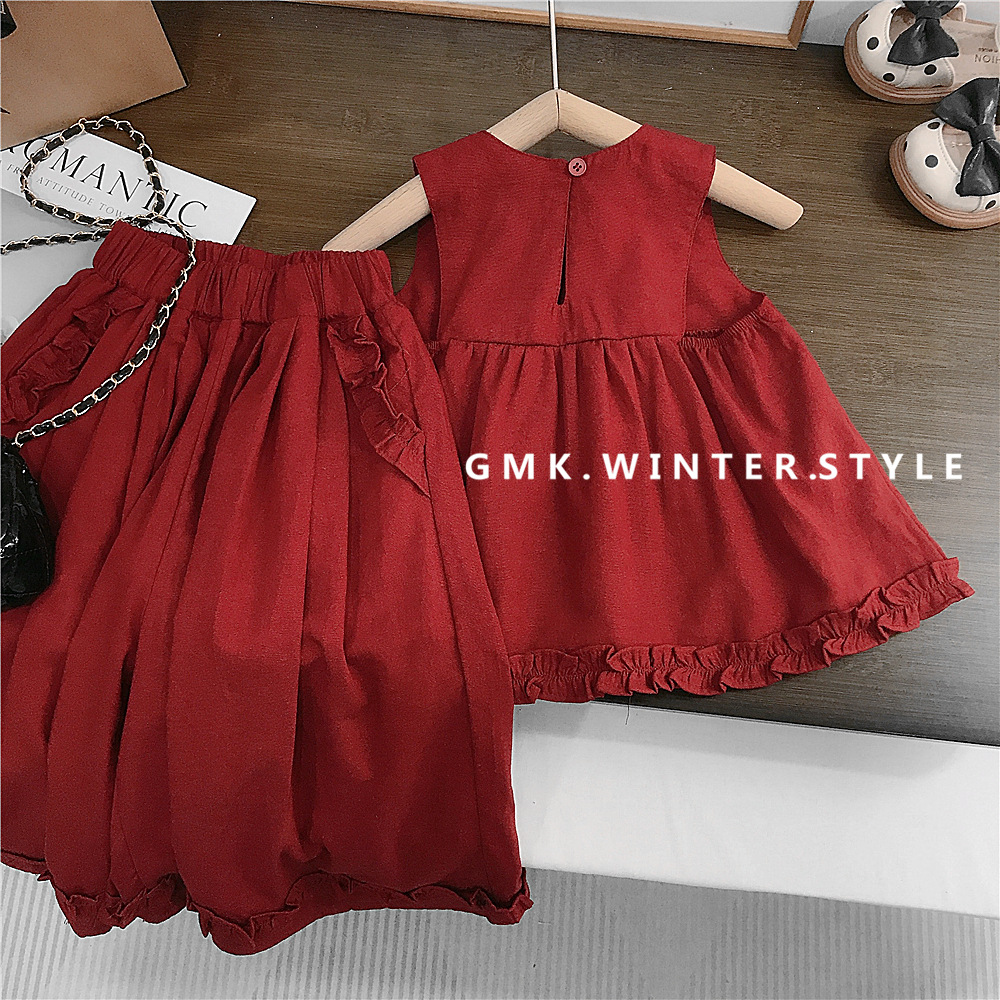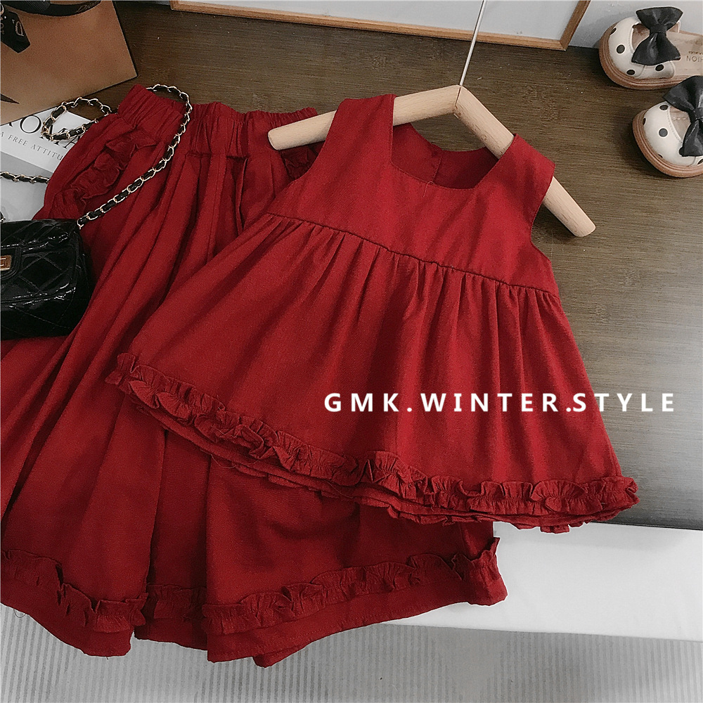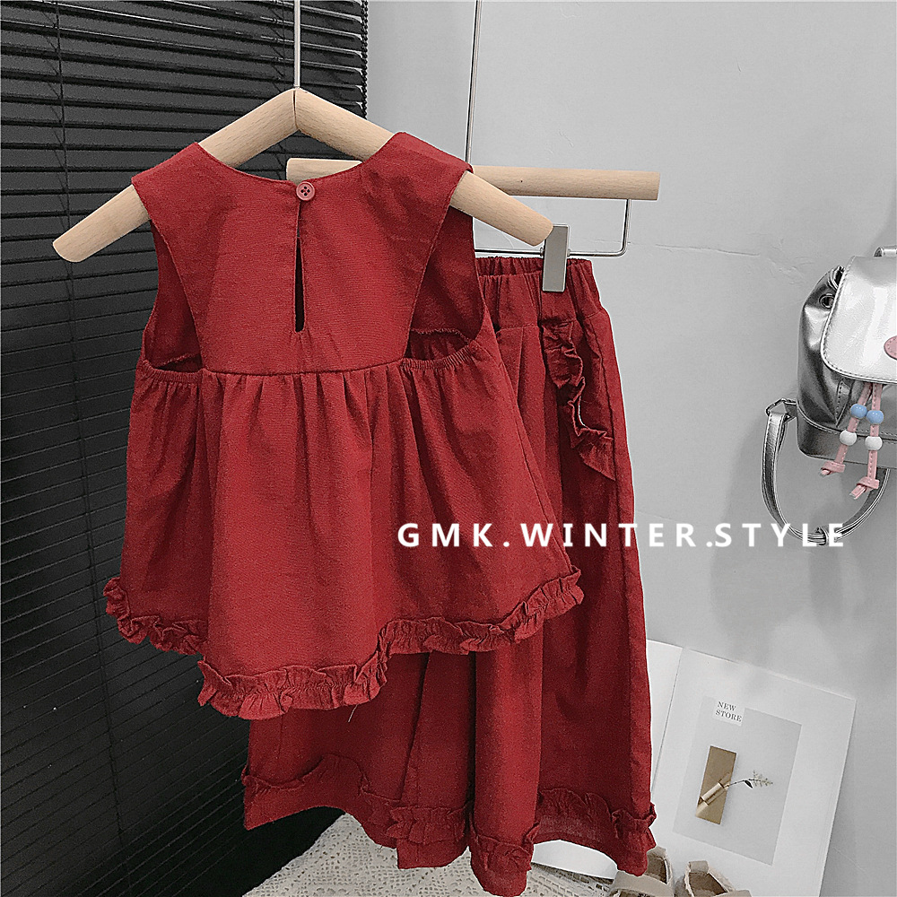 한국 아동복 소녀 여름 붉은 나무 귀 민소매 느슨한 꽃 바지 면 린넨 투피스 세트 유행 세트