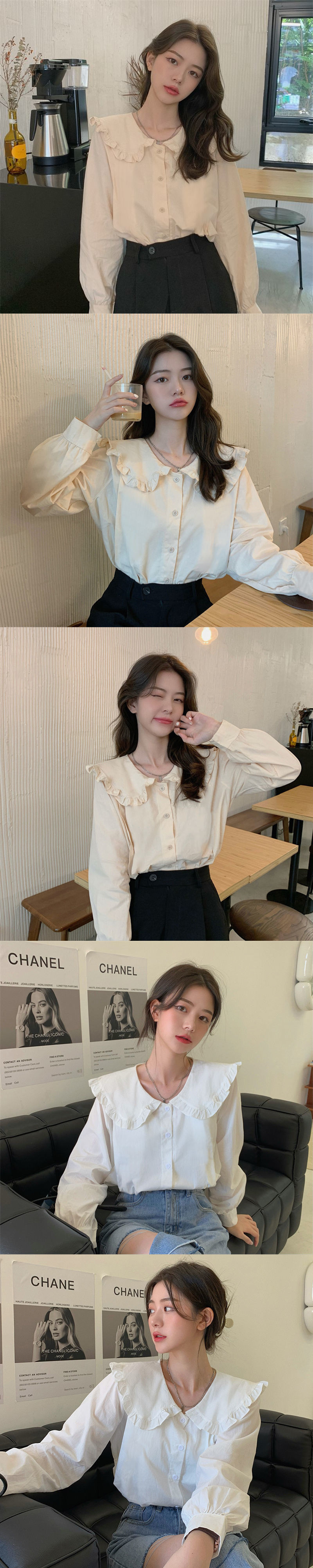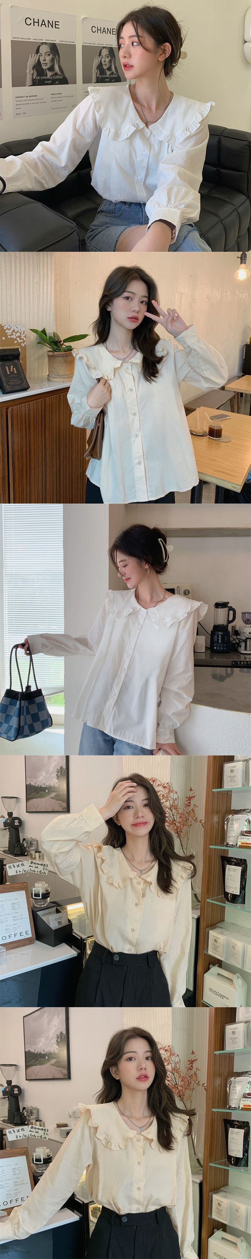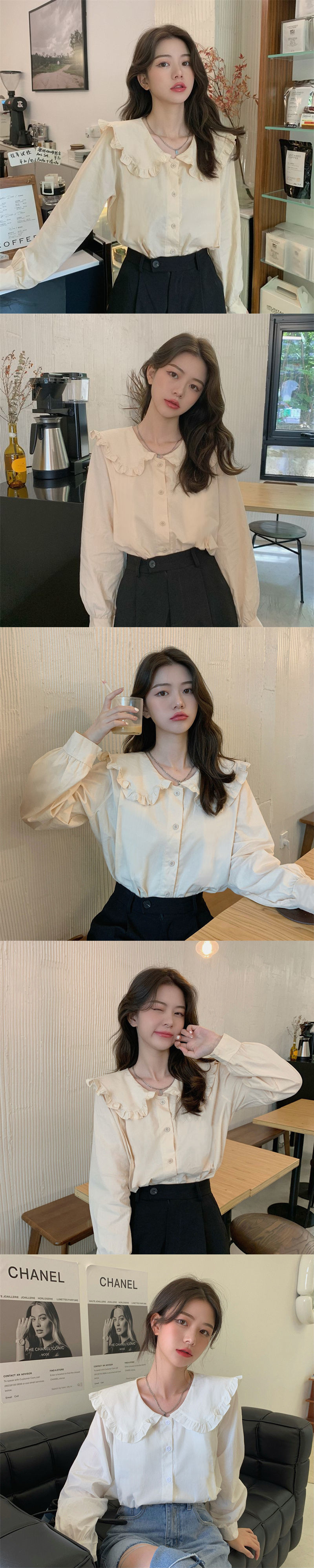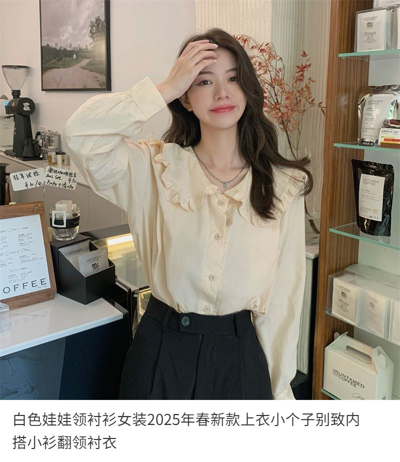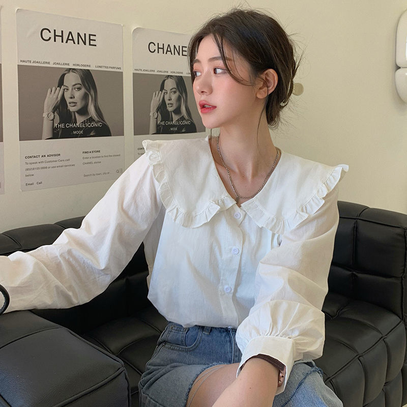여성을 위한 프렌치 화이트 인형 칼라 셔츠, 이른 봄 디자인의 틈새 셔츠, 시크한 긴팔 얇은 탑스토어 가기