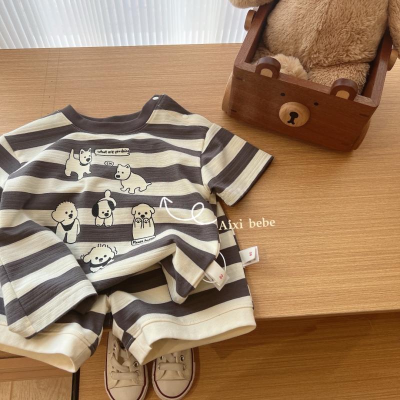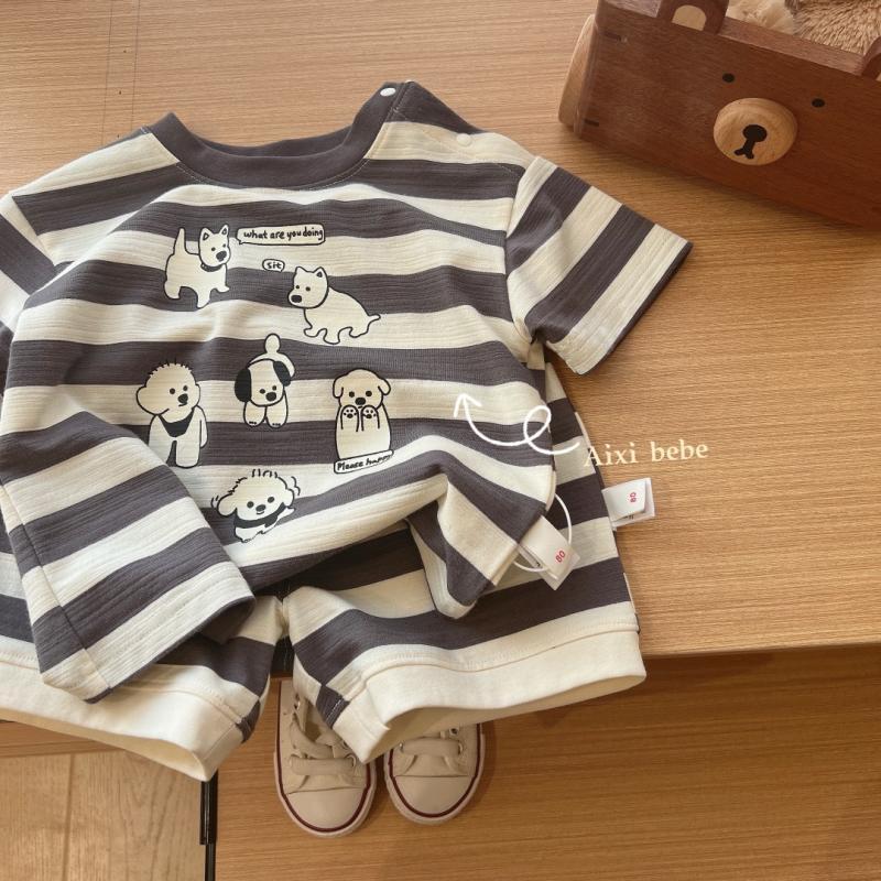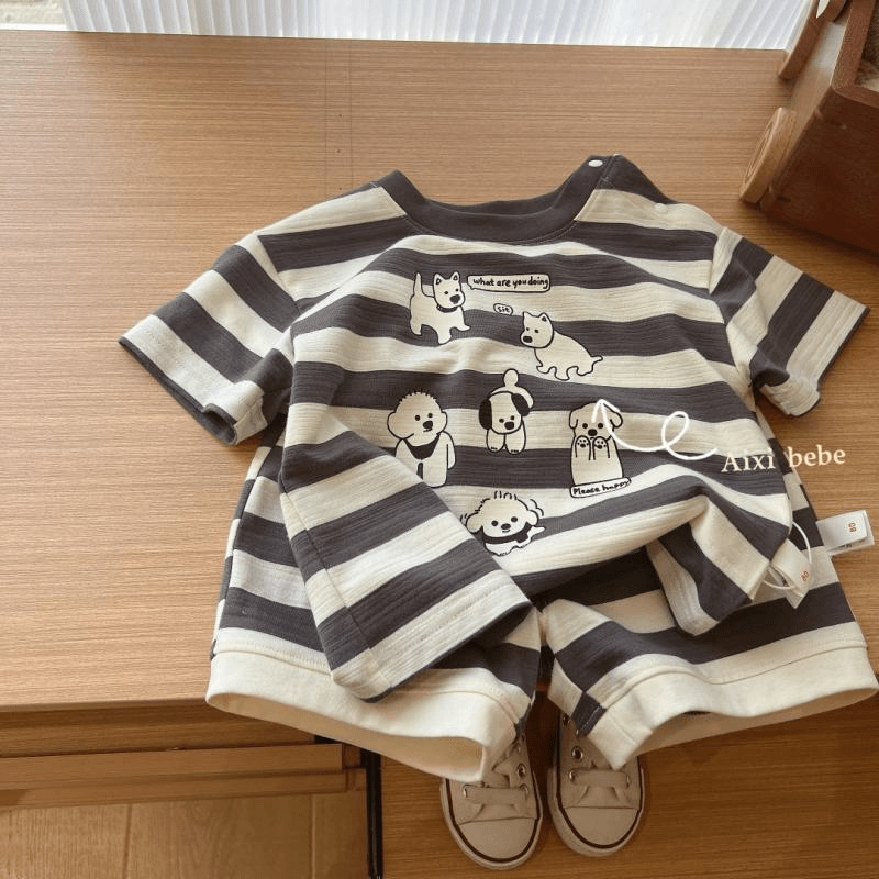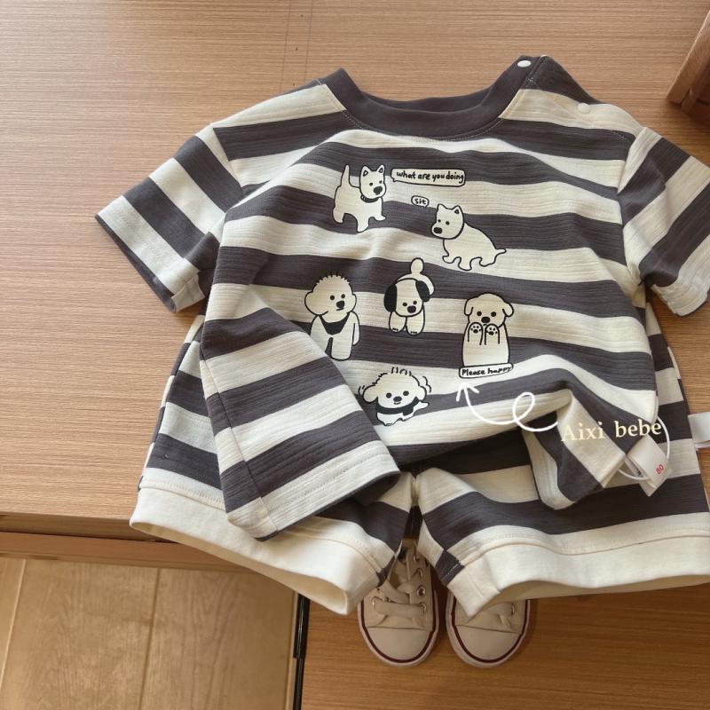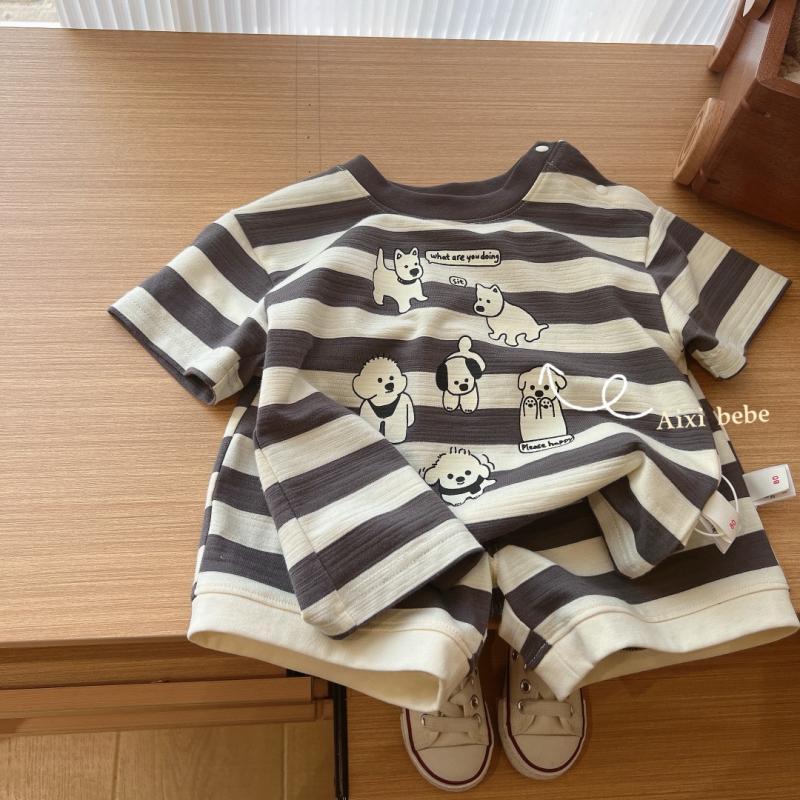 2025 어린이 여름 새 스타일 유아 소년 스트라이프 만화 인쇄 반팔 반바지 정장 귀엽고 세련된스토어 가기