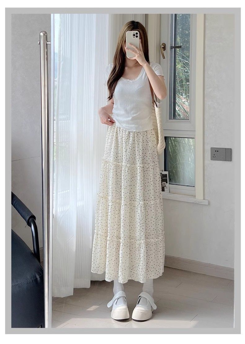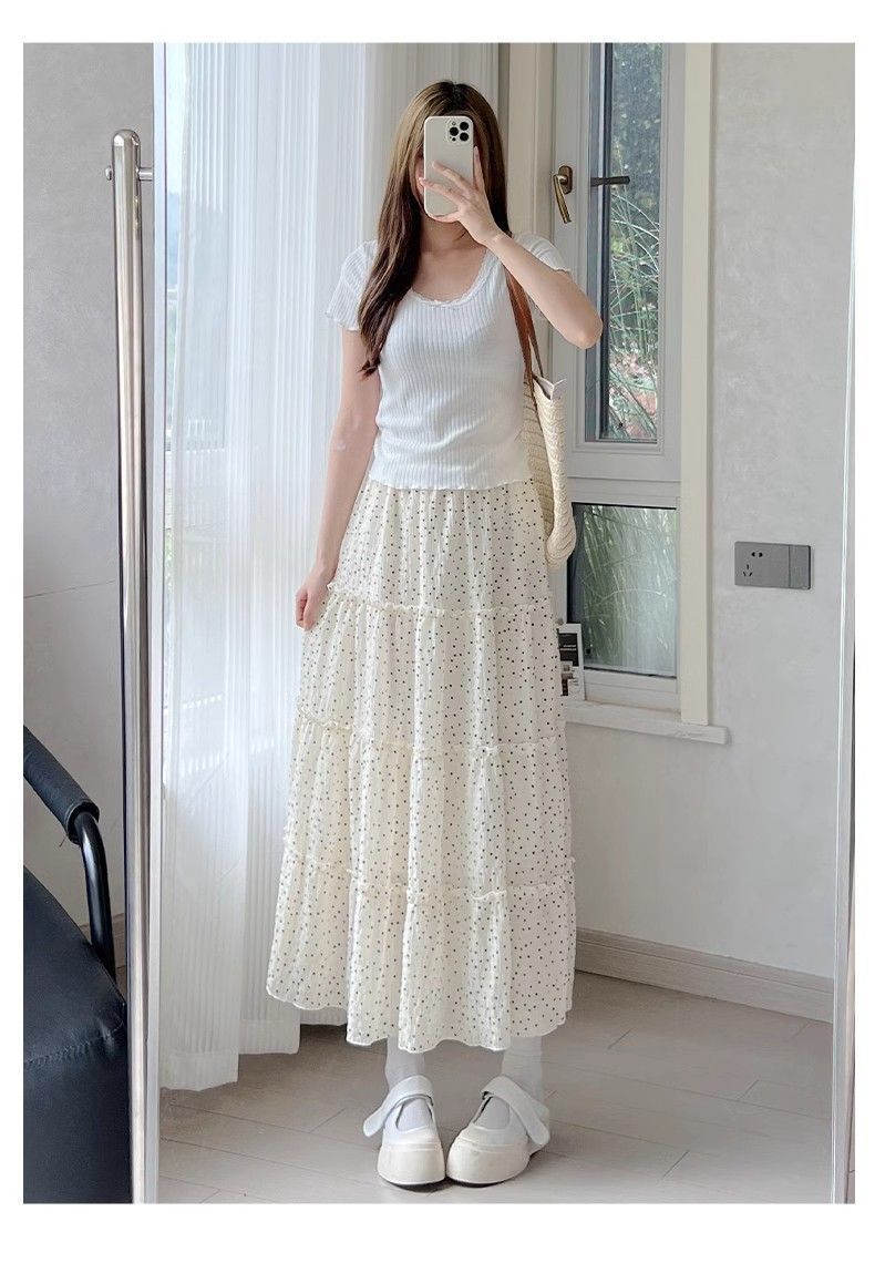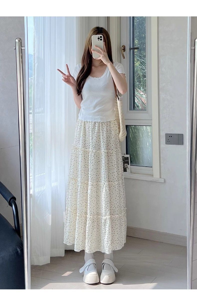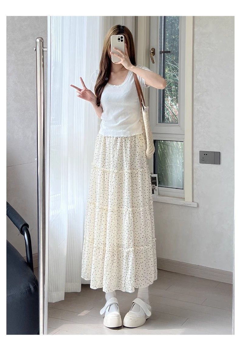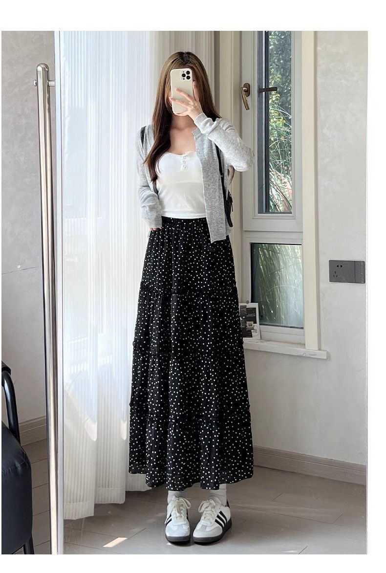 폴카 도트 케이크 스커트 여성 여름 2025 새로운 하이 웨이스트 a 라인 슬리밍 우산 스커트 화이트 스커트 블랙 스판덱스스토어 가기