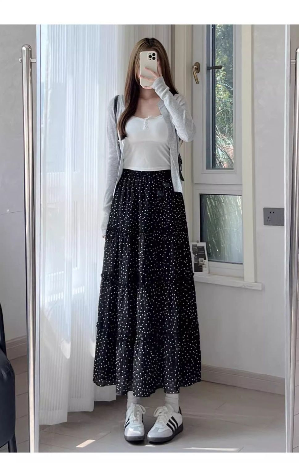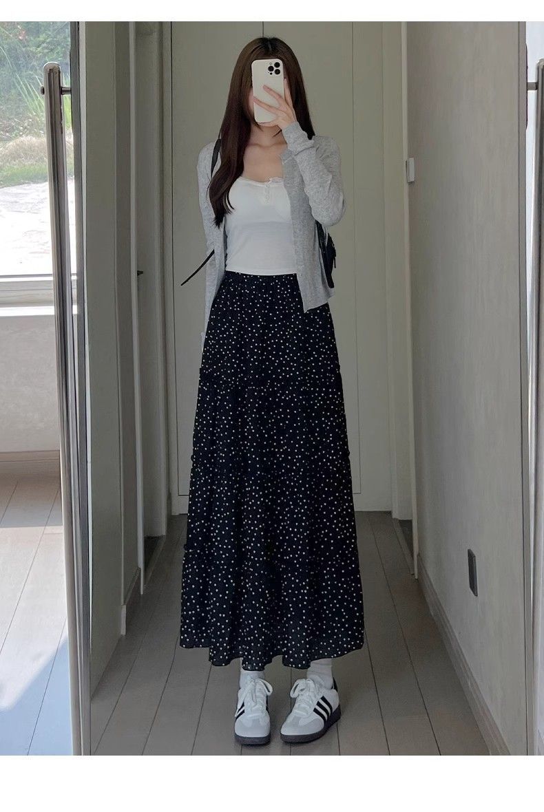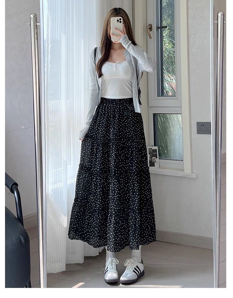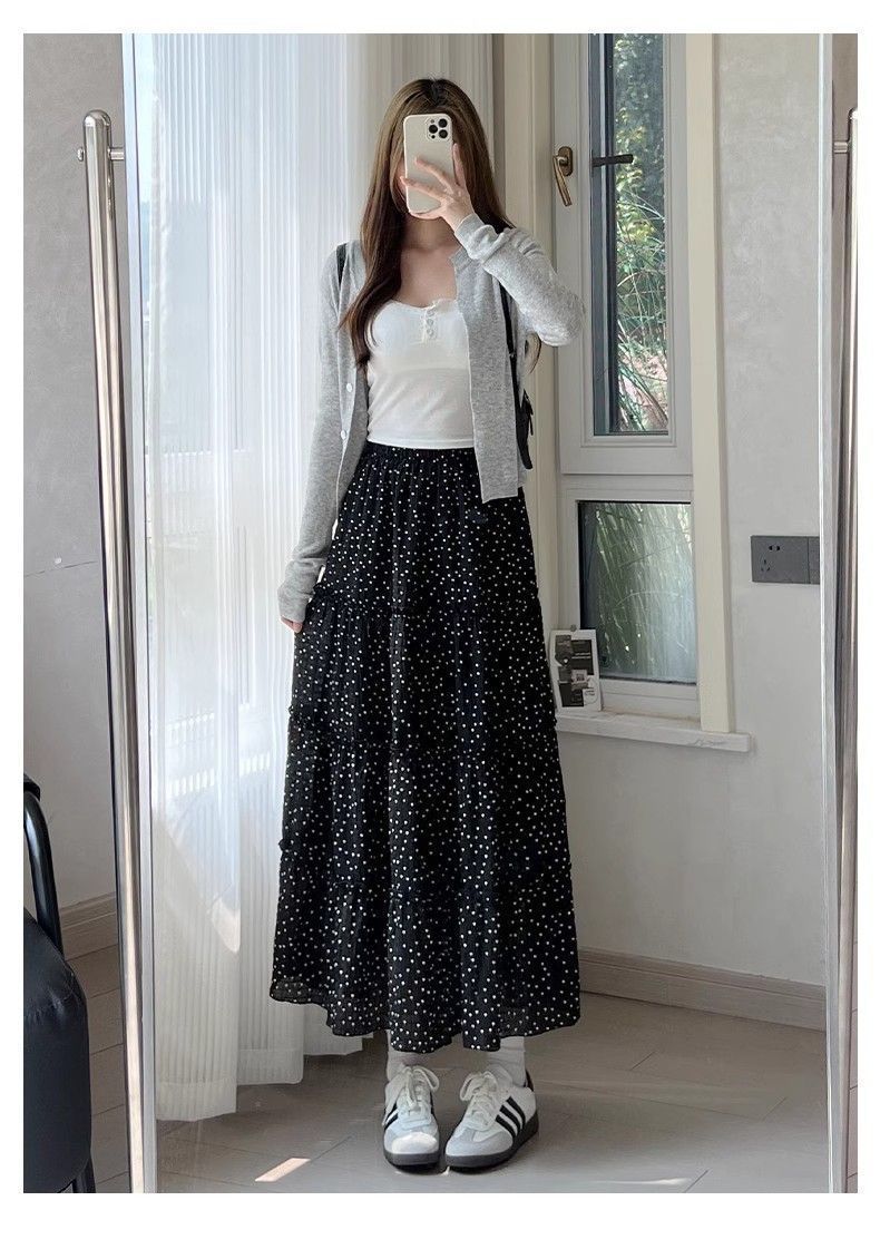 폴카 도트 케이크 스커트 여성 여름 2025 새로운 하이 웨이스트 a 라인 슬리밍 우산 스커트 화이트 스커트 블랙 스판덱스스토어 가기