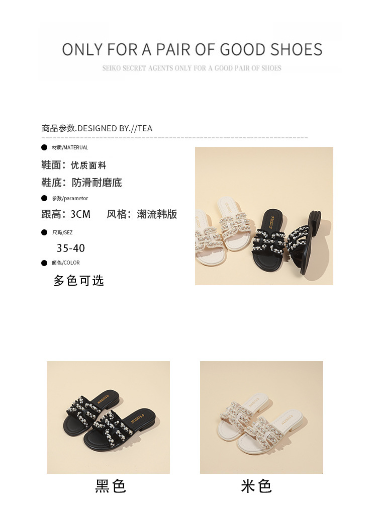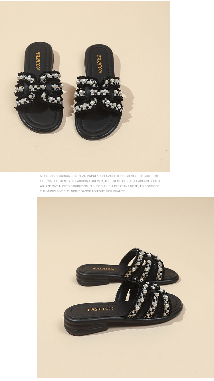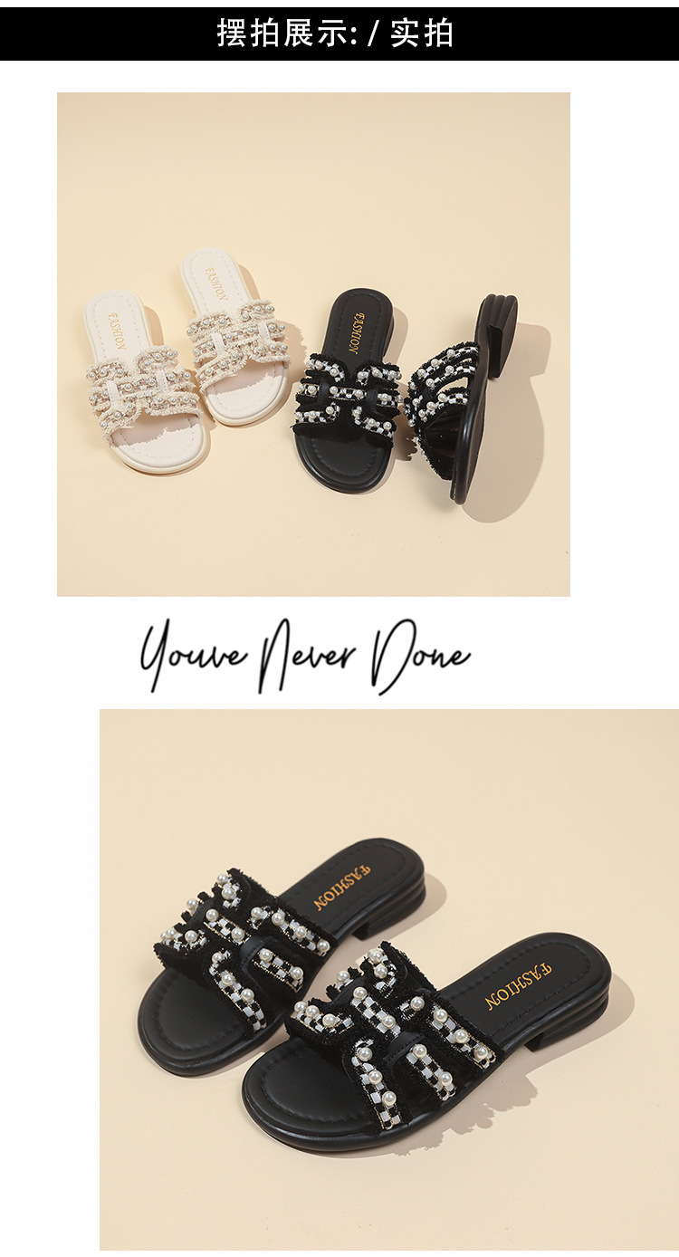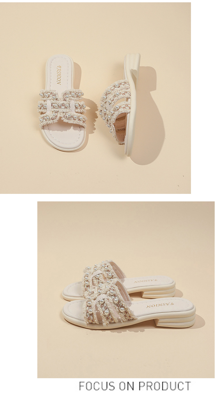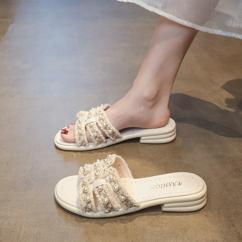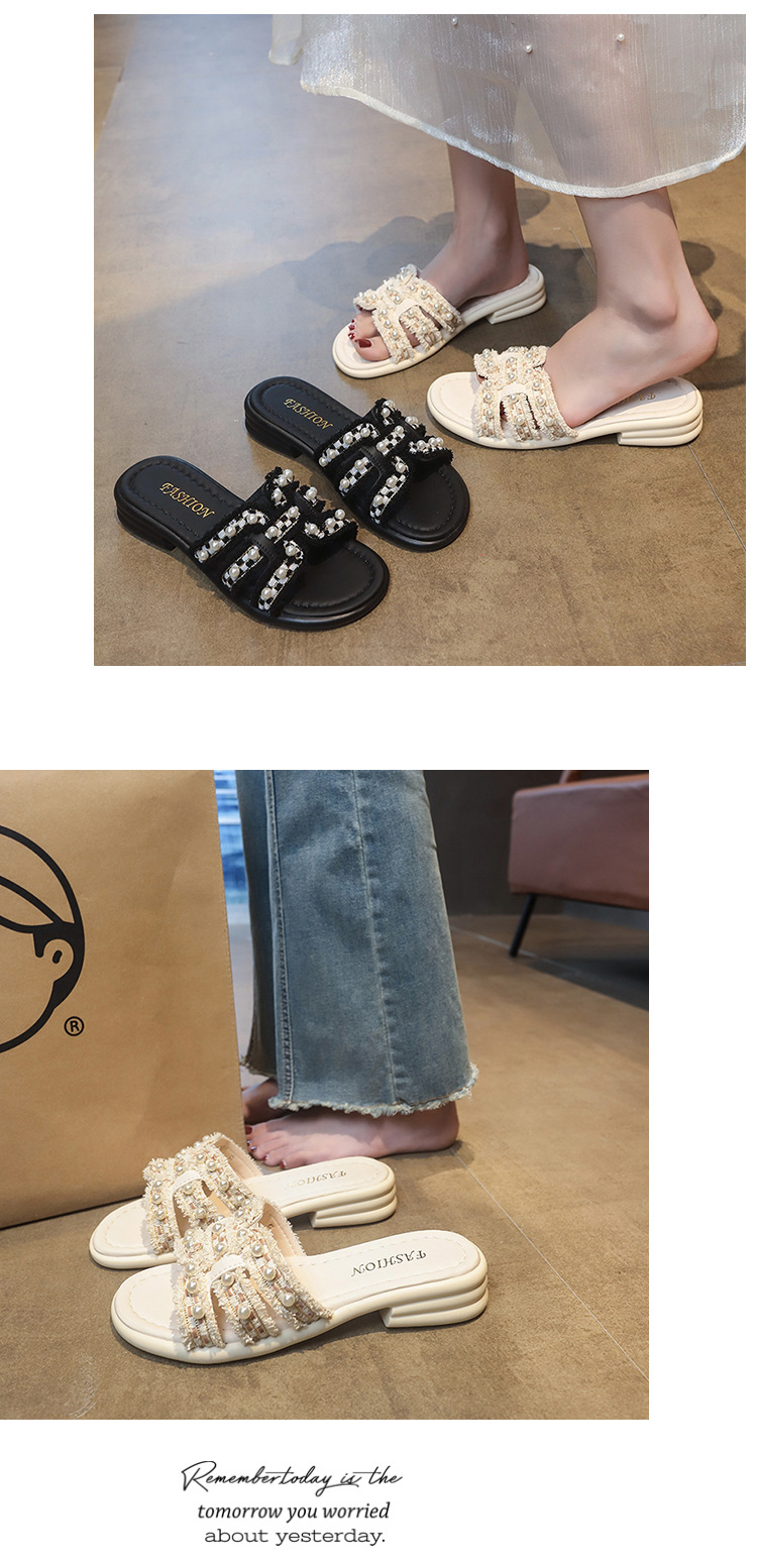 여성을위한 프랑스 플랫 진주 슬리퍼 여름 겉옷 2025 새로운 스타일 작은 향기로운 패션 부드러운 바닥 통기성 비치 샌들
