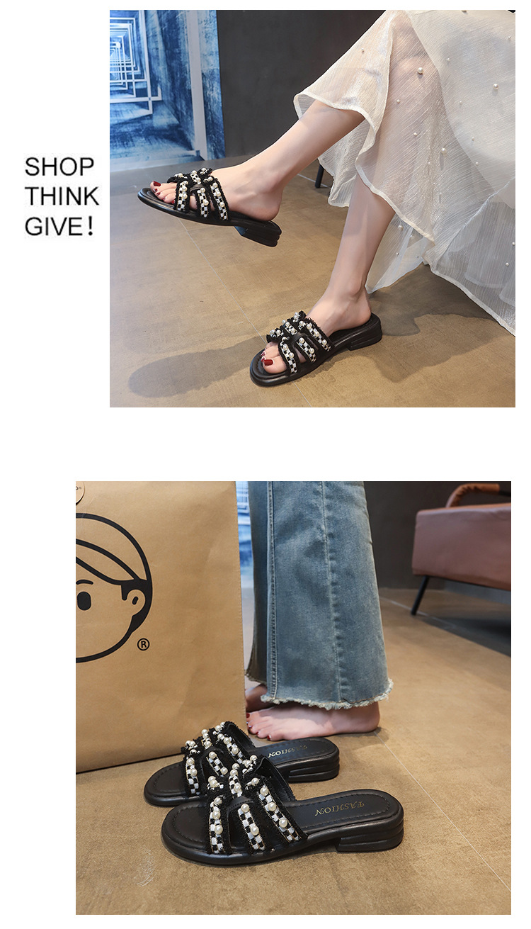 여성을위한 프랑스 플랫 진주 슬리퍼 여름 겉옷 2025 새로운 스타일 작은 향기로운 패션 부드러운 바닥 통기성 비치 샌들스토어 가기