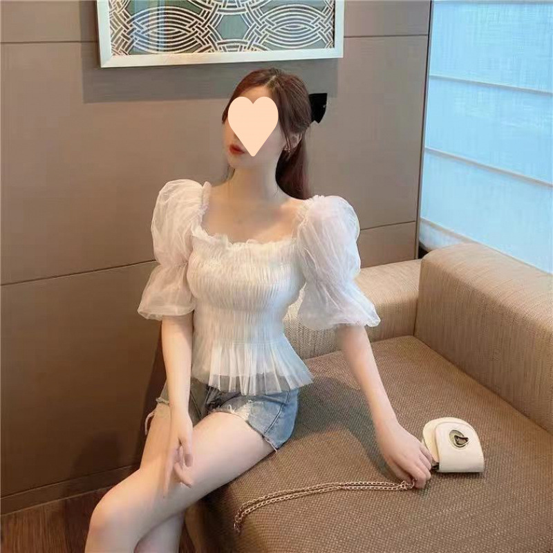 여성용 핑크 퍼프 슬리브 쉬폰 셔츠, 여름 메쉬 허리 슬림핏 원라인 스퀘어 넥, 니치 디자인의 멋진 탑스토어 가기