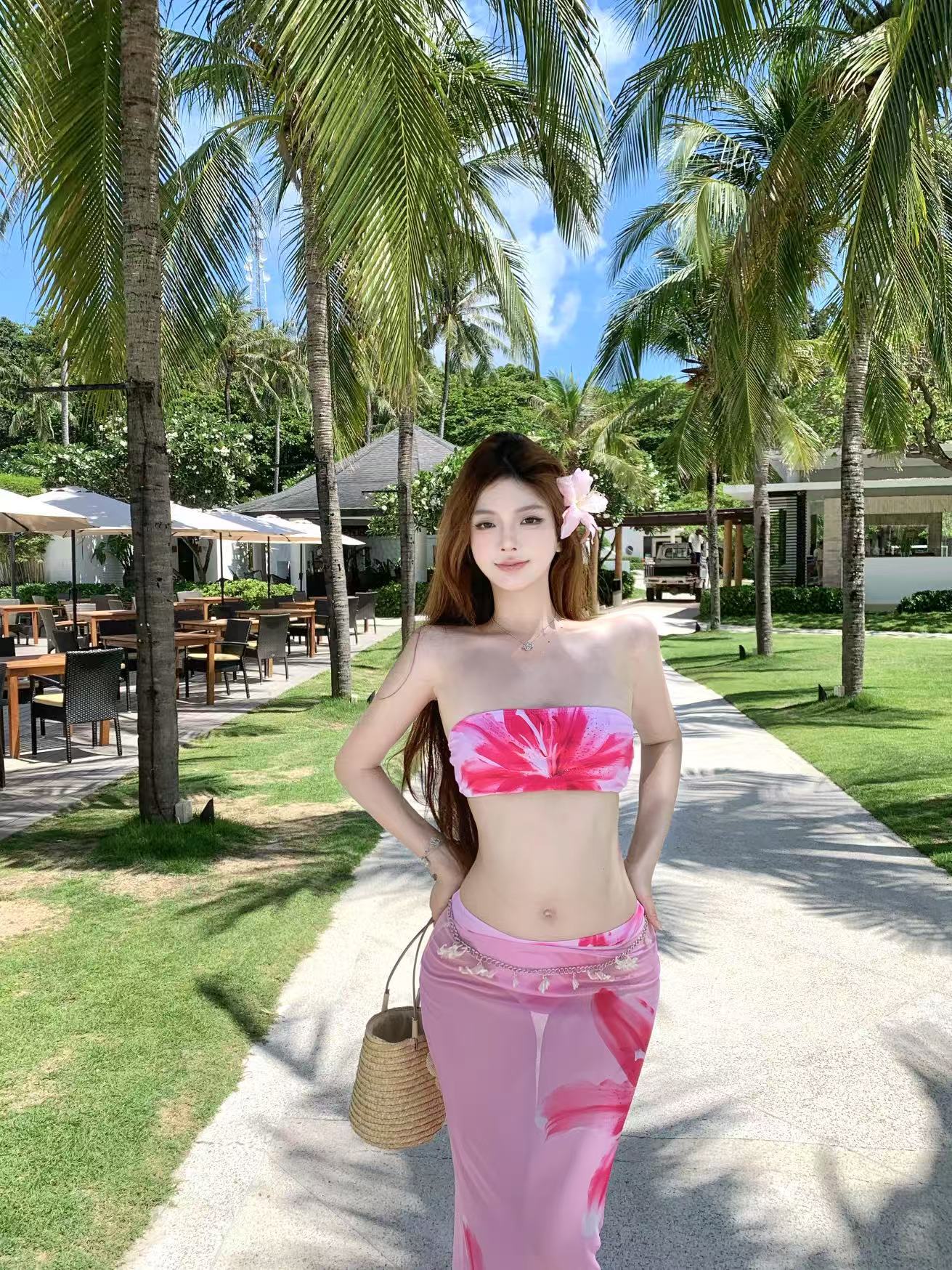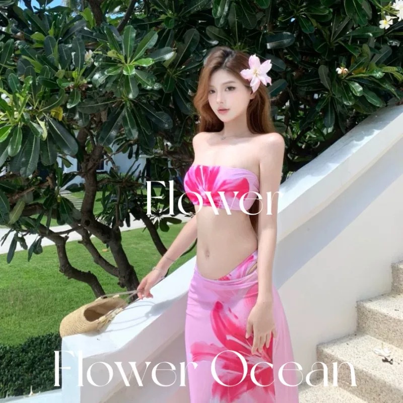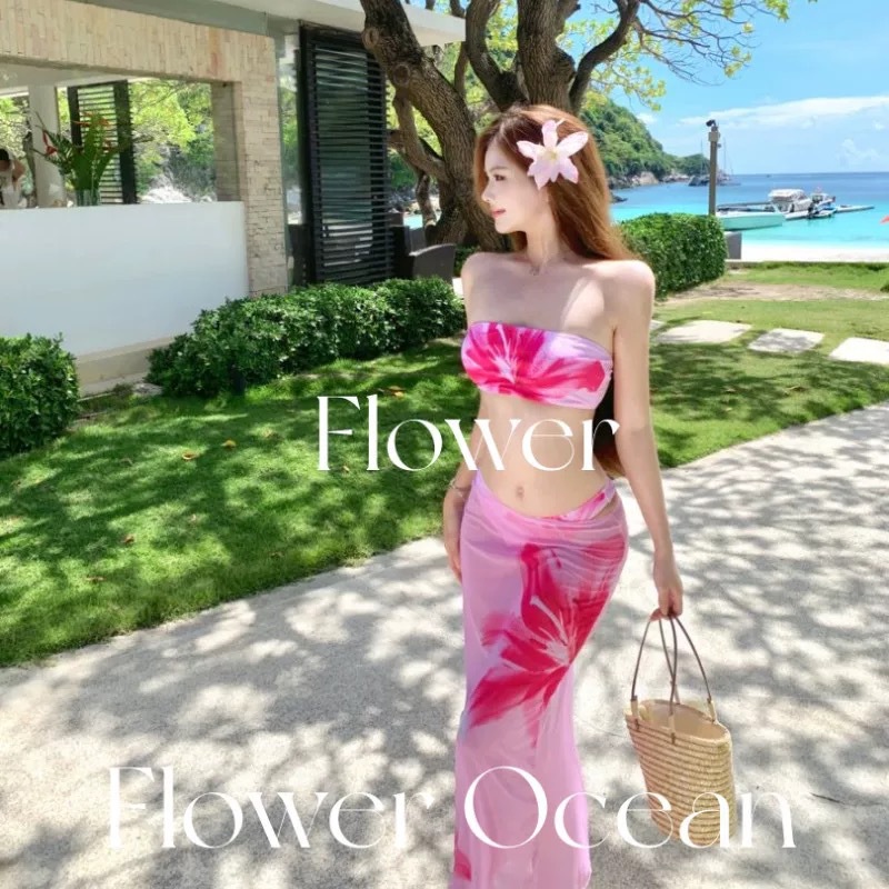 [복숭아 죽음] 핑크 순수한 섹시한 끈없는 꽃 쪼개진 수영복 3 피스 해변 휴일 원피스