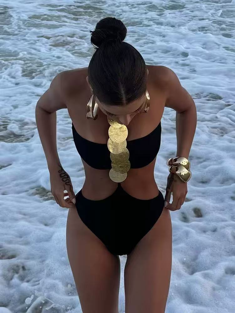 유럽과 미국의 블랙 스플릿 비키니 수영복 3 점 섹시 백리스 스트랩 수영복 대외 무역 국경 수영복