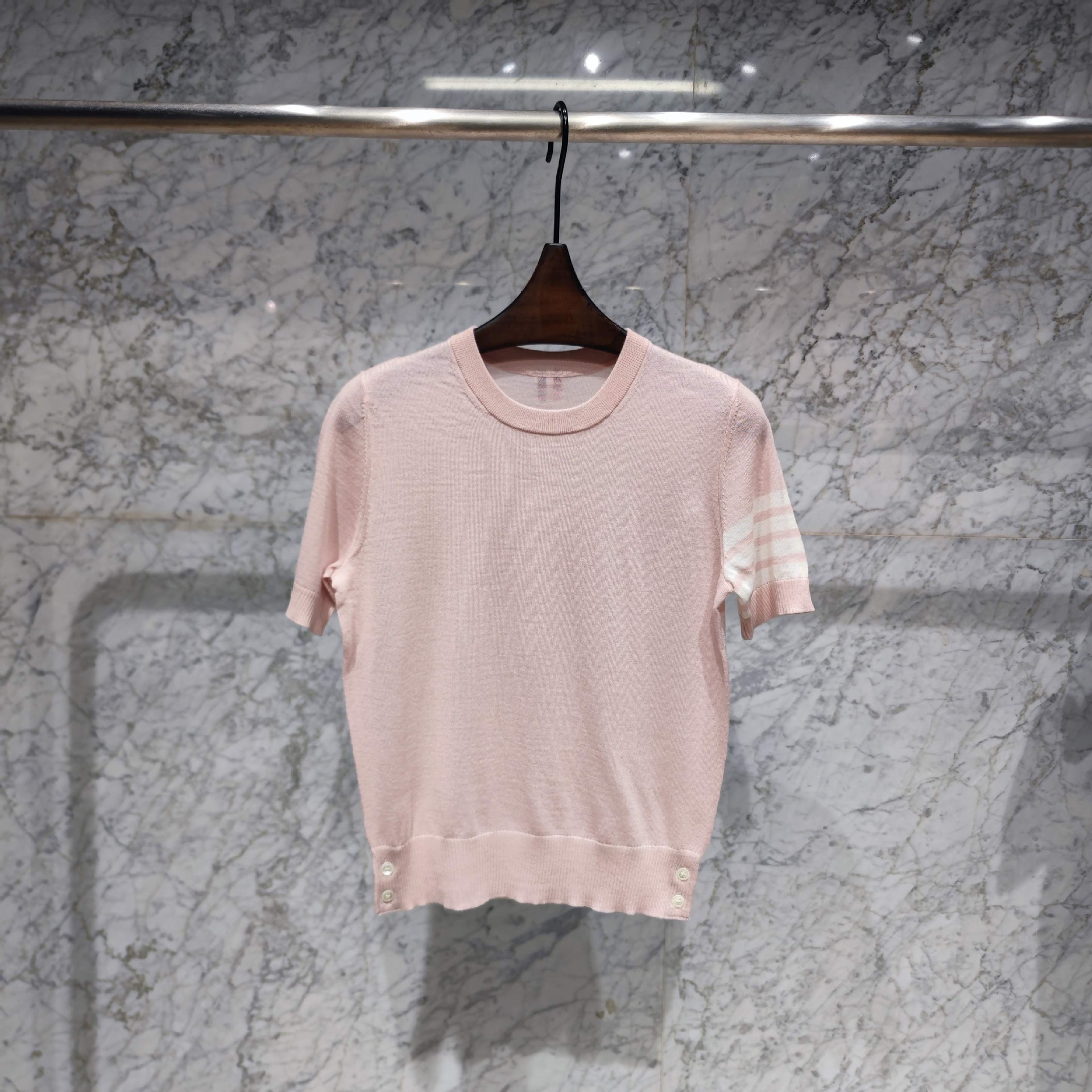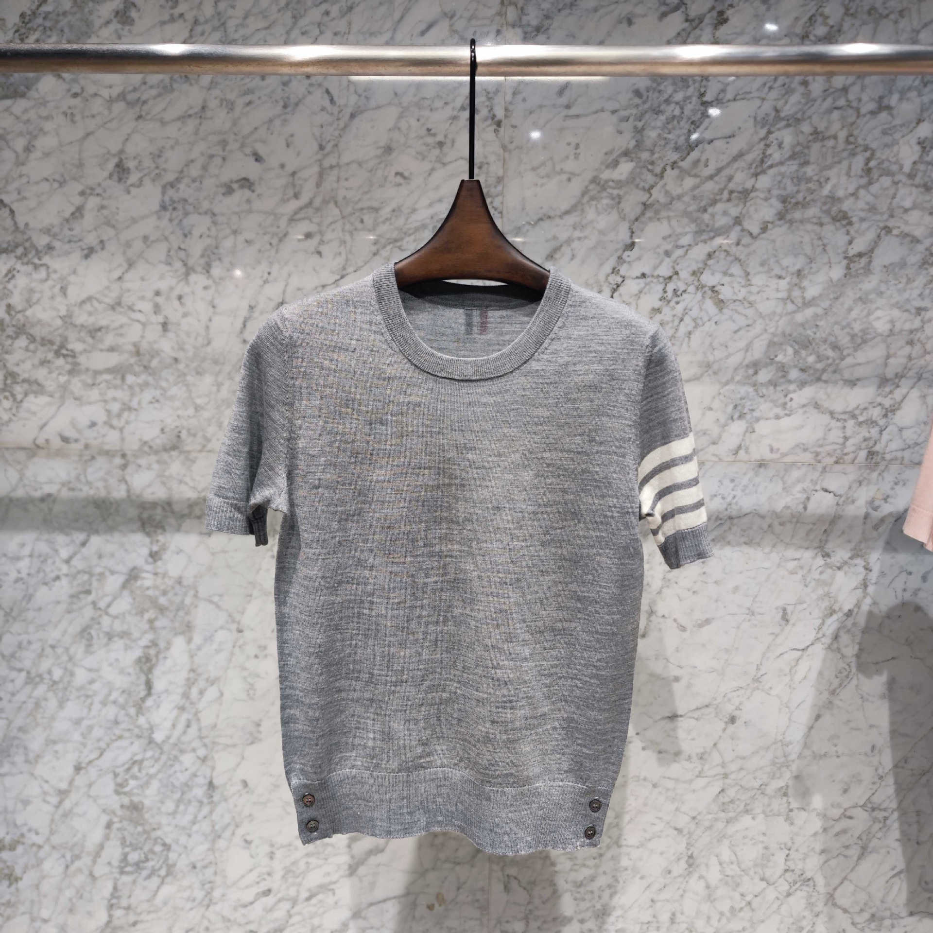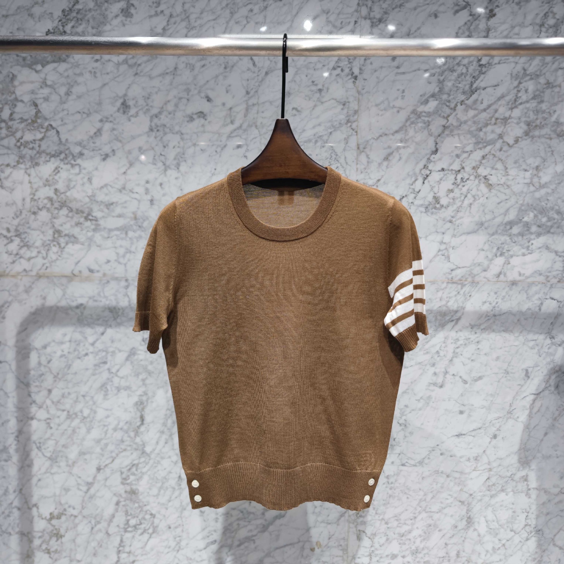 25ss tb 스타일 니트 반팔 팔 4 바 스웨터 라운드 넥 스웨터 여성용 고급 모조 울스토어 가기