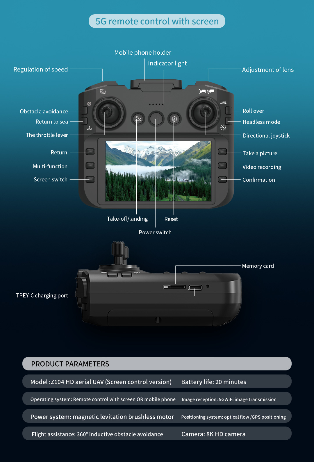 국경 Z104 원격 제어 GPS UAV 쿼드 콥터 화면 디스플레이 HD 항공 사진 자동 복귀 장애물 회피 항공기