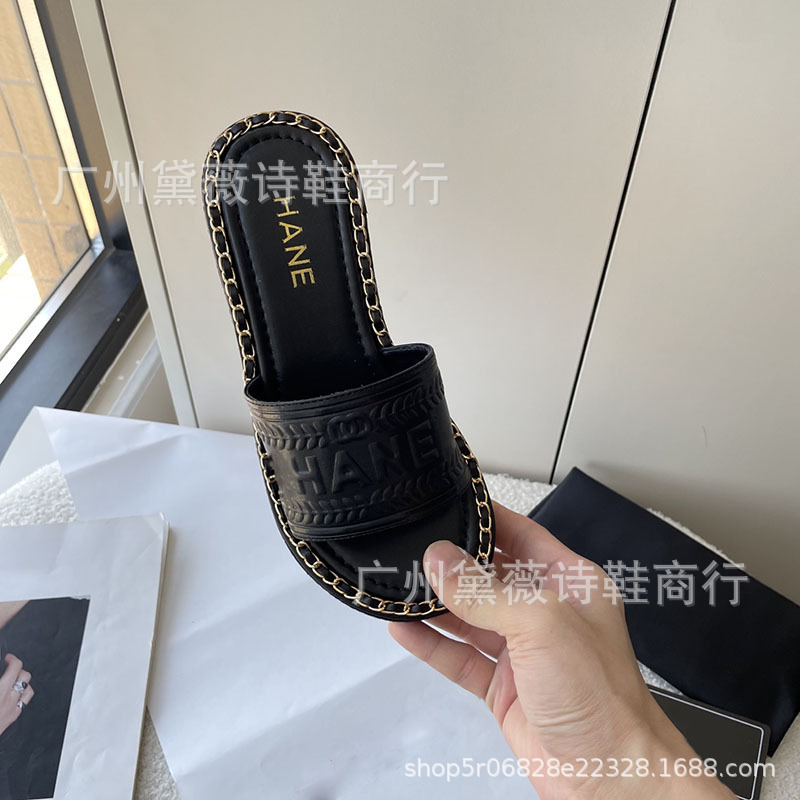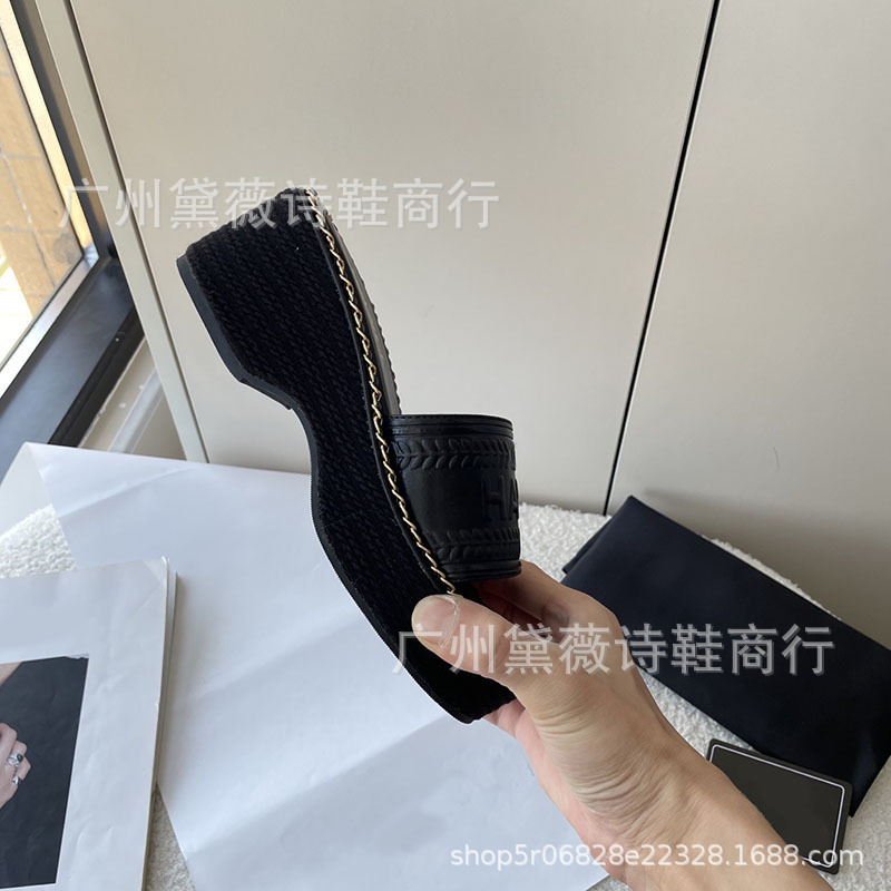 2025 새로운 캐주얼 작은 향기 니트 밀짚 두꺼운 밑창 웨지 힐 여성용 아우터웨어 높이 증가 체인 비치 슬리퍼스토어 가기
