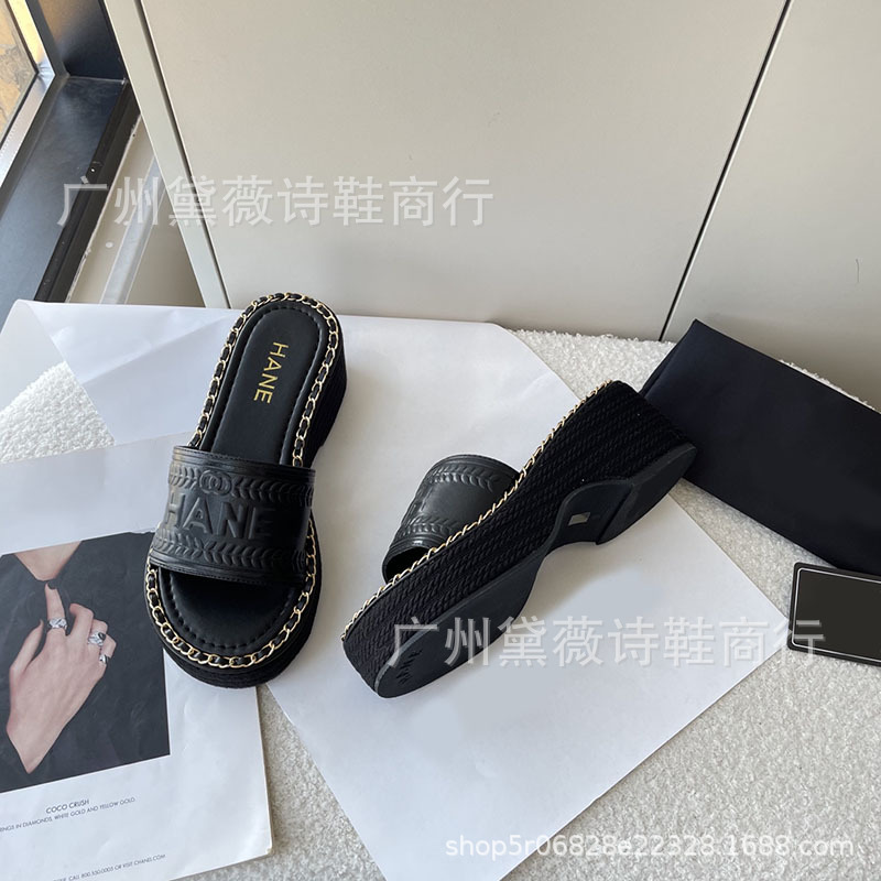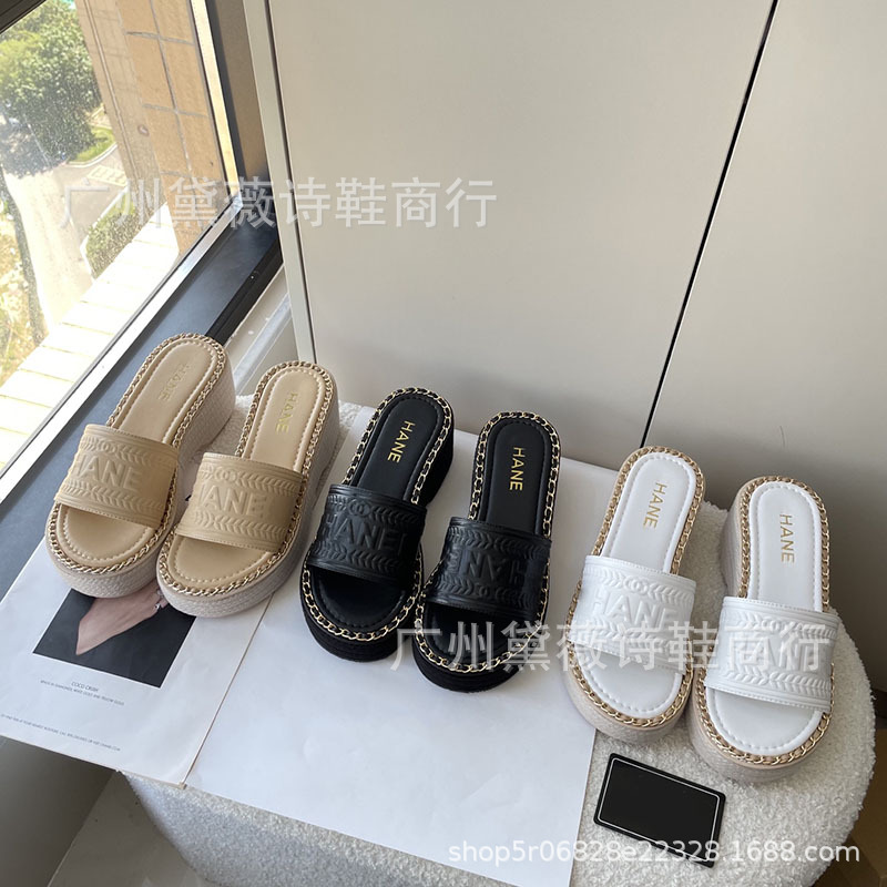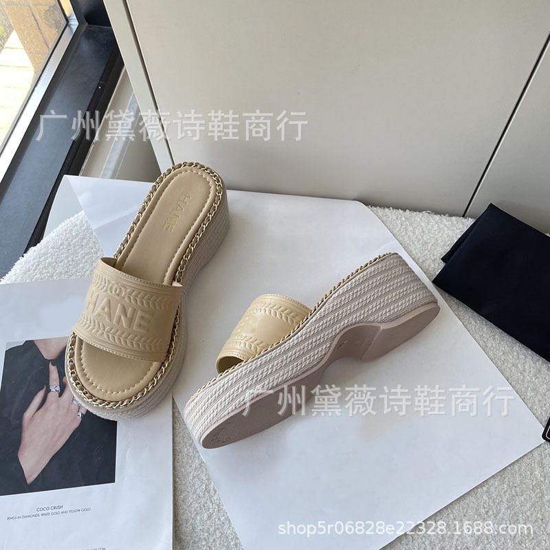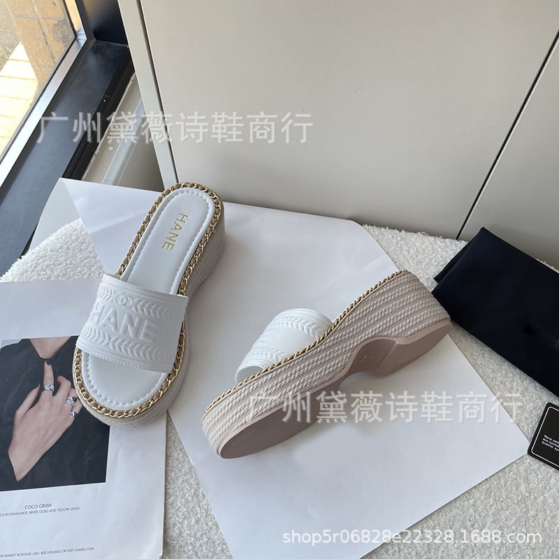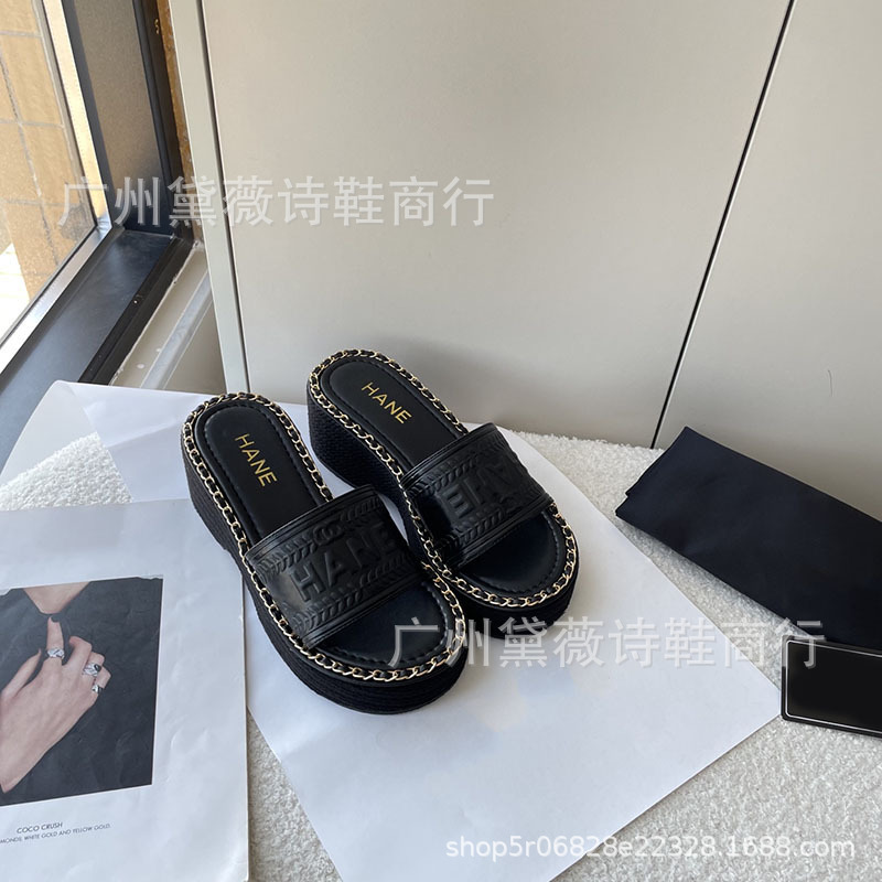 2025 새로운 캐주얼 작은 향기 니트 밀짚 두꺼운 밑창 웨지 힐 여성용 아우터웨어 높이 증가 체인 비치 슬리퍼