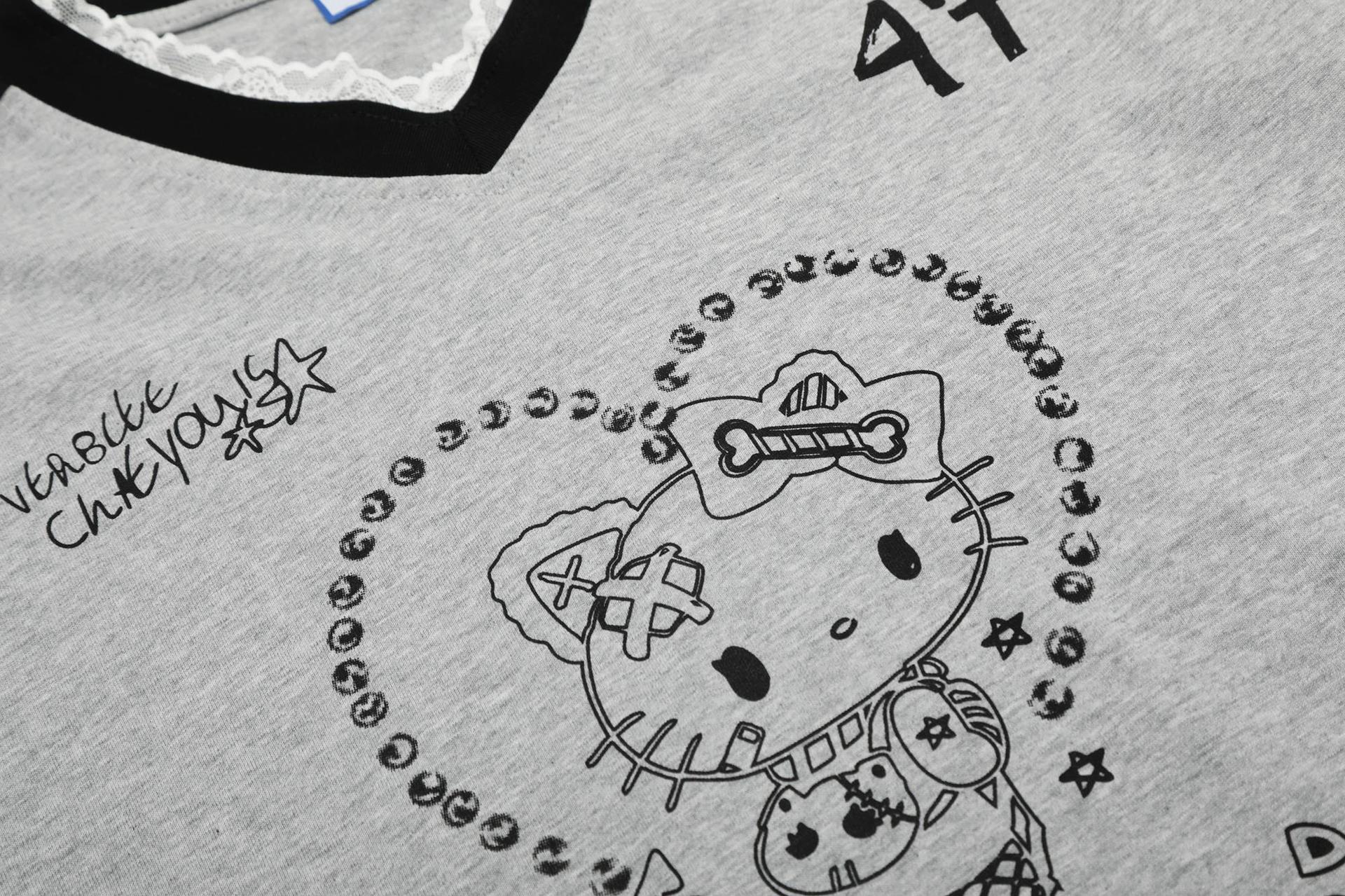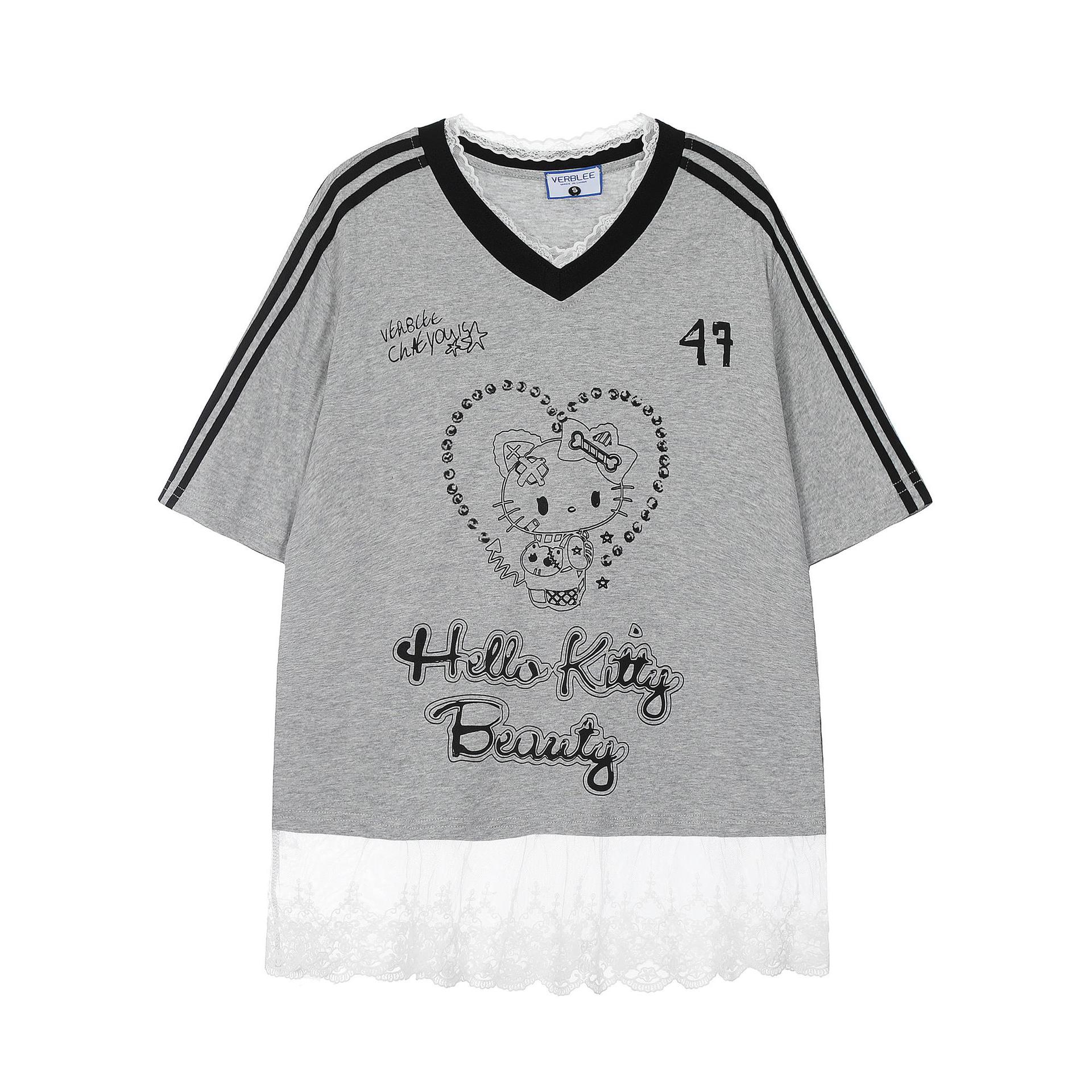 미국식 헬로키티 페이크 투피스 레이스 바느질 반팔 티셔츠 남녀 V 넥 루즈 스타일 커플의 반소매 탑