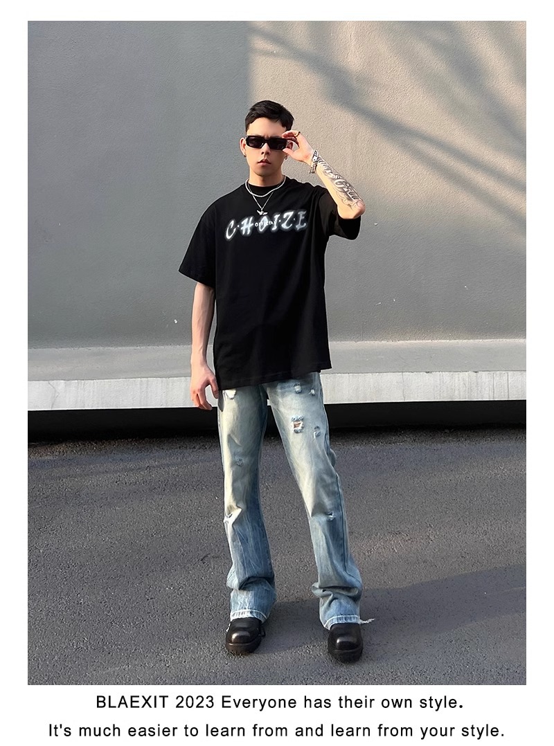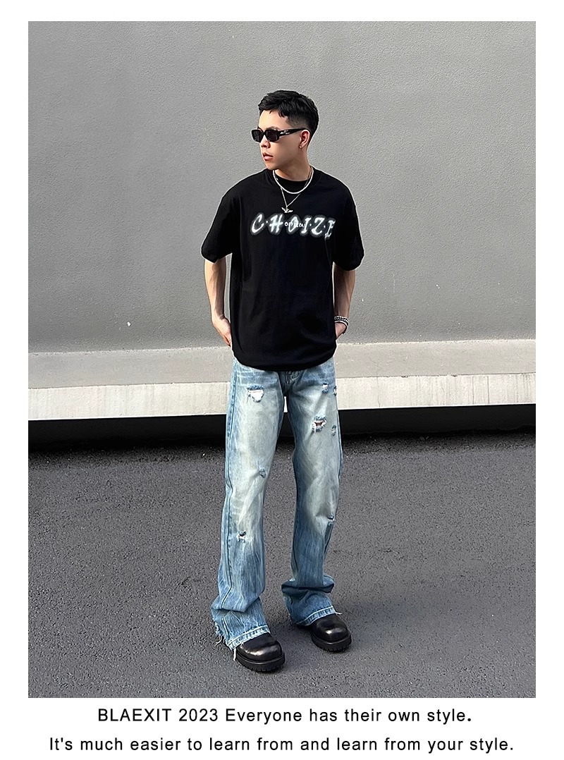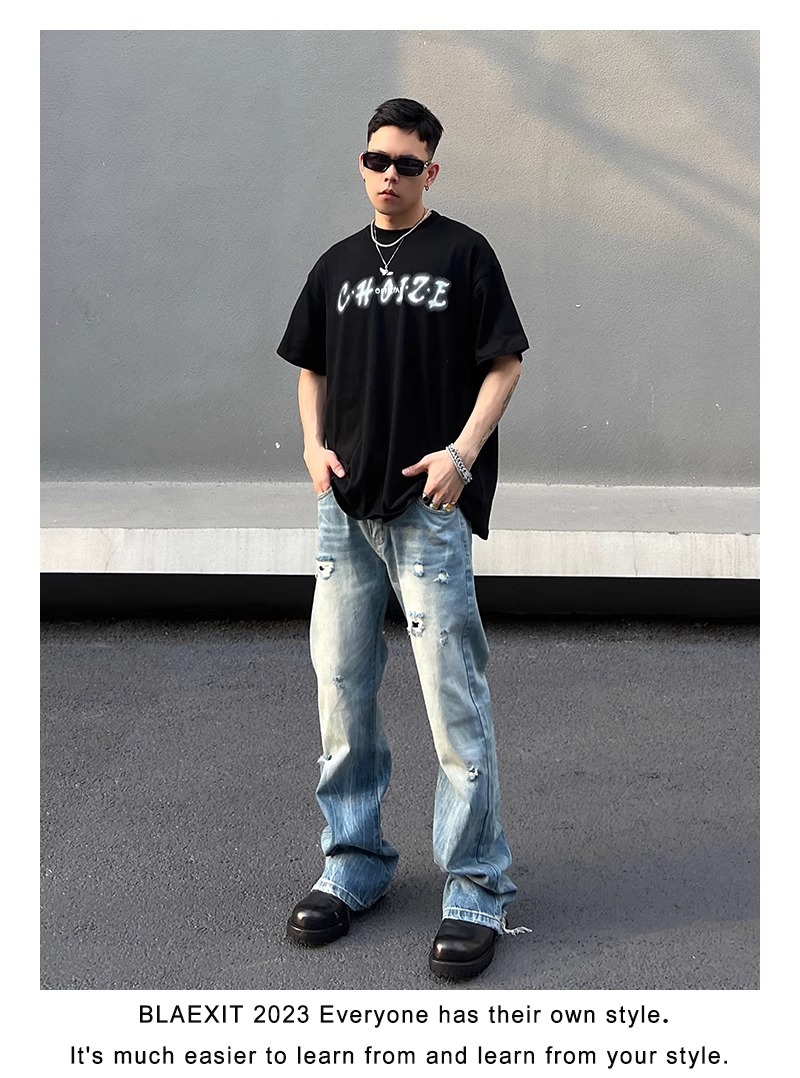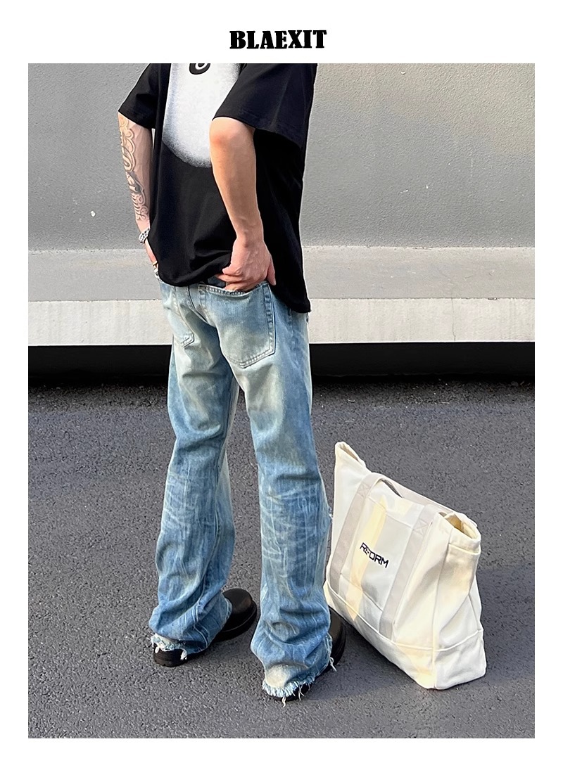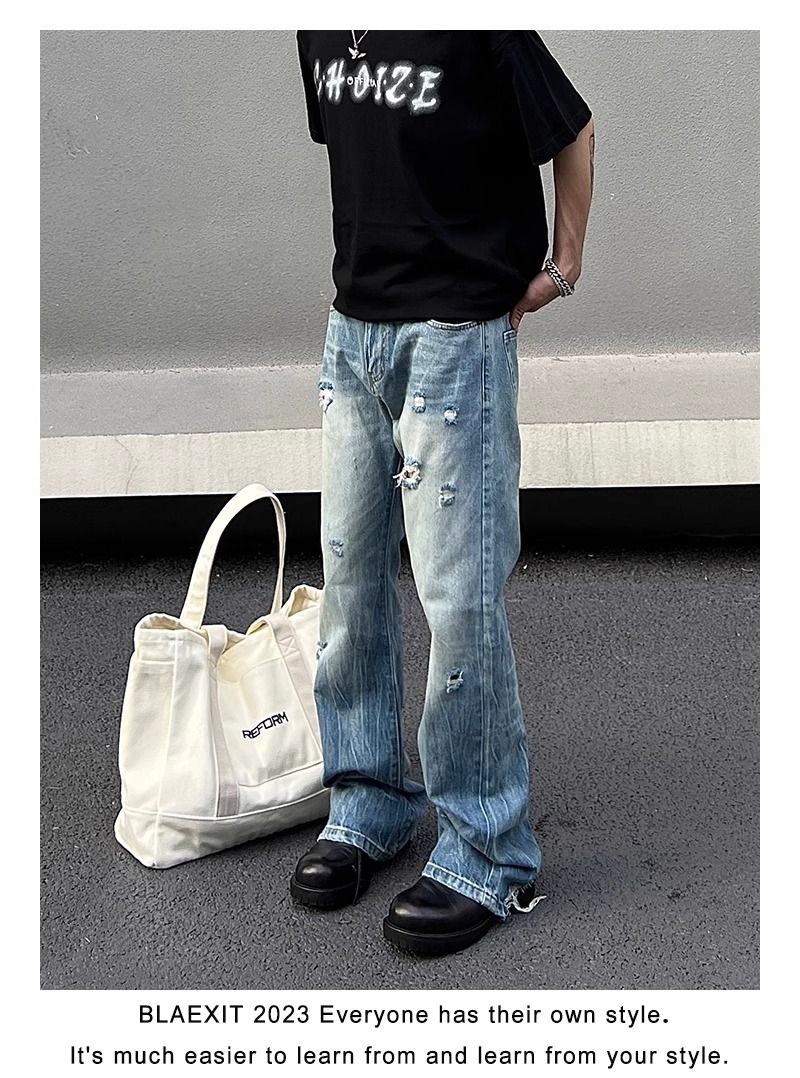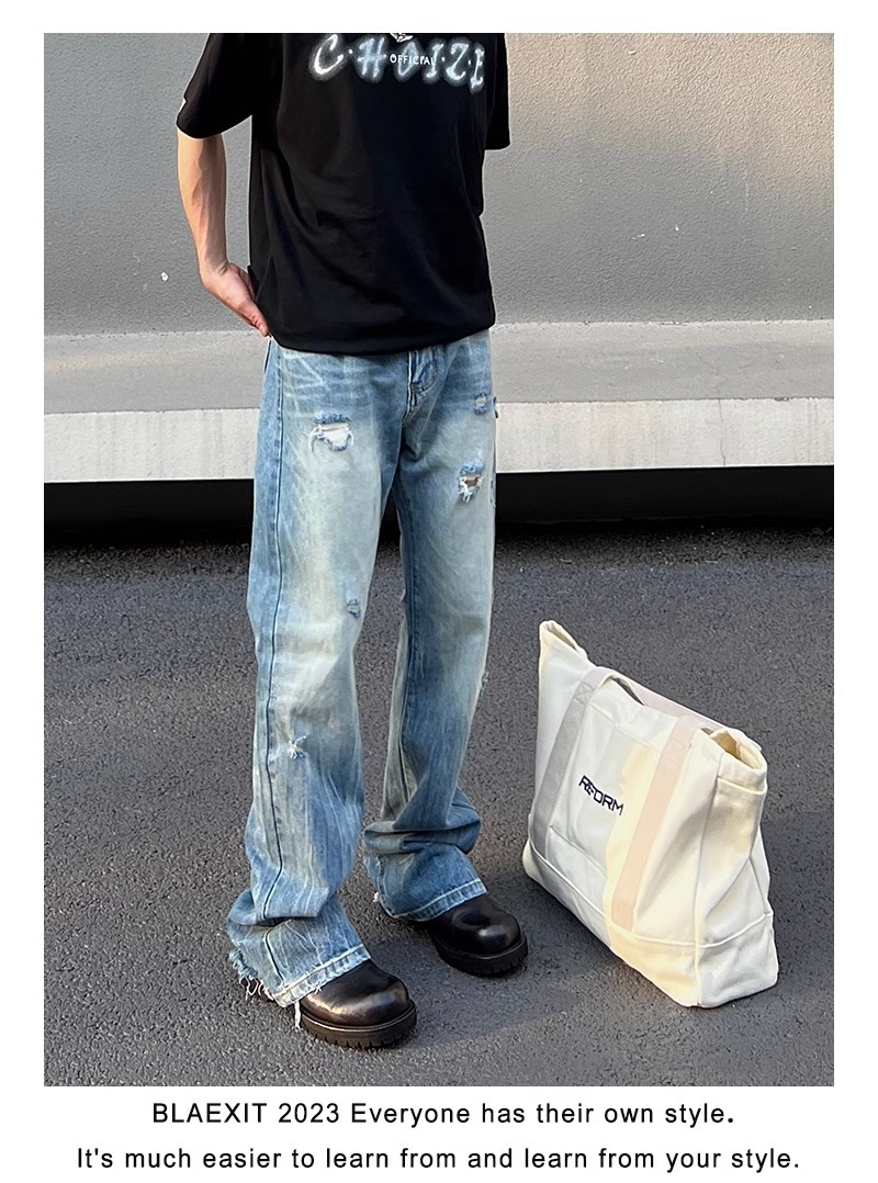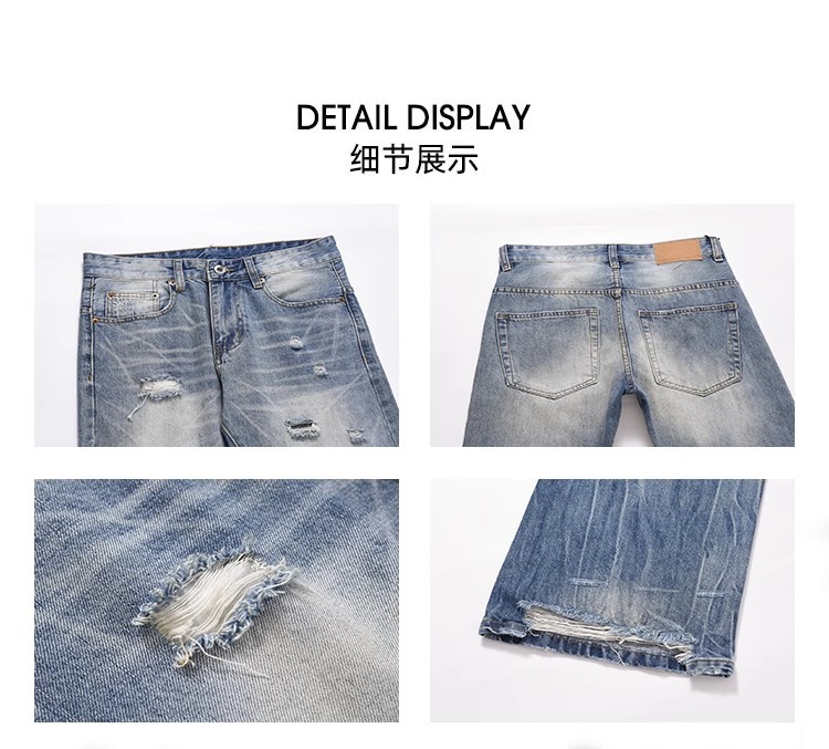 아메리칸 하이 스트리트 2025 뉴 워싱 라이트 블루 찢어진 청바지 남성 여름 스트레이트 캐주얼 청바지 트렌드스토어 가기