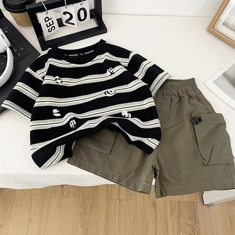 소년 여름 옷 세트 2025 새로운 어린이 줄무늬 짧은 소매 여름 옷 아기 소년 패션 풀오버 인쇄